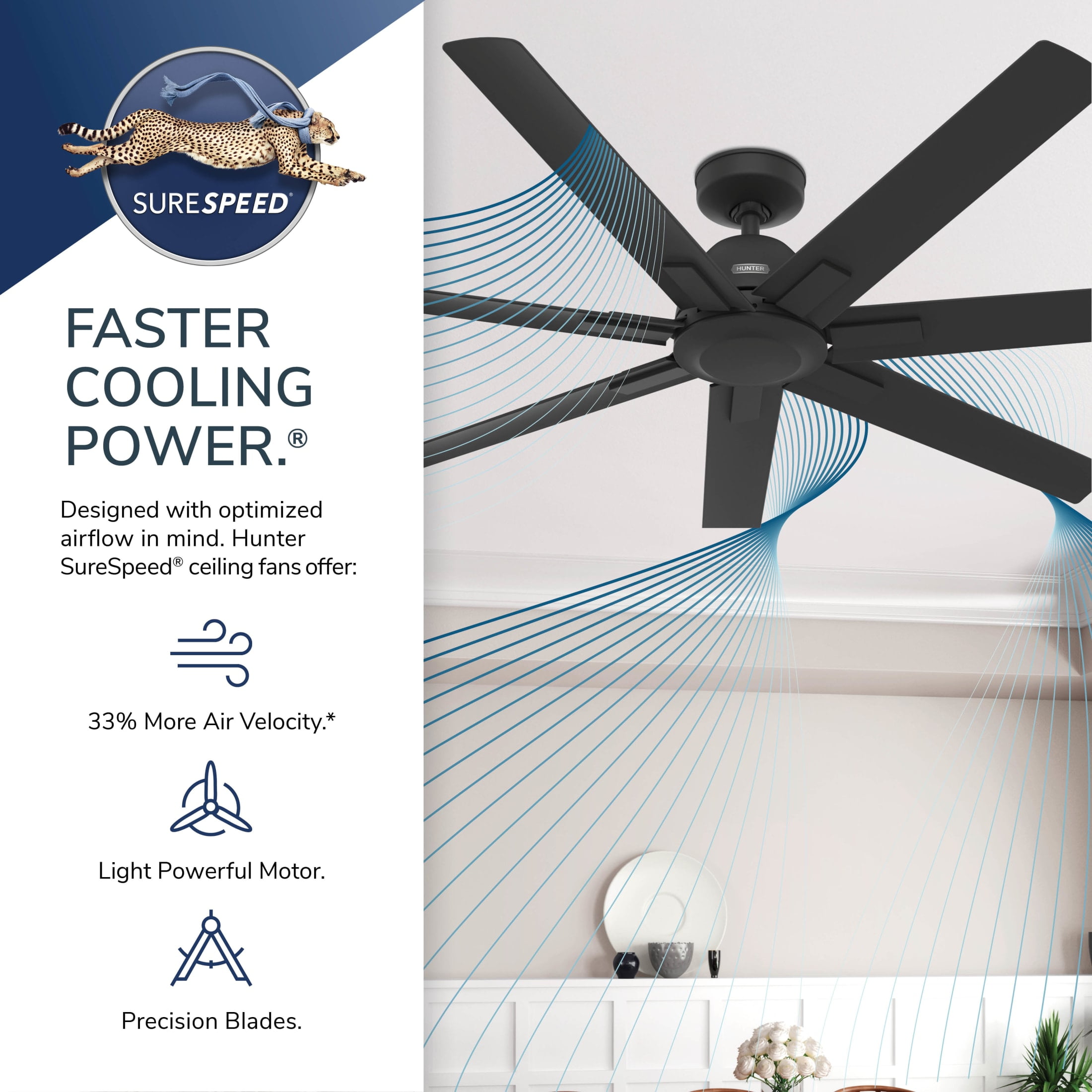 THE DOWNTOWN: A larger-sized, industrial ceiling fan perfect for your covered patio / porch, bonus room / game room, living room / great room DIGITAL MANUAL: Installation made easy with Hunter’s 3D InterActive Guide—just scan the QR code for quick setup CLEARLY BRIGHTER: TrueLight™ products are designed for modern bulbs that provide illumination and efficiency so you get the perfect brightness, every time ENERGY EFFICIENT: Hunter’s ENERGY STAR® certified ceiling fans are 64% more efficient on average than conventional fans while helping you save you money on cooling costs PREMIUM CONTROL: Wall control included for easy adjustments right from the wall of your choice AIRFLOW: Strong airflow up to 8363 cubic feet per minute (CFM) on high speed DAMP RATED: This fan is ETL rated for indoor or outdoor use in spaces exposed to moisture and humidity such as porches, patios, sunrooms, and bathrooms but not direct exposure to water LONGEVITY: Hunter performs twice the agency recommended testing to ensure their ceiling fans – from the finishes to the fan motor your Hunter will stand the test of time, over 500 hours of quality testing, comfort and cooling, droop free blades WARRANTY: Limited Lifetime Motor Warranty is backed by the only company with over 135 years in the fan business DOWNROD: Includes a single 6-inch downrod to ensure proper distance from the ceiling and optimize air movement WINTER AND SUMMER: Reversible motor allows you to change the direction of your fan from downdraft mode during the summer which helps cool the room to updraft mode during the winter to help circulate trapped warm air near the ceiling BLADE PITCH: 13-degree blade pitch optimized to ensure ideal air movement and peak performance