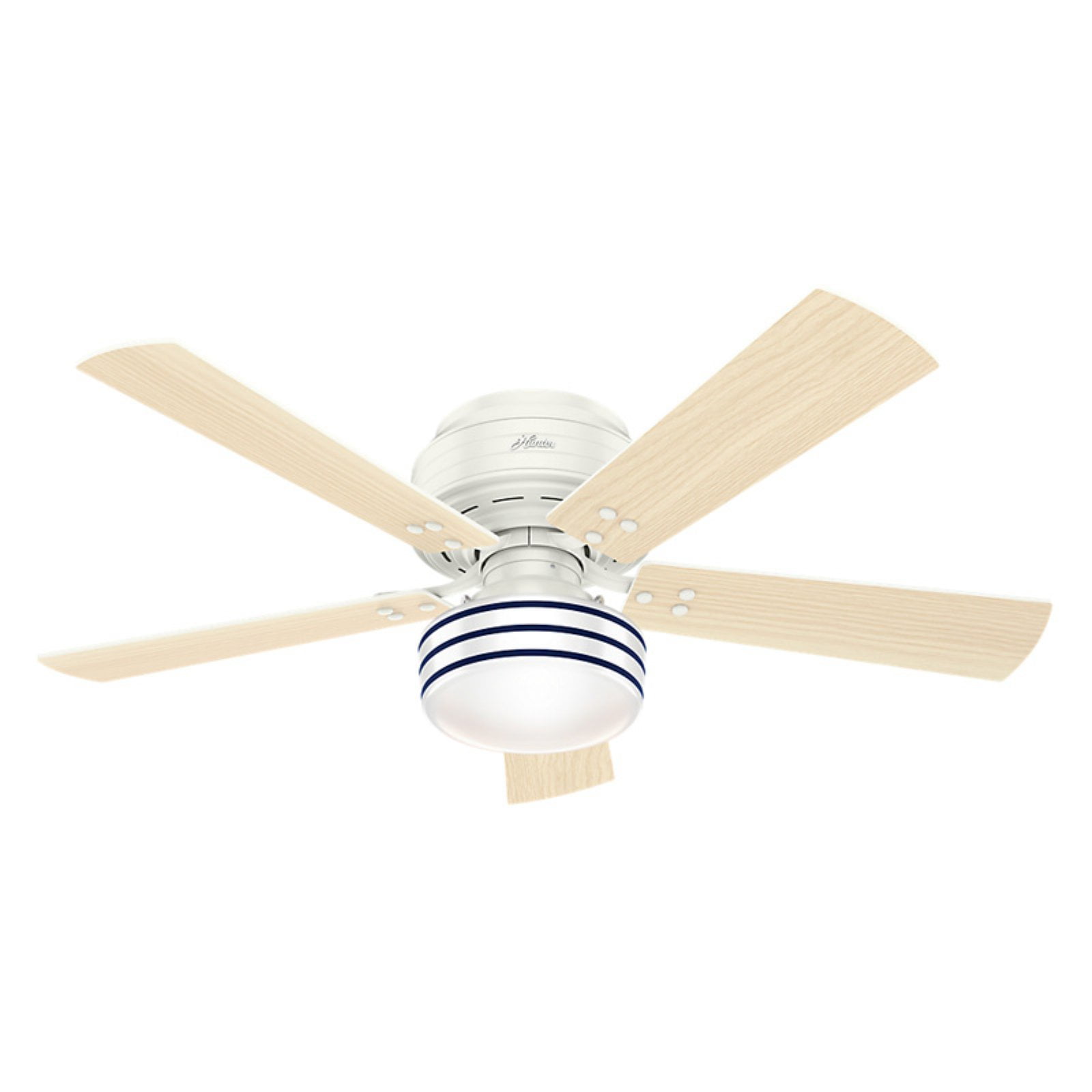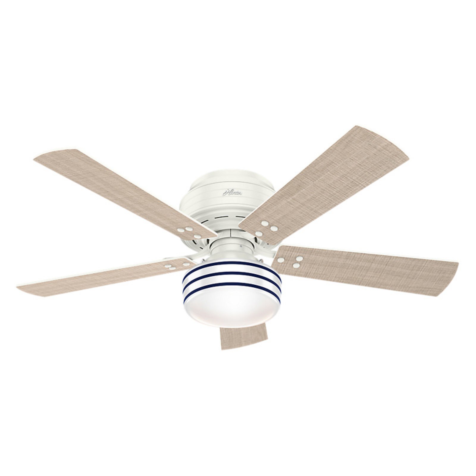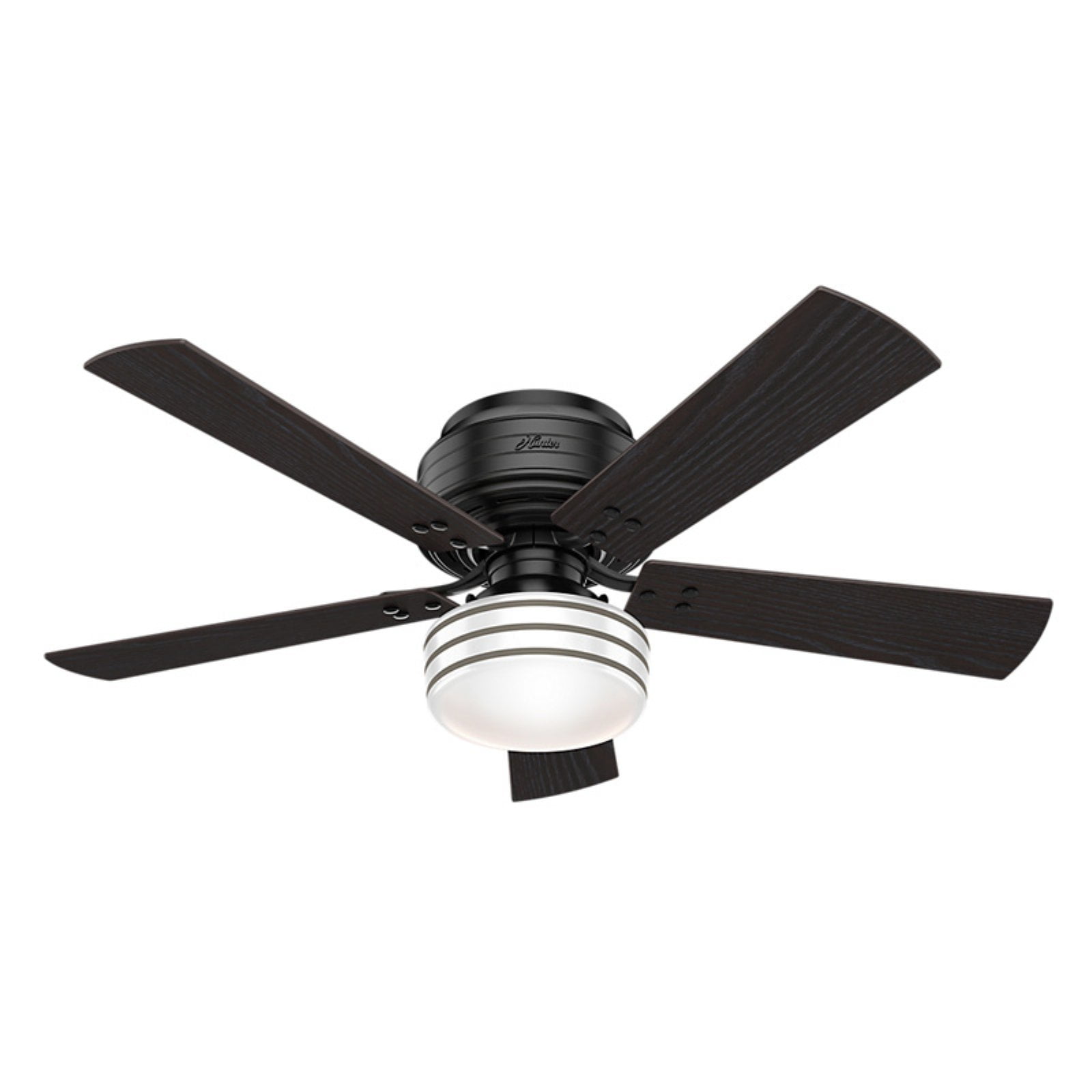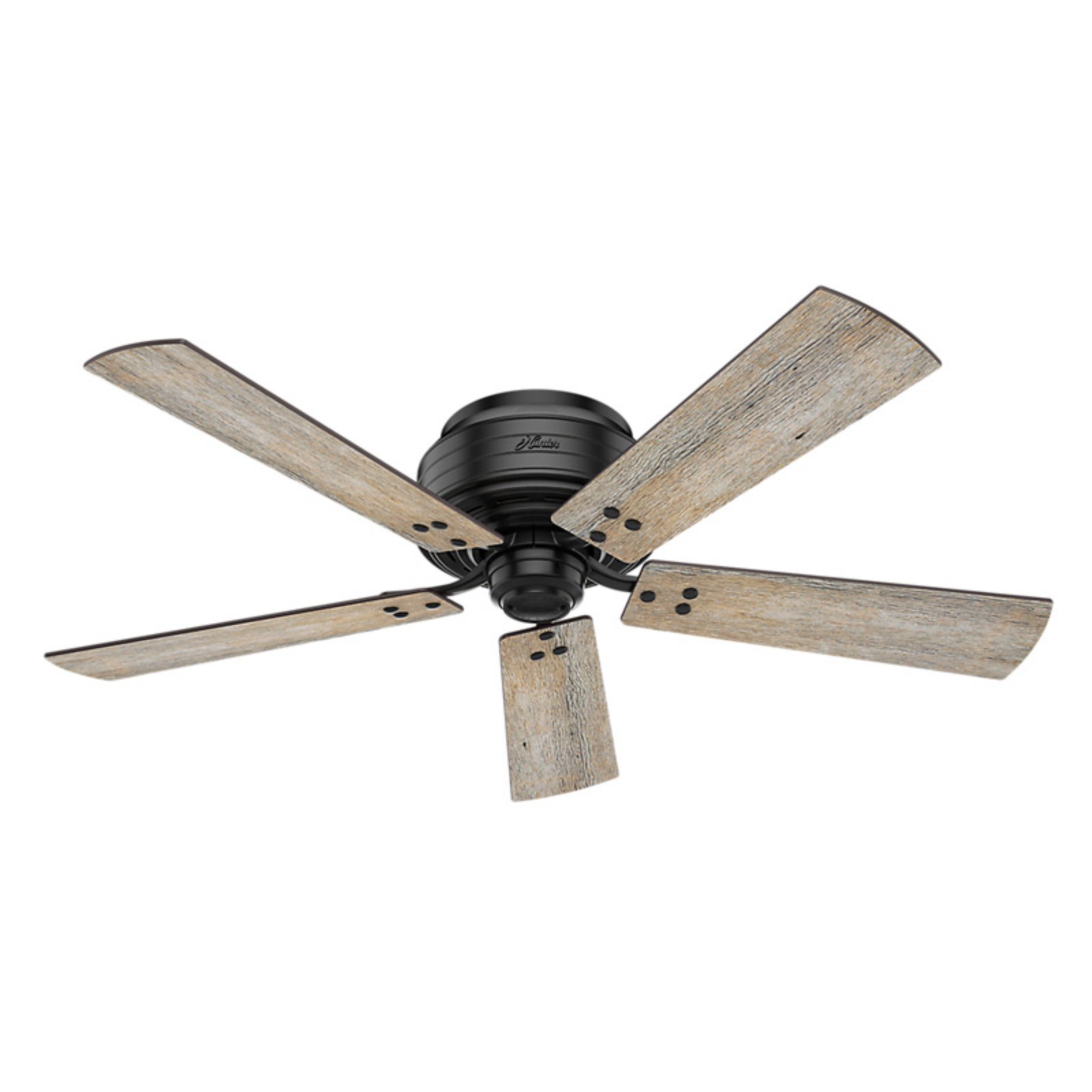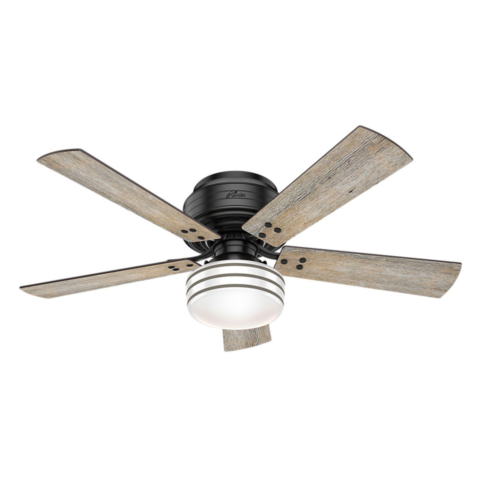Hunter Fans-55080-Collection: Cedar Key, Material: Plywood, Finish Color: Matte Black, Blade Span: 52″, Blade Color: Barnwood/Black Willow, Number Of Blades: 5, Blade Pitch: 13�, Fan Motor Size: 188 mm, Fan Motor Type: AC, Hanging Method: Flush, Light Kit Type: Included, Lamping Type: LED, Control Type: Handheld, Wet Location: Damp Rated, Desc: The Cedar Key low-profile rustic ceiling fan is inspired by farmhouse design elements, from the lines in the housing reminiscent of shiplap to the rustic finishes on the reversible blades. The star of this ceiling fan is the unique handpainted globe, a true nod to the expert craftsmanship at Hunter Fan Company. Go for a coastal look with the White finish and navy striped glass or complement your farmhouse decor with the Matte Black finish and grey glass. The Cedar Key fan has a powerful three-speed motor for exceptional airflow and whisper-quiet performance. Great for covered porches and patios, this damp-rated outdoor ceiling fan has a pre-installed remote control receiver and snap-and-lock light fixture for easy installation. With various sizes and finishes in the Cedar Key collection, you can maintain a consistent style throughout your home while customizing the look of each room. Warranty: Limited Lifetime Motor Warranty is backed by the only company with over 130 years in the fan business Lumens: 800 / Color Temeprature: 3,000 / Color Rendering Index: 80 / Lifetime Expectation (Hours): 25,000 Hrs / Airflow: 4098. Shipping Length (in): 11.8 Shipping Width (in): 26.2 / Shipping Height (in): 15.5 / Shipping Weight (Lbs): 29.35 / Shipping Cubic Feet (L x W x H)/1728: 2.7731. ,-Cedar Key 52 Inch Low Profile Ceiling Fan with LED Light Kit and Handheld Remote-Matte Black Finish