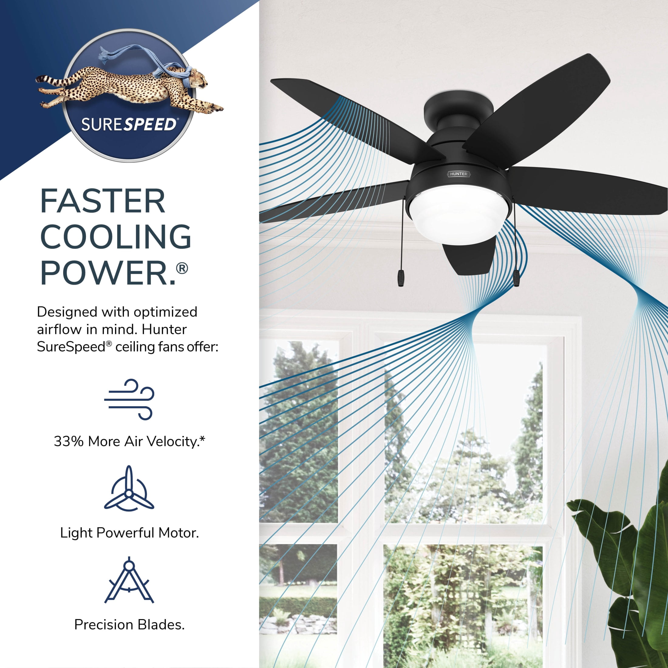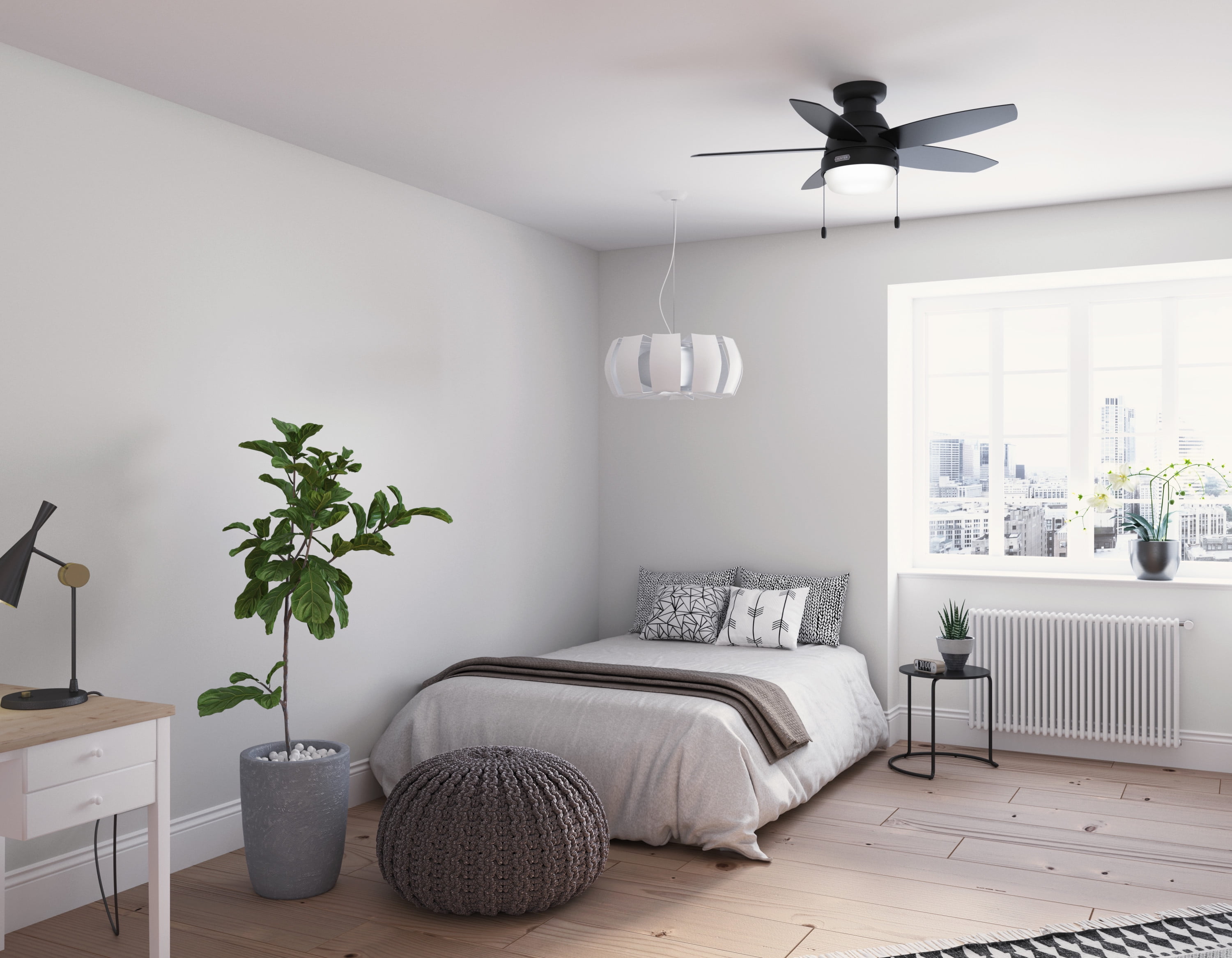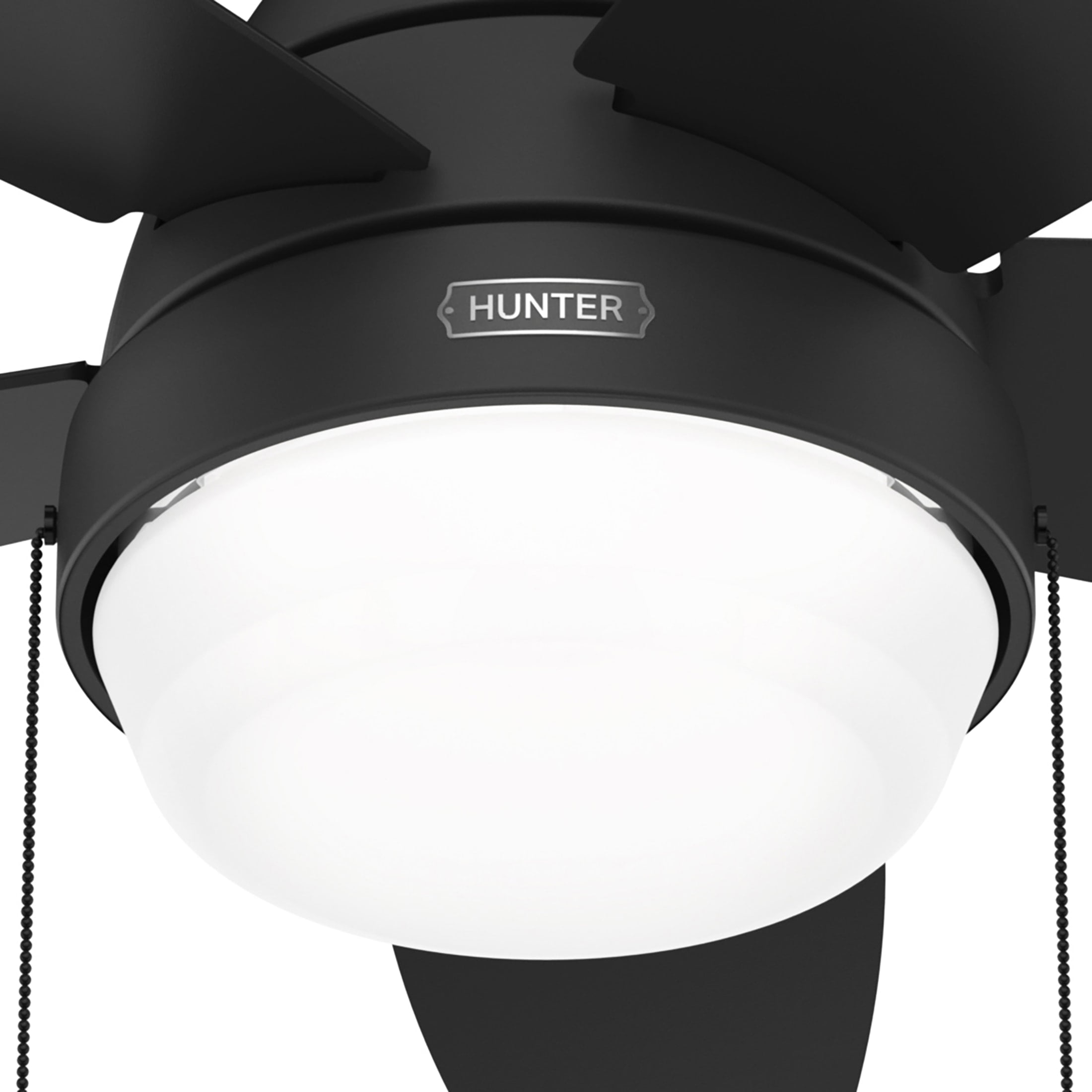 Hunter Fans-52613-Material: Metal, Finish Color: Matte Black, Blade Span: 44″, Blade Color: Matte Black, Number Of Blades: 5, Blade Pitch: 13�, Fan Motor Size: 153×15 mm, Light Kit Type: Integrated, Lamping Type: LED, Control Type: Pull Chain, Desc: A small fan with big mid-century modern influences. The Lilliana combines simple design with subtle asymmetrical detailing for a look that adds a mid-century modern vibe to small spaces that need a statement piece. Built with our SureSpeed� Guarantee, this small ceiling fan packs a punch with its airflow performance as well as its design. Exclusive SureSpeed� Guarantee delivers a high-velocity fan with airflow optimized for ultimate high-speed cooling / Reversible, 3-speed WhisperWind� motor delivers ultra-powerful air movement with whisper-quiet performance so you get the cooling power you want without the noise you don�t� / 5 Matte Black blades included / Includes 2 8W energy-efficient, dimmable LED bulbs to give you control of the ambiance in your space / Specially designed low-profile housing fits flush to the ceiling making it ideal for use in rooms with low ceilings less than 9′ / Includes Integrated light kit with Painted Cased White glass / Control dimming with a handheld remote or wall control / Includes pull chains for quick and easy on/off and speed adjustments / Limited Lifetime Motor Warranty / Exclusive SureSpeed� Guarantee / Rated for indoor use only / 2 bulbs included / Pull chains included / AIRFLOW YOU FEEL: Built with our SureSpeed� Guarantee to deliver over 33% higher air velocity than leading competitors* while maintaining quiet, wobble-free performance. / WHISPER-QUIET MOTOR: 3-speed, WhisperWind� reversible motor for optimal performance in summer and winter.. ,-Lilliana – 5 Blade Flush Ceiling Fan with Light Kit In Modern Style-13.43 Inches Tall and 44 Inches Wide