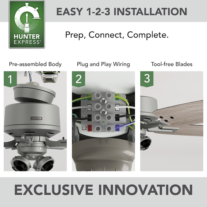 - HUNTEREXPRESS INSTALLATION: Downrod, light kit, and control receiver are installation pain points; these are preinstalled out of the box
