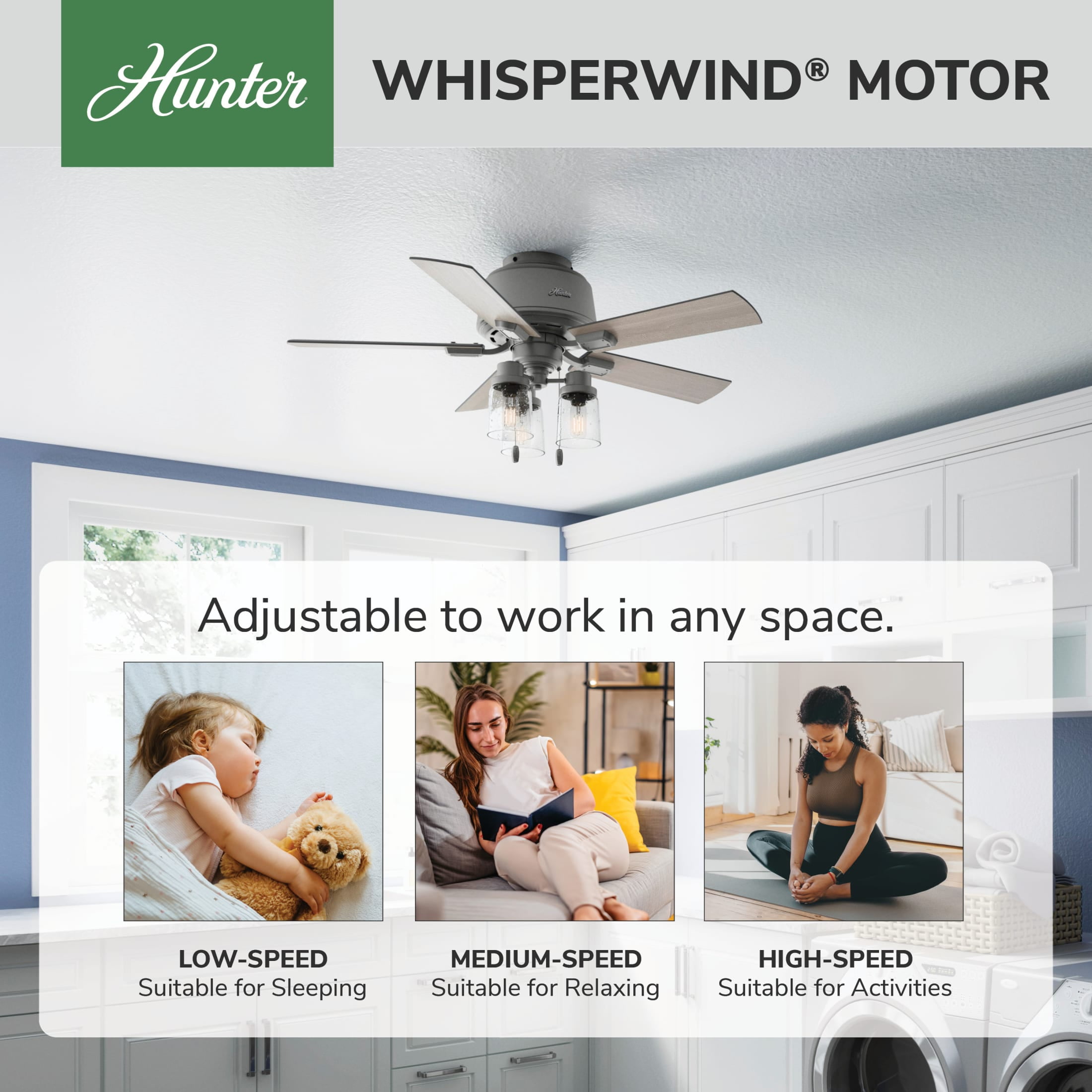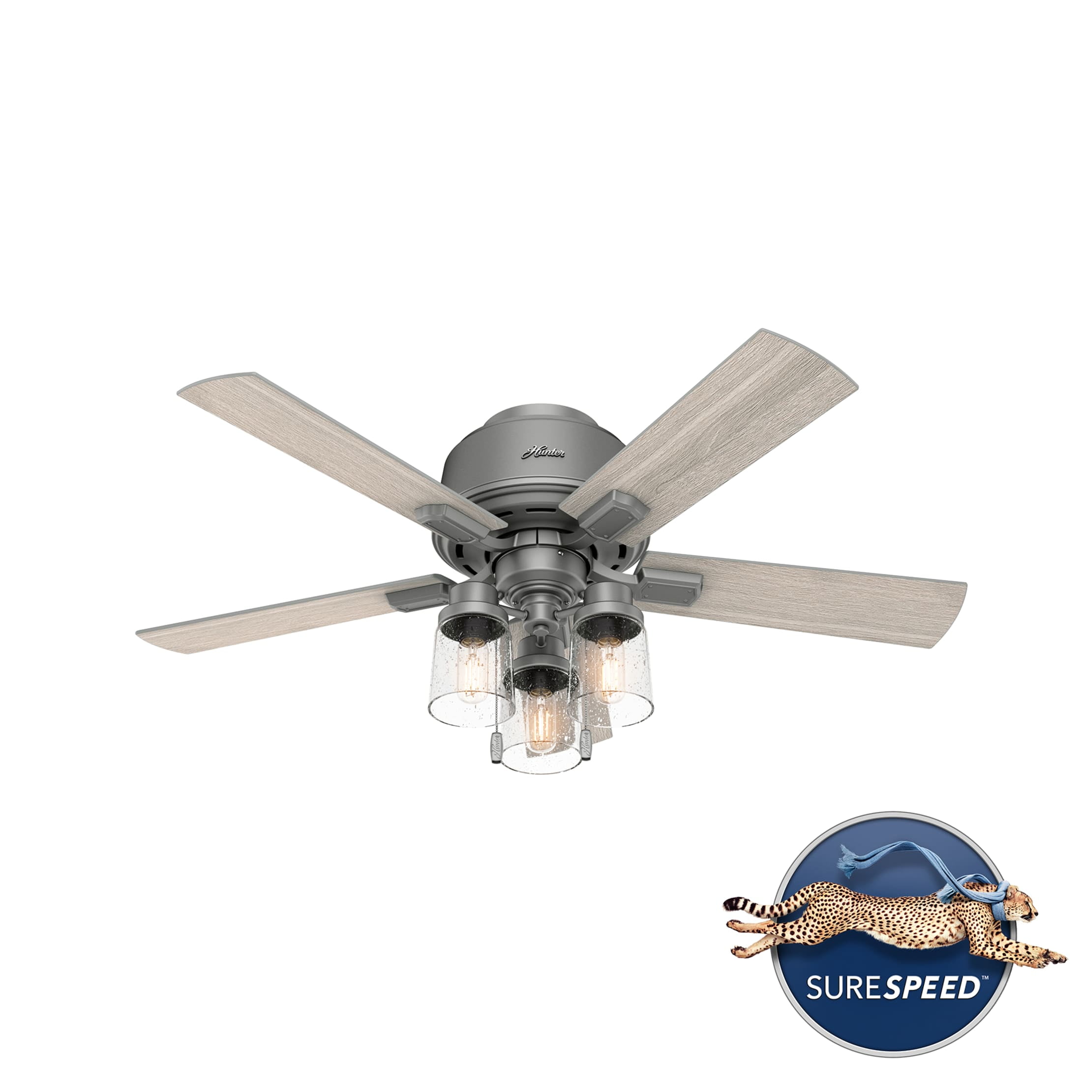 Hunter – Hartland Indoor Low Profile Ceiling Fan With Light, 44-inch, Matte Silver, Casual-style, 3-speed WhisperWind Motor, 50653, for Living Rooms, Bedrooms