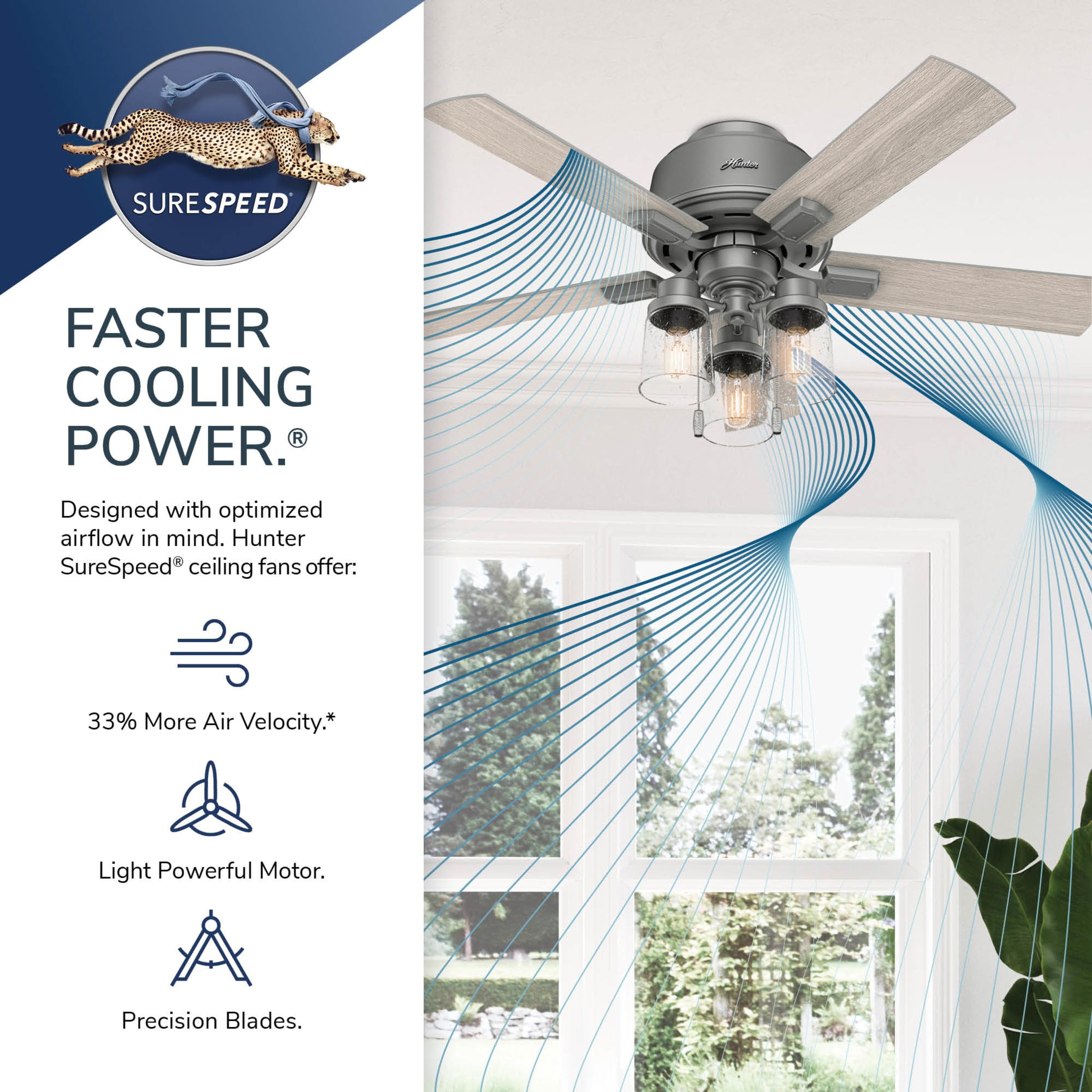 THE HARTLAND: A smaller-sized, casual ceiling fan perfect for your bedroom, guest bedroom, craft / hobby room, office, mudroom / utility room CLEARLY BRIGHTER: TrueLight™ products are designed for modern bulbs that provide illumination and efficiency so you get the perfect brightness, every time SURESPEED AND WHISPERWIND: The 3-speed WhisperWind reversible motor and exclusive SureSpeed Technology deliver ultra-powerful airflow for high-speed cooling with quiet performance PULL CHAINS: Includes pull chains for quick and easy on/off and speed adjustments PULL CHAINS: Includes pull chains for quick and easy on/off and speed adjustments AIRFLOW: Strong airflow up to 3745 cubic feet per minute (CFM) on high speed INDOOR ONLY: This ceiling fan is ETL rated for indoor use only, making it ideal for spaces like living rooms, bedrooms, home offices, and kitchens BULBS INCLUDED: Includes three, 3.5-Watt energy-efficient, long-lasting, dimmable LED bulbs LONGEVITY: Hunter performs twice the agency recommended testing to ensure their ceiling fans – from the finishes to the fan motor your Hunter will stand the test of time WARRANTY: Limited Lifetime Motor Warranty is backed by the only company with over 135 years in the fan business PREMIUM GLASS SHADING: The light kit includes premium clear seeded glass shading WINTER AND SUMMER: Reversible motor allows you to change the direction of your fan from downdraft mode during the summer which helps cool the room to updraft mode during the winter to help circulate trapped warm air near the ceiling BLADE PITCH: 13-degree blade pitch optimized to ensure ideal air movement and peak performance