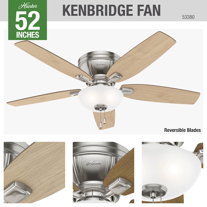 The Kenbridge ceiling fan features a unique, more compact design that takes up less space in your rustic-style room. With an option to install with or without lights, the Kenbridge low-profile fan includes high-efficiency, dimmable LED bulbs so you can get the perfect ambiance in any large room with low ceilings in your home. This rustic ceiling fan features reversible blades powered by a three-speed WhisperWind® motor to deliver ultra-powerful air movement with whisper-quiet performance.