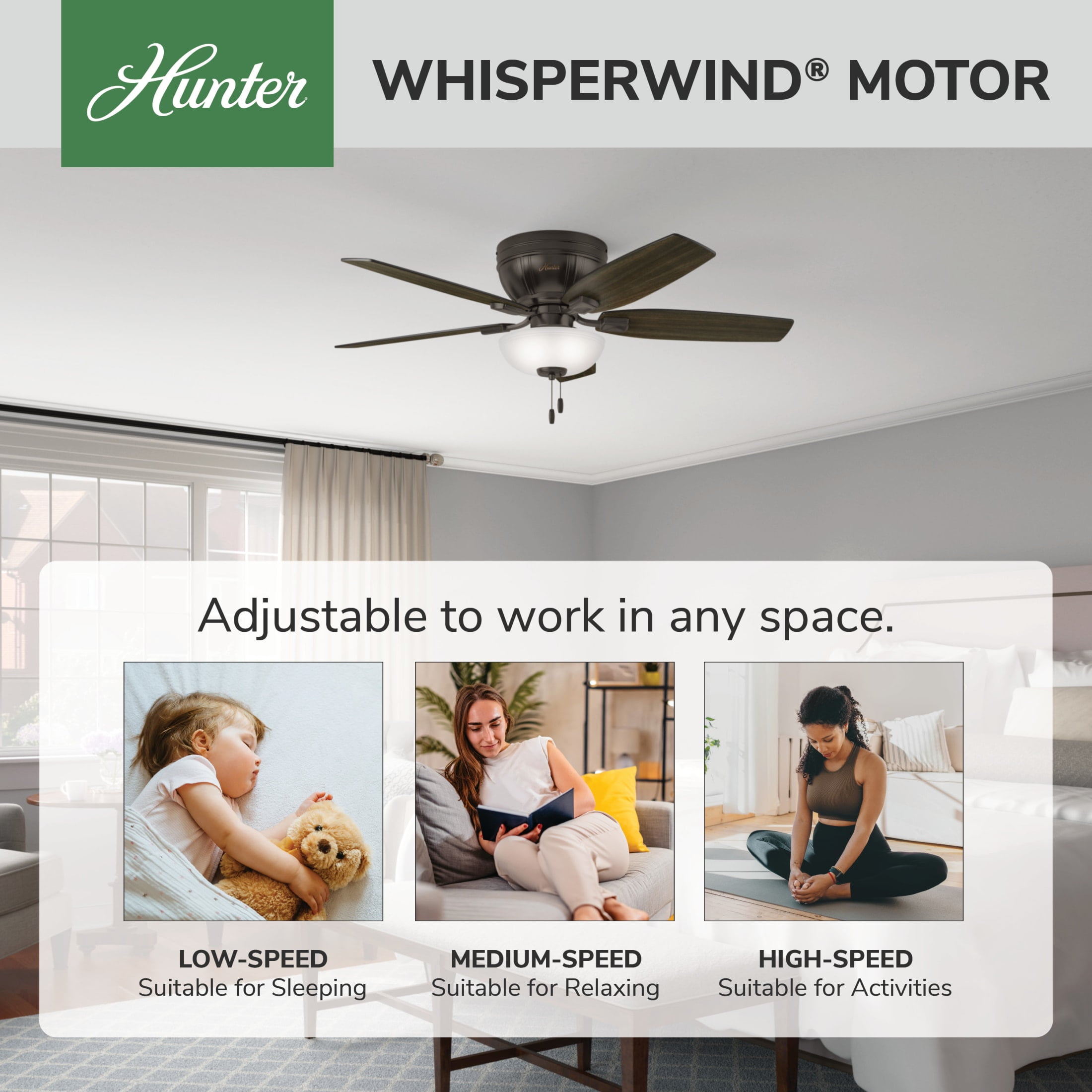 The Kenbridge ceiling fan features a unique, more compact design that takes up less space in your rustic-style room. With an option to install with or without lights, the Kenbridge low-profile fan includes high-efficiency LED bulbs lighting up any large room with low ceilings in your home. This rustic ceiling fan features reversible blades powered by a three-speed WhisperWind® motor to deliver ultra-powerful air movement with whisper-quiet performance.