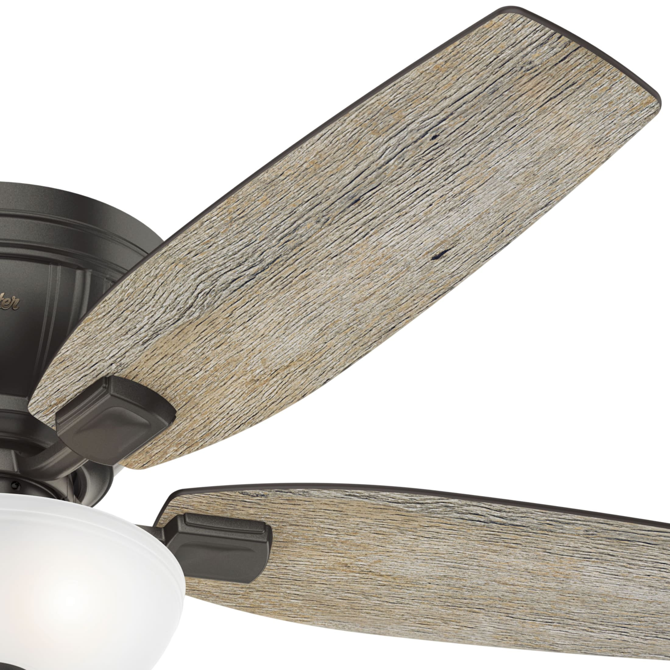 THE KENBRIDGE: A medium-sized, rustic ceiling fan perfect for your master bedroom, living room / great room, bonus room / game room, kitchen, office, laundry room, bedroom CLEARLY BRIGHTER: TrueLight™ products are designed for modern bulbs that provide illumination and efficiency so you get the perfect brightness, every time PULL CHAINS: Includes pull chains for quick and easy on/off and speed adjustments PULL CHAINS: Includes pull chains for quick and easy on/off and speed adjustments AIRFLOW: Strong airflow up to 3713 cubic feet per minute (CFM) on high speed INDOOR ONLY: This ceiling fan is ETL rated for indoor use only, making it ideal for spaces like living rooms, bedrooms, home offices, and kitchens BULBS INCLUDED: Includes three, 9-Watt energy-efficient, long-lasting, dimmable LED bulbs LONGEVITY: Hunter performs twice the agency recommended testing to ensure their ceiling fans – from the finishes to the fan motor your Hunter will stand the test of time WARRANTY: Limited Lifetime Motor Warranty is backed by the only company with over 135 years in the fan business PREMIUM GLASS SHADING: The light kit includes premium painted cased white glass shading FLIP THE BLADE: This fan features 5 reversible Dark Walnut and Barnwood blades to help match your room’s design WINTER AND SUMMER: Reversible motor allows you to change the direction of your fan from downdraft mode during the summer which helps cool the room to updraft mode during the winter to help circulate trapped warm air near the ceiling BLADE PITCH: 13-degree blade pitch optimized to ensure ideal air movement and peak performance