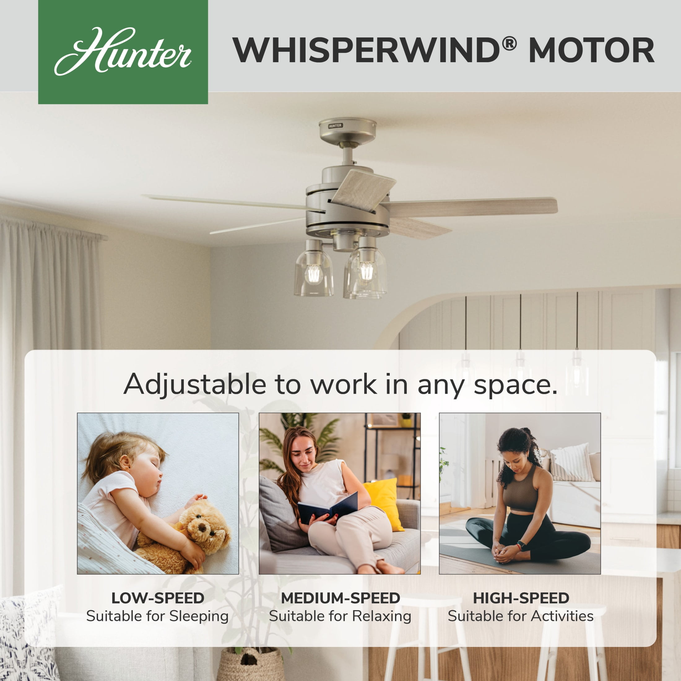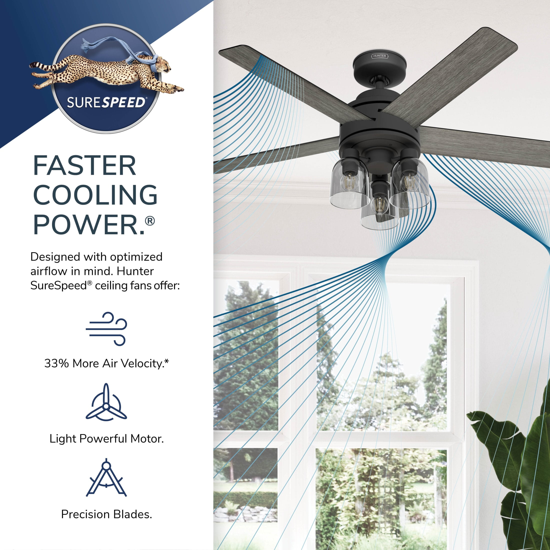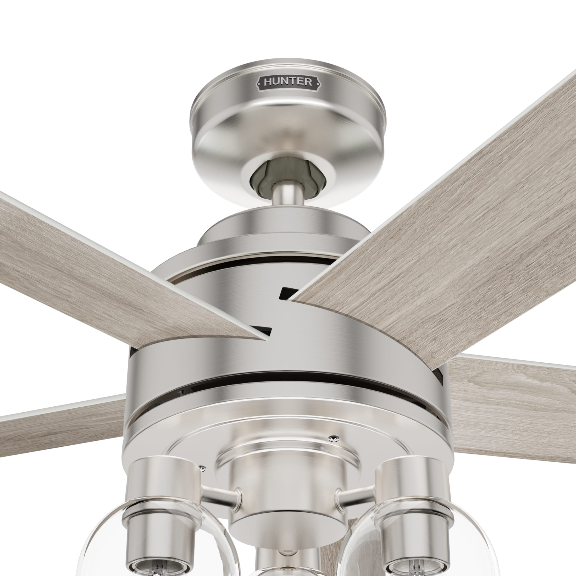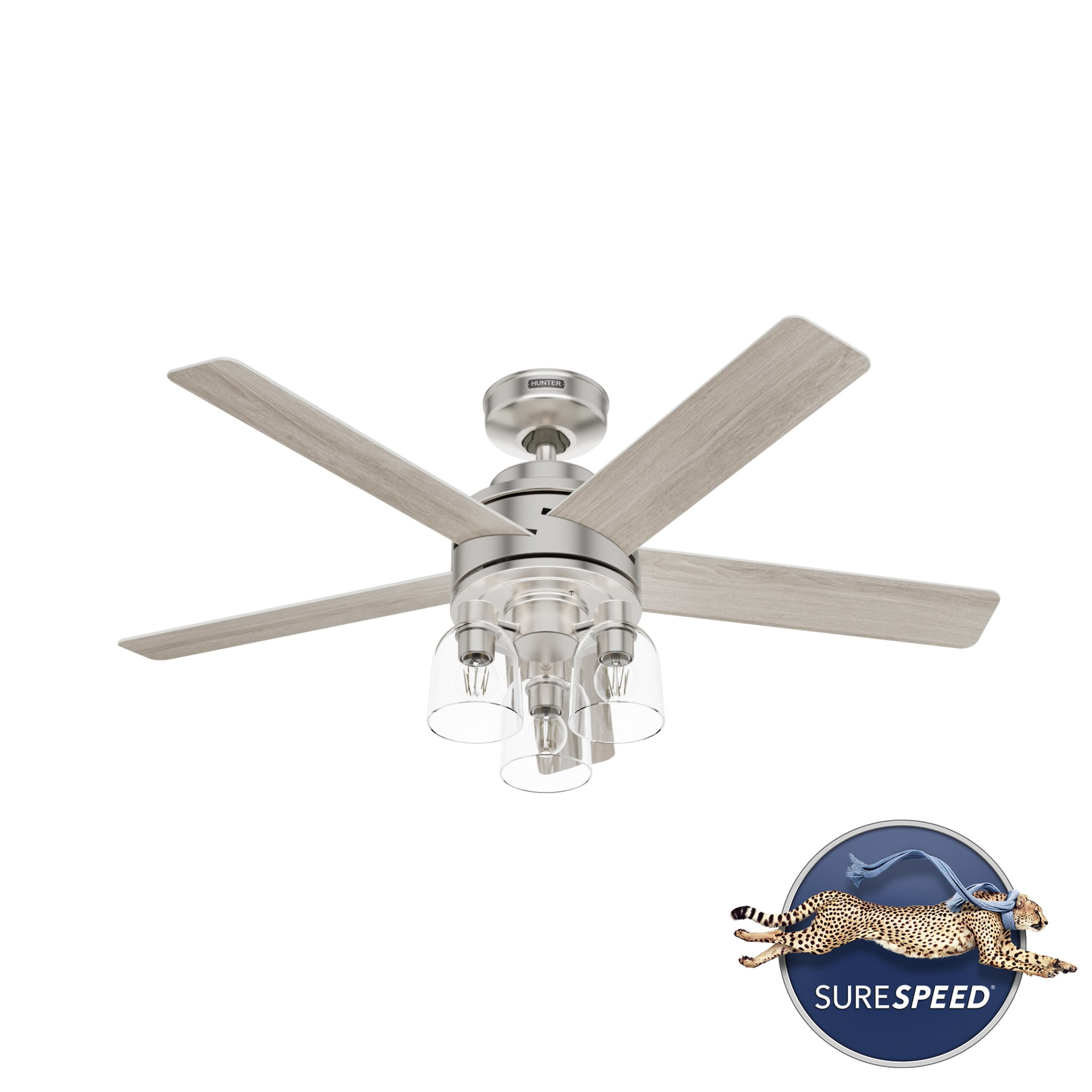 THE LOCHEMEADE: A medium-sized, modern ceiling fan perfect for your living room / great room CLEARLY BRIGHTER: TrueLight™ products are designed for modern bulbs that provide illumination and efficiency so you get the perfect brightness, every time SURESPEED AND WHISPERWIND: The 3-speed WhisperWind reversible motor and exclusive SureSpeed Technology deliver ultra-powerful airflow for high-speed cooling with quiet performance PREMIUM CONTROL: Handheld remote included for easy fan adjustments from anywhere in the room AIRFLOW: Strong airflow up to 5339 cubic feet per minute (CFM) on high speed INDOOR ONLY: This ceiling fan is ETL rated for indoor use only, making it ideal for spaces like living rooms, bedrooms, home offices, and kitchens BULBS INCLUDED: Includes three, 4.5-Watt energy-efficient, long-lasting, dimmable LED bulbs LONGEVITY: Hunter performs twice the agency recommended testing to ensure their ceiling fans – from the finishes to the fan motor your Hunter will stand the test of time WARRANTY: Limited Lifetime Motor Warranty is backed by the only company with over 135 years in the fan business PREMIUM GLASS SHADING: The light kit includes premium clear glass shading DOWNROD: Includes a single 3-inch downrod to ensure proper distance from the ceiling and optimize air movement WINTER AND SUMMER: Reversible motor allows you to change the direction of your fan from downdraft mode during the summer which helps cool the room to updraft mode during the winter to help circulate trapped warm air near the ceiling BLADE PITCH: 13-degree blade pitch optimized to ensure ideal air movement and peak performance