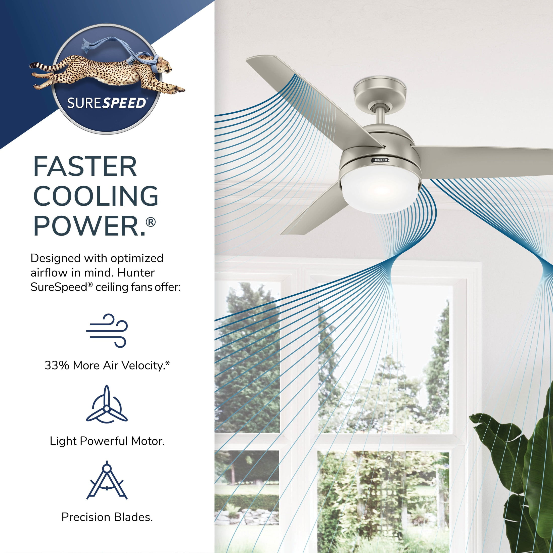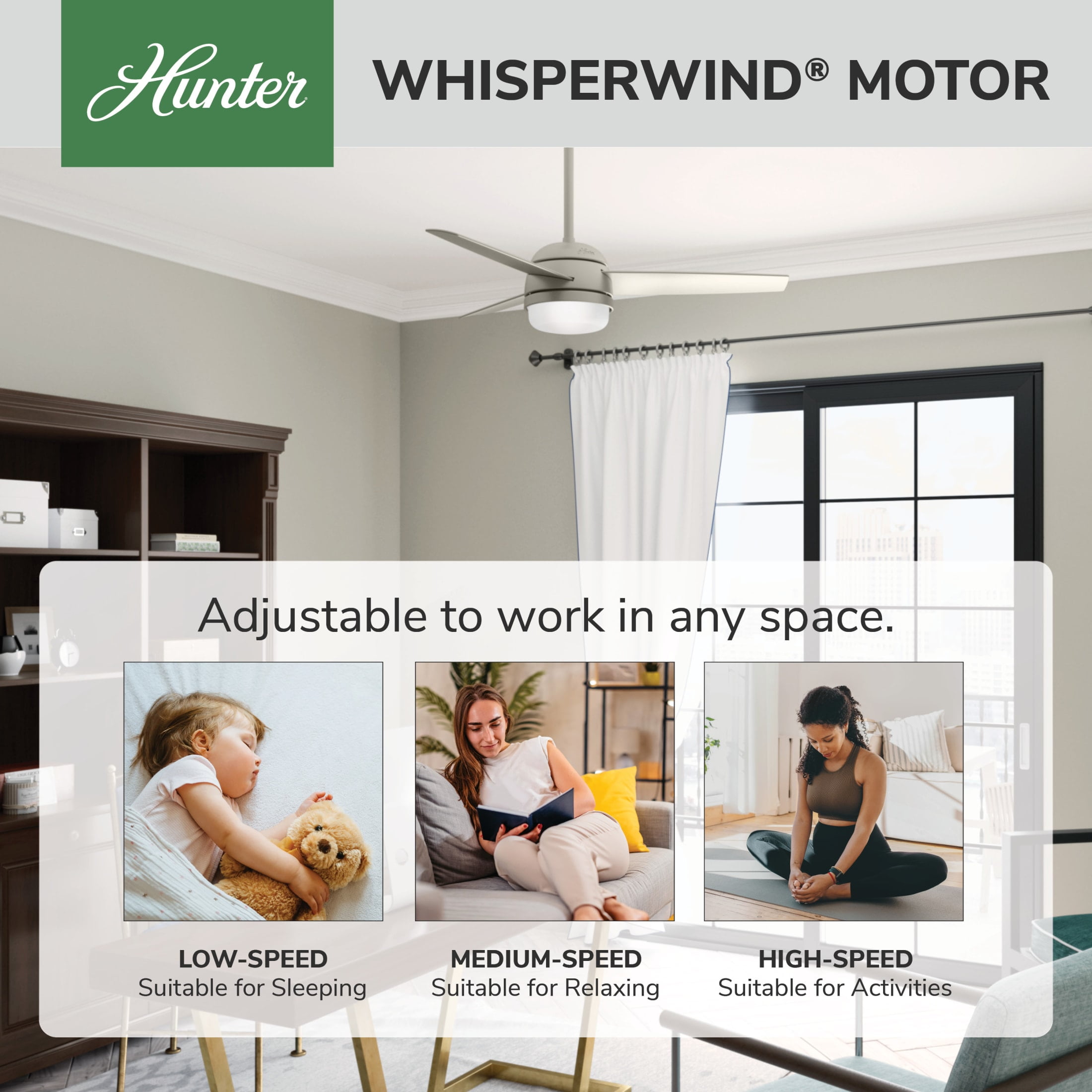 THE MIDTOWN: A medium-sized, modern ceiling fan perfect for your child’s bedroom, craft / hobby room, mudroom / utility room, fitness room, office, kitchen, bedroom, laundry room CLEARLY BRIGHTER: TrueLight™ products are designed for modern bulbs that provide illumination and efficiency so you get the perfect brightness, every time SURESPEED AND WHISPERWIND: The 3-speed WhisperWind reversible motor and exclusive SureSpeed Technology deliver ultra-powerful airflow for high-speed cooling with quiet performance PREMIUM CONTROL: Handheld remote included for easy fan adjustments from anywhere in the room AIRFLOW: Strong airflow up to 4730 cubic feet per minute (CFM) on high speed INDOOR ONLY: This ceiling fan is ETL rated for indoor use only, making it ideal for spaces like living rooms, bedrooms, home offices, and kitchens BULBS INCLUDED: Includes two, 9-Watt energy-efficient, long-lasting, dimmable LED bulbs LONGEVITY: Hunter performs twice the agency recommended testing to ensure their ceiling fans – from the finishes to the fan motor your Hunter will stand the test of time WARRANTY: Limited Lifetime Motor Warranty is backed by the only company with over 135 years in the fan business PREMIUM GLASS SHADING: The light kit includes premium painted cased white glass shading DOWNROD: Includes a single 4-inch downrod to ensure proper distance from the ceiling and optimize air movement WINTER AND SUMMER: Reversible motor allows you to change the direction of your fan from downdraft mode during the summer which helps cool the room to updraft mode during the winter to help circulate trapped warm air near the ceiling BLADE PITCH: 13-degree blade pitch optimized to ensure ideal air movement and peak performance