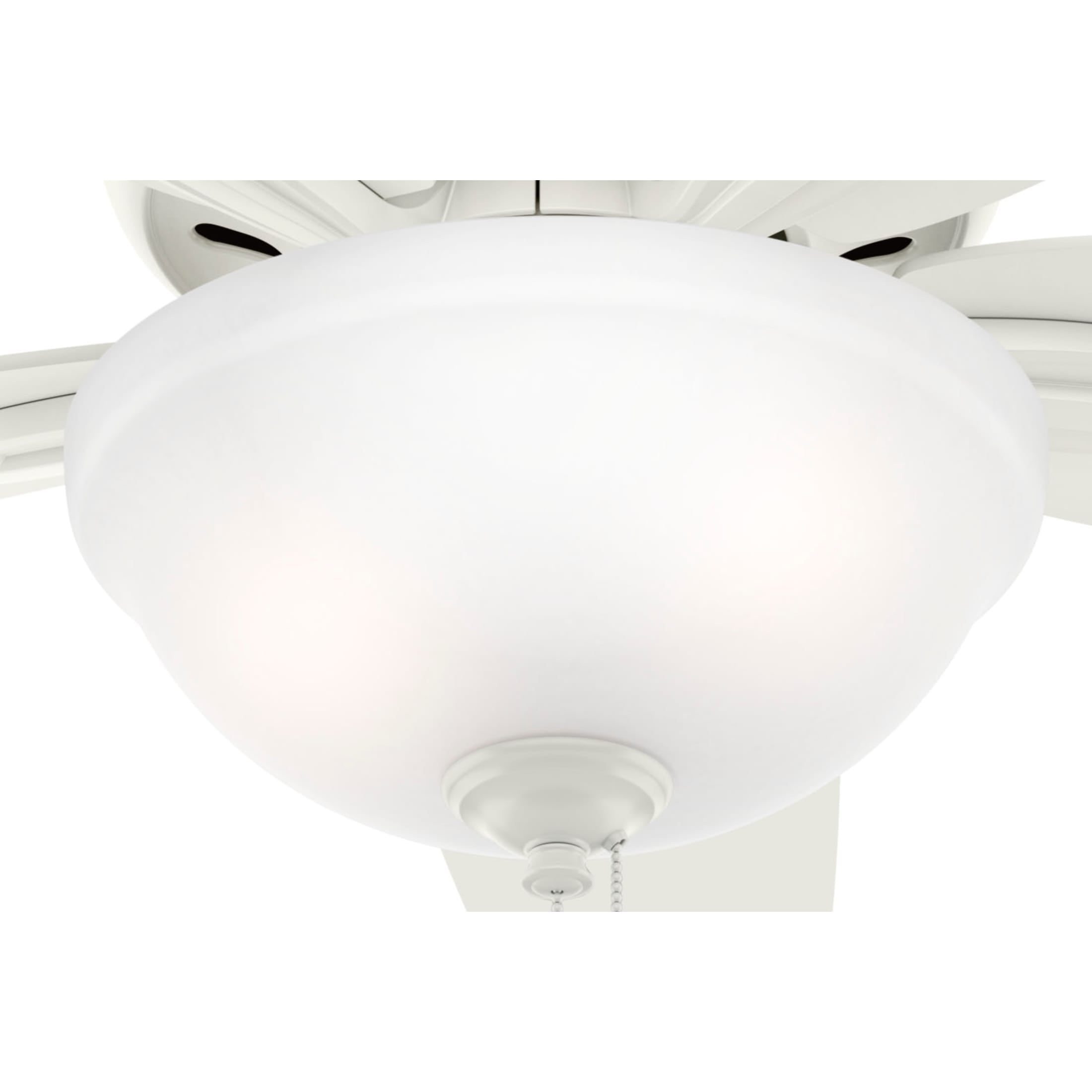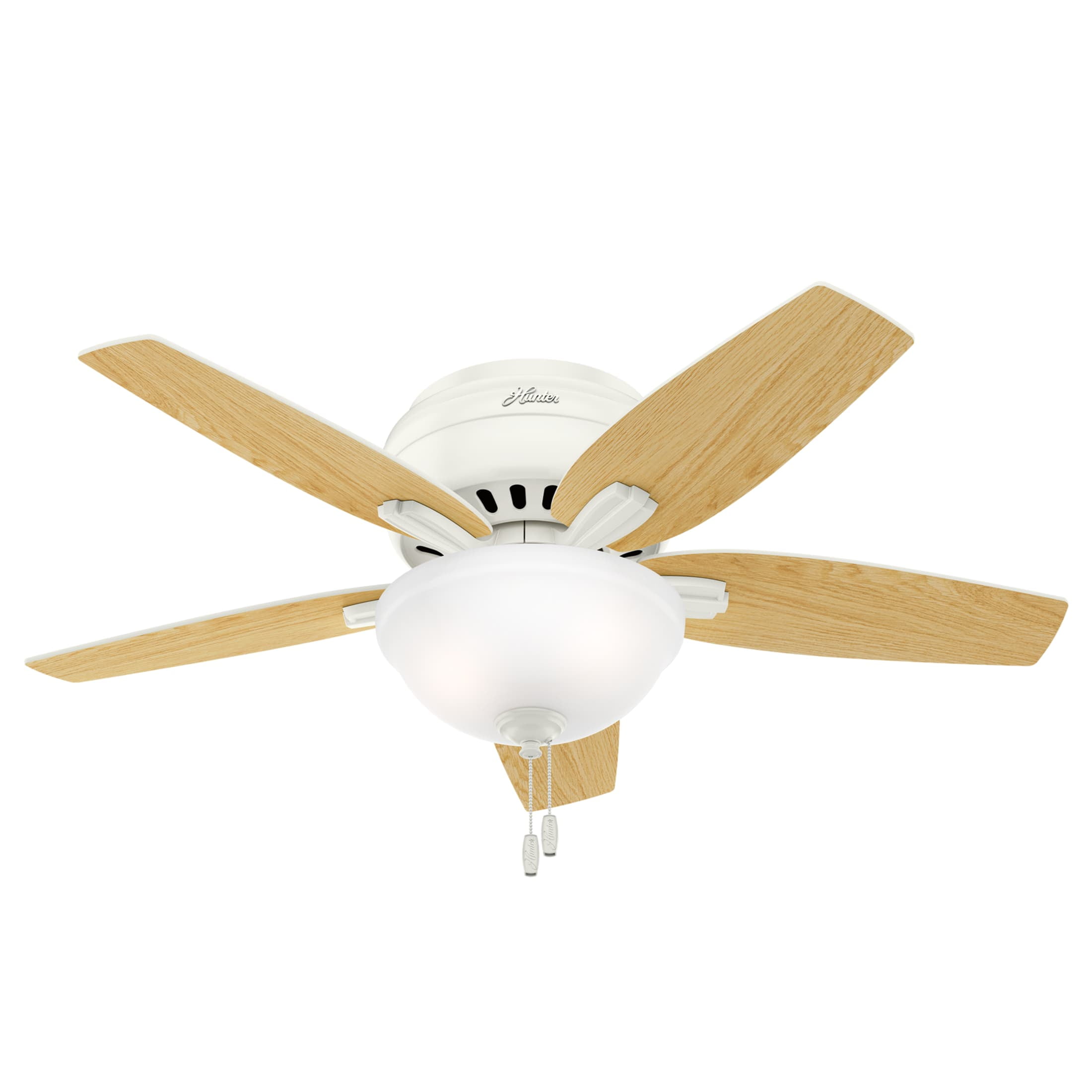 THE NEWSOME: A smaller-sized, traditional ceiling fan perfect for your foyer / entry way, craft / hobby room, mudroom / utility room, fitness room, kitchen, office, laundry room, bedroom CLEARLY BRIGHTER: TrueLight™ products are designed for modern bulbs that provide illumination and efficiency so you get the perfect brightness, every time PULL CHAINS: Includes pull chains for quick and easy on/off and speed adjustments PULL CHAINS: Includes pull chains for quick and easy on/off and speed adjustments AIRFLOW: Strong airflow up to 2697 cubic feet per minute (CFM) on high speed INDOOR ONLY: This ceiling fan is ETL rated for indoor use only, making it ideal for spaces like living rooms, bedrooms, home offices, and kitchens BULBS INCLUDED: Includes two, 9-Watt energy-efficient, long-lasting, dimmable LED bulbs LONGEVITY: Hunter performs twice the agency recommended testing to ensure their ceiling fans – from the finishes to the fan motor your Hunter will stand the test of time WARRANTY: Limited Lifetime Motor Warranty is backed by the only company with over 135 years in the fan business PREMIUM GLASS SHADING: The light kit includes premium clear frosted glass shading FLIP THE BLADE: This fan features 5 reversible Fresh White and Light Oak blades to help match your room’s design WINTER AND SUMMER: Reversible motor allows you to change the direction of your fan from downdraft mode during the summer which helps cool the room to updraft mode during the winter to help circulate trapped warm air near the ceiling BLADE PITCH: 13-degree blade pitch optimized to ensure ideal air movement and peak performance