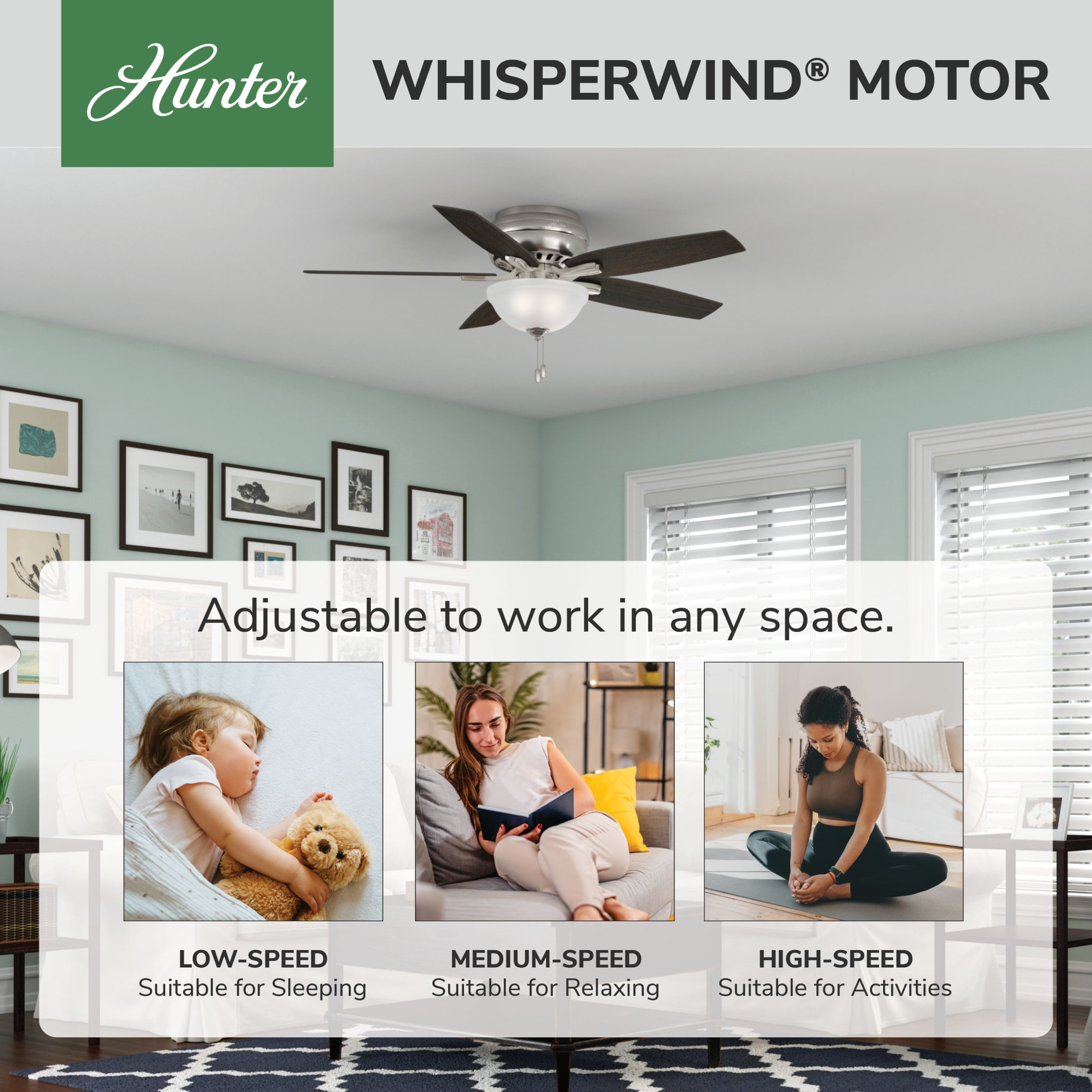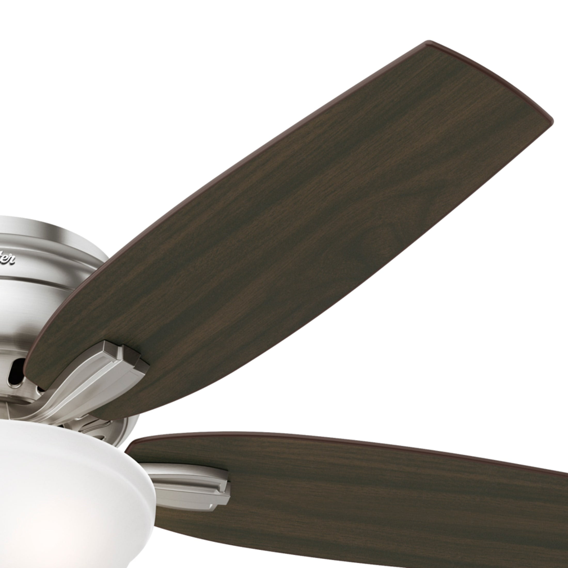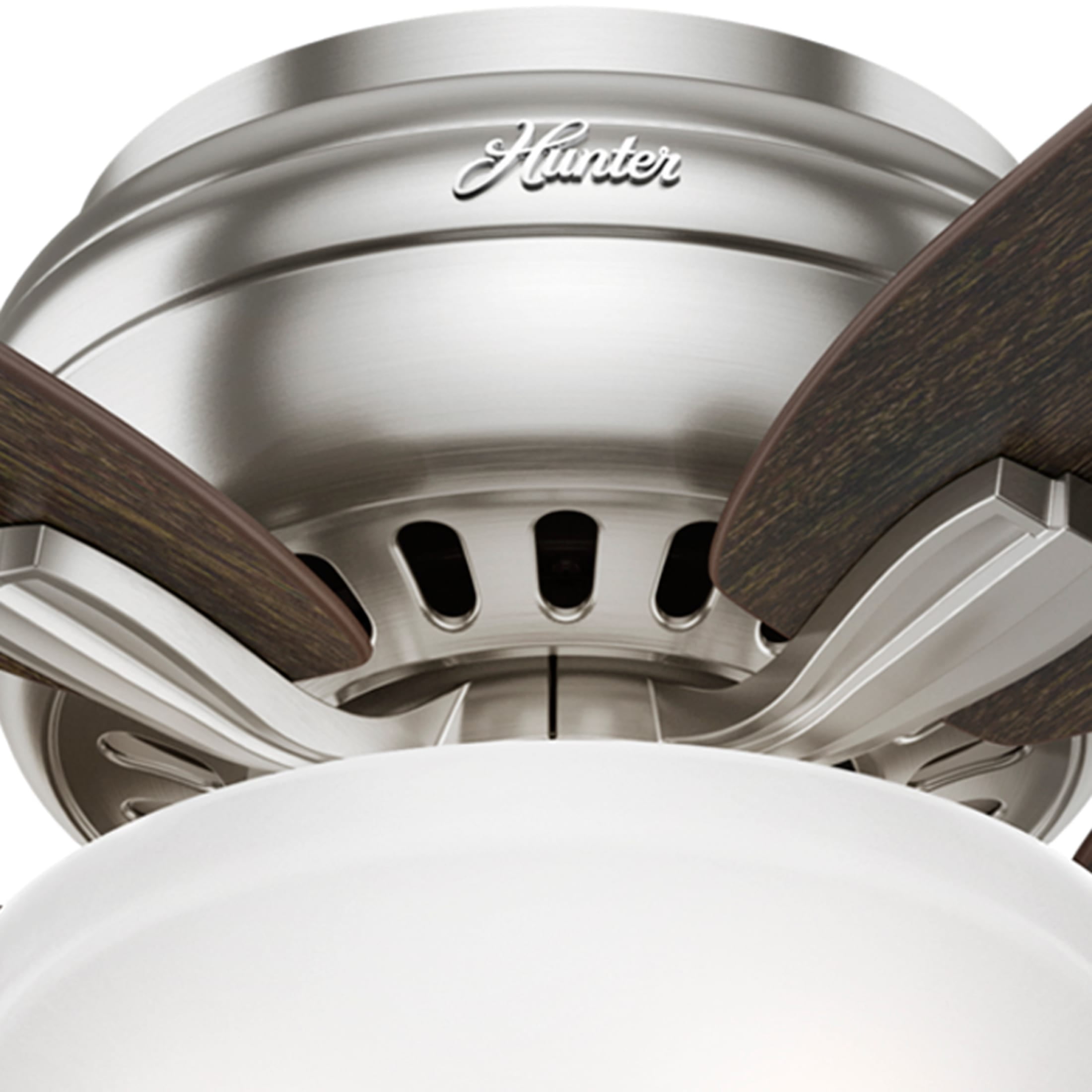 THE NEWSOME: A medium-sized, traditional ceiling fan perfect for your master bedroom, living room / great room, bonus room / game room, kitchen, office, laundry room, bedroom CLEARLY BRIGHTER: TrueLight™ products are designed for modern bulbs that provide illumination and efficiency so you get the perfect brightness, every time PULL CHAINS: Includes pull chains for quick and easy on/off and speed adjustments PULL CHAINS: Includes pull chains for quick and easy on/off and speed adjustments AIRFLOW: Strong airflow up to 3503 cubic feet per minute (CFM) on high speed INDOOR ONLY: This ceiling fan is ETL rated for indoor use only, making it ideal for spaces like living rooms, bedrooms, home offices, and kitchens BULBS INCLUDED: Includes two, 9-Watt energy-efficient, long-lasting, dimmable LED bulbs LONGEVITY: Hunter performs twice the agency recommended testing to ensure their ceiling fans – from the finishes to the fan motor your Hunter will stand the test of time WARRANTY: Limited Lifetime Motor Warranty is backed by the only company with over 135 years in the fan business PREMIUM GLASS SHADING: The light kit includes premium painted cased white glass shading FLIP THE BLADE: This fan features 5 reversible Medium Walnut and Dark Walnut blades to help match your room’s design WINTER AND SUMMER: Reversible motor allows you to change the direction of your fan from downdraft mode during the summer which helps cool the room to updraft mode during the winter to help circulate trapped warm air near the ceiling BLADE PITCH: 13-degree blade pitch optimized to ensure ideal air movement and peak performance