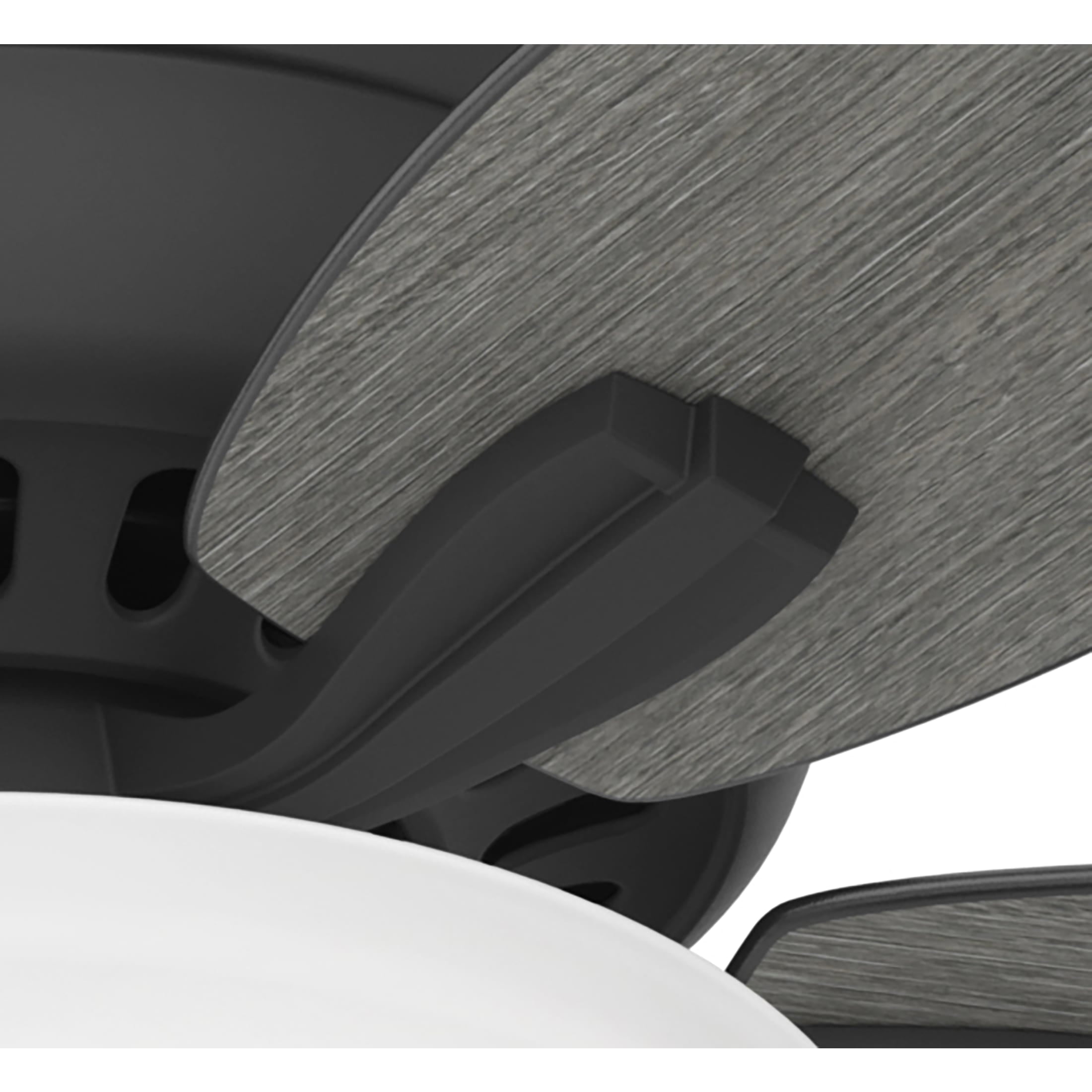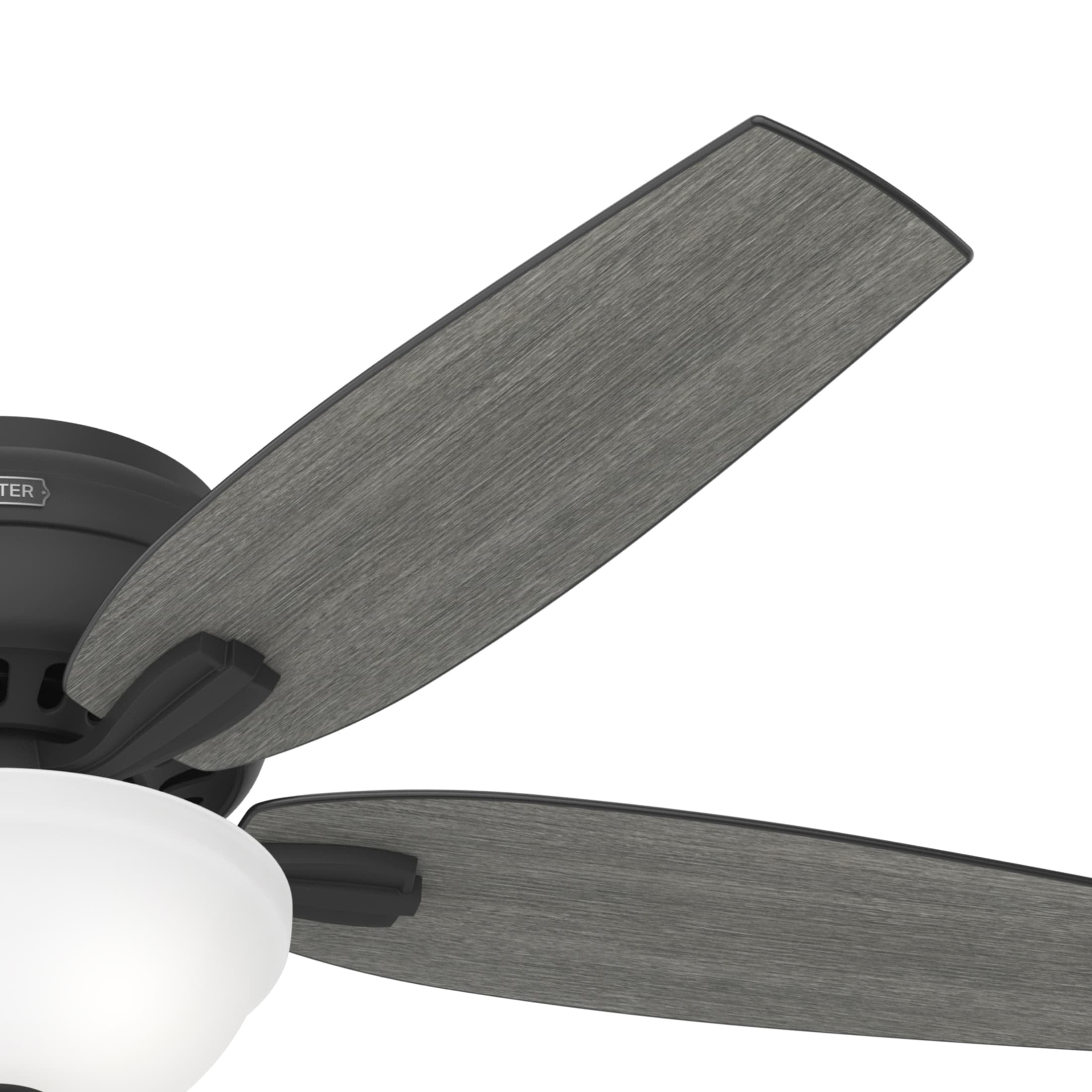 THE NEWSOME: A medium-sized, traditional ceiling fan perfect for your master bedroom, living room / great room, bonus room / game room, kitchen, office, laundry room, bedroom CLEARLY BRIGHTER: TrueLight™ products are designed for modern bulbs that provide illumination and efficiency so you get the perfect brightness, every time PULL CHAINS: Includes pull chains for quick and easy on/off and speed adjustments PULL CHAINS: Includes pull chains for quick and easy on/off and speed adjustments AIRFLOW: Strong airflow up to 3503 cubic feet per minute (CFM) on high speed INDOOR ONLY: This ceiling fan is ETL rated for indoor use only, making it ideal for spaces like living rooms, bedrooms, home offices, and kitchens BULBS INCLUDED: Includes two, 9-Watt energy-efficient, long-lasting, dimmable LED bulbs LONGEVITY: Hunter performs twice the agency recommended testing to ensure their ceiling fans – from the finishes to the fan motor your Hunter will stand the test of time WARRANTY: Limited Lifetime Motor Warranty is backed by the only company with over 135 years in the fan business PREMIUM GLASS SHADING: The light kit includes premium painted cased white glass shading FLIP THE BLADE: This fan features 5 reversible Dark Gray Oak and Matte Black blades to help match your room’s design WINTER AND SUMMER: Reversible motor allows you to change the direction of your fan from downdraft mode during the summer which helps cool the room to updraft mode during the winter to help circulate trapped warm air near the ceiling BLADE PITCH: 13-degree blade pitch optimized to ensure ideal air movement and peak performance