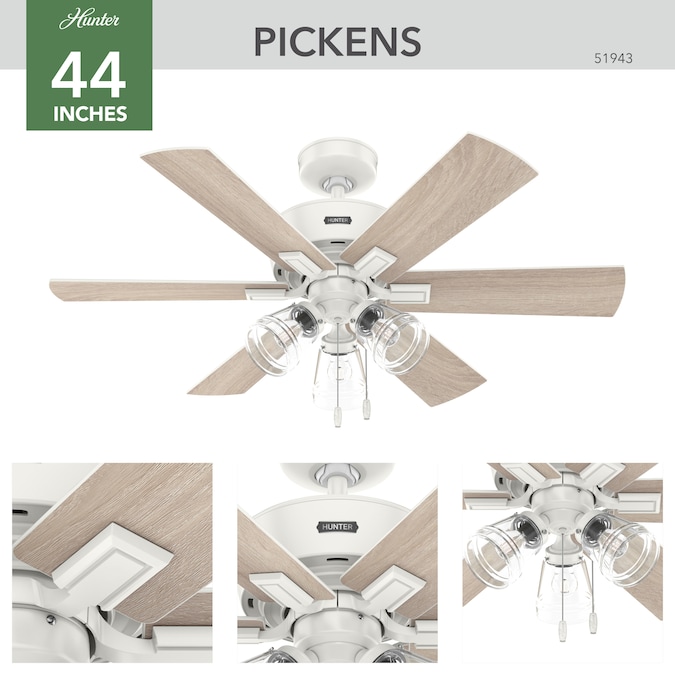 A traditional beauty, the Pickens ceiling fan could be the perfect complement for your kitchen, dining room or entryway. Three LED lights introduce an element of warmth while the fan, built with Hunter’s SureSpeed® Guarantee, keeps things cool with optimized airflow you can feel. Dress up your dining room or cool down your kitchen with the Pickens ceiling fan, optimally engineered for smaller spaces.