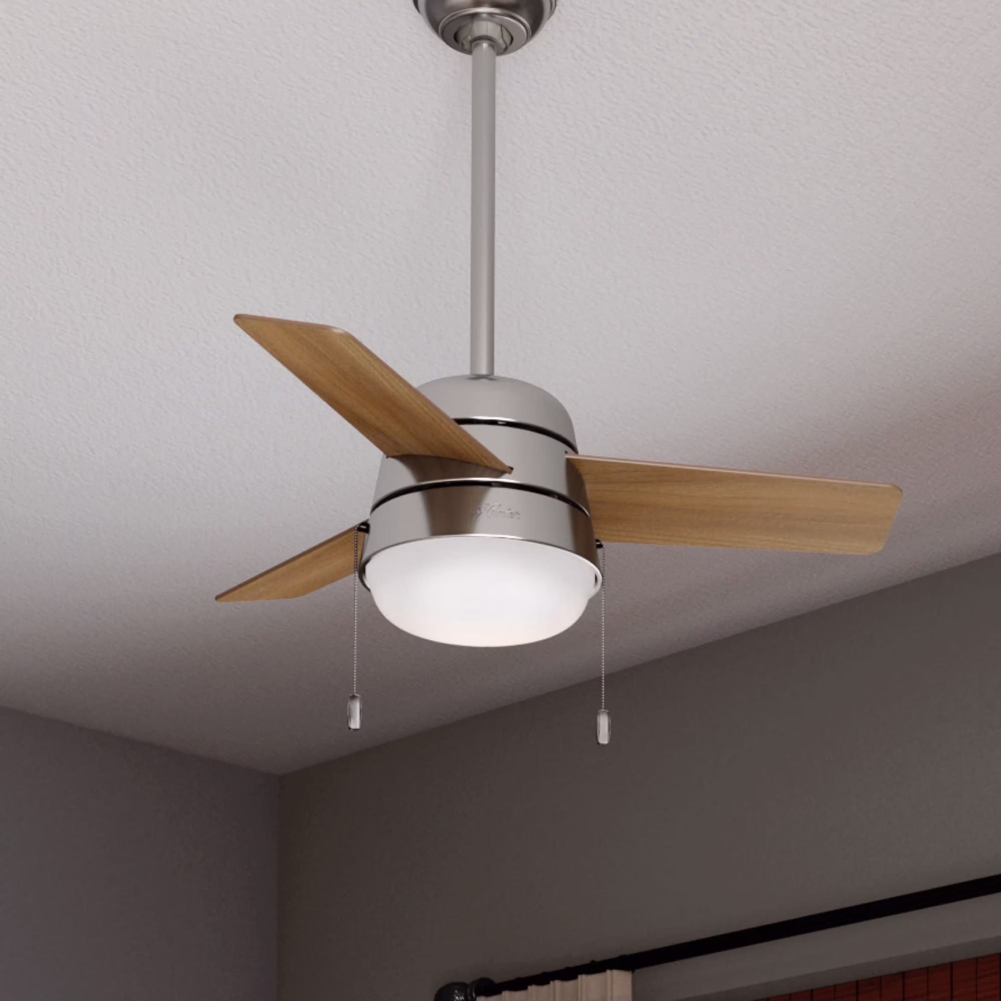 THE PRESTO: A smaller-sized, casual ceiling fan perfect for your bedroom, craft / hobby room, foyer / entry way, mudroom / utility room, office CLEARLY BRIGHTER: TrueLight™ products are designed for modern bulbs that provide illumination and efficiency so you get the perfect brightness, every time SURESPEED AND WHISPERWIND: The 3-speed WhisperWind reversible motor and exclusive SureSpeed Technology deliver ultra-powerful airflow for high-speed cooling with quiet performance PREMIUM CONTROL: Wall control included for easy adjustments right from the wall of your choice AIRFLOW: Strong airflow up to 3519 cubic feet per minute (CFM) on high speed INDOOR ONLY: This ceiling fan is ETL rated for indoor use only, making it ideal for spaces like living rooms, bedrooms, home offices, and kitchens LONGEVITY: Hunter performs twice the agency recommended testing to ensure their ceiling fans – from the finishes to the fan motor your Hunter will stand the test of time WARRANTY: Limited Lifetime Motor Warranty is backed by the only company with over 135 years in the fan business DOWNROD: Includes a single 2-inch downrod to ensure proper distance from the ceiling and optimize air movement WINTER AND SUMMER: Reversible motor allows you to change the direction of your fan from downdraft mode during the summer which helps cool the room to updraft mode during the winter to help circulate trapped warm air near the ceiling BLADE PITCH: 13-degree blade pitch optimized to ensure ideal air movement and peak performance