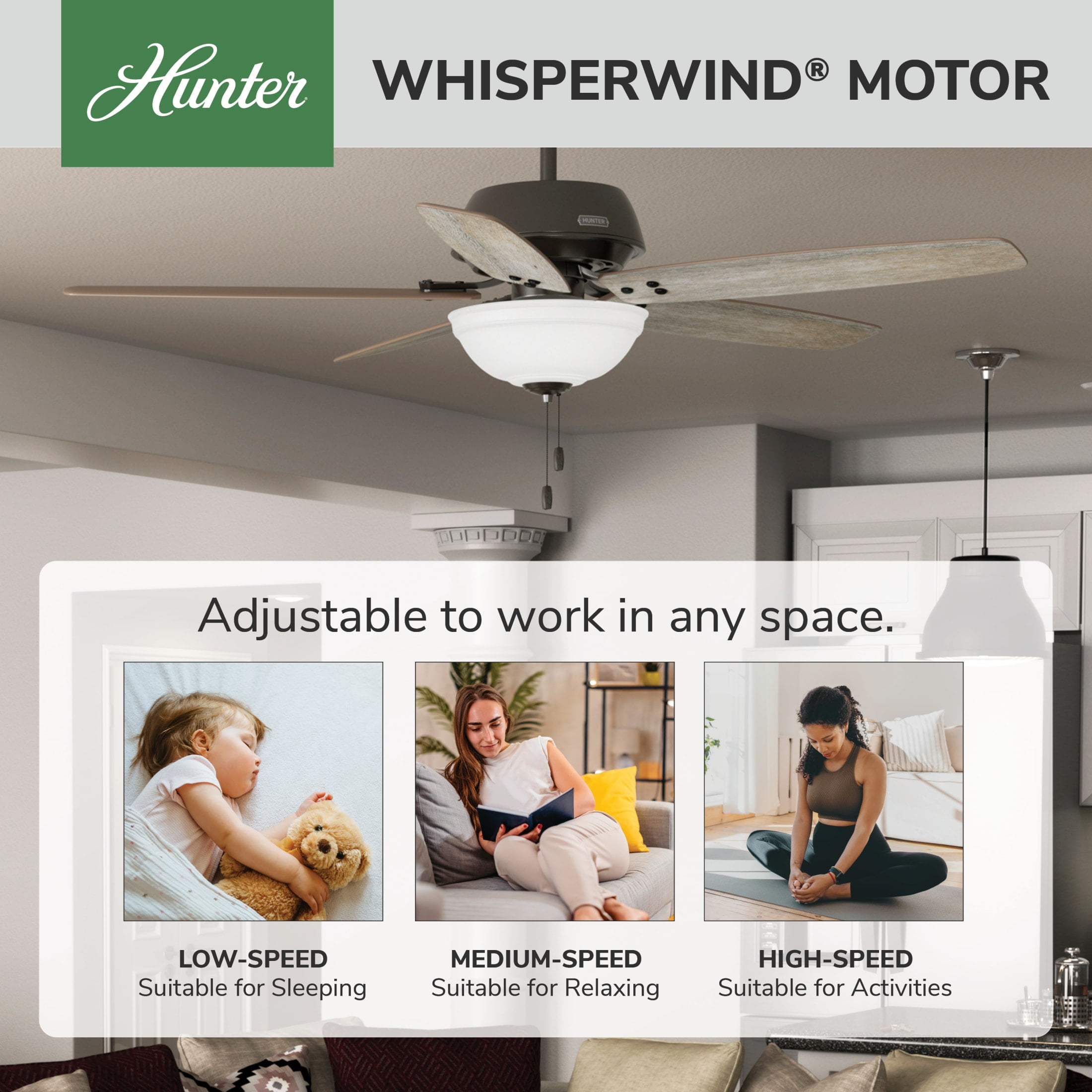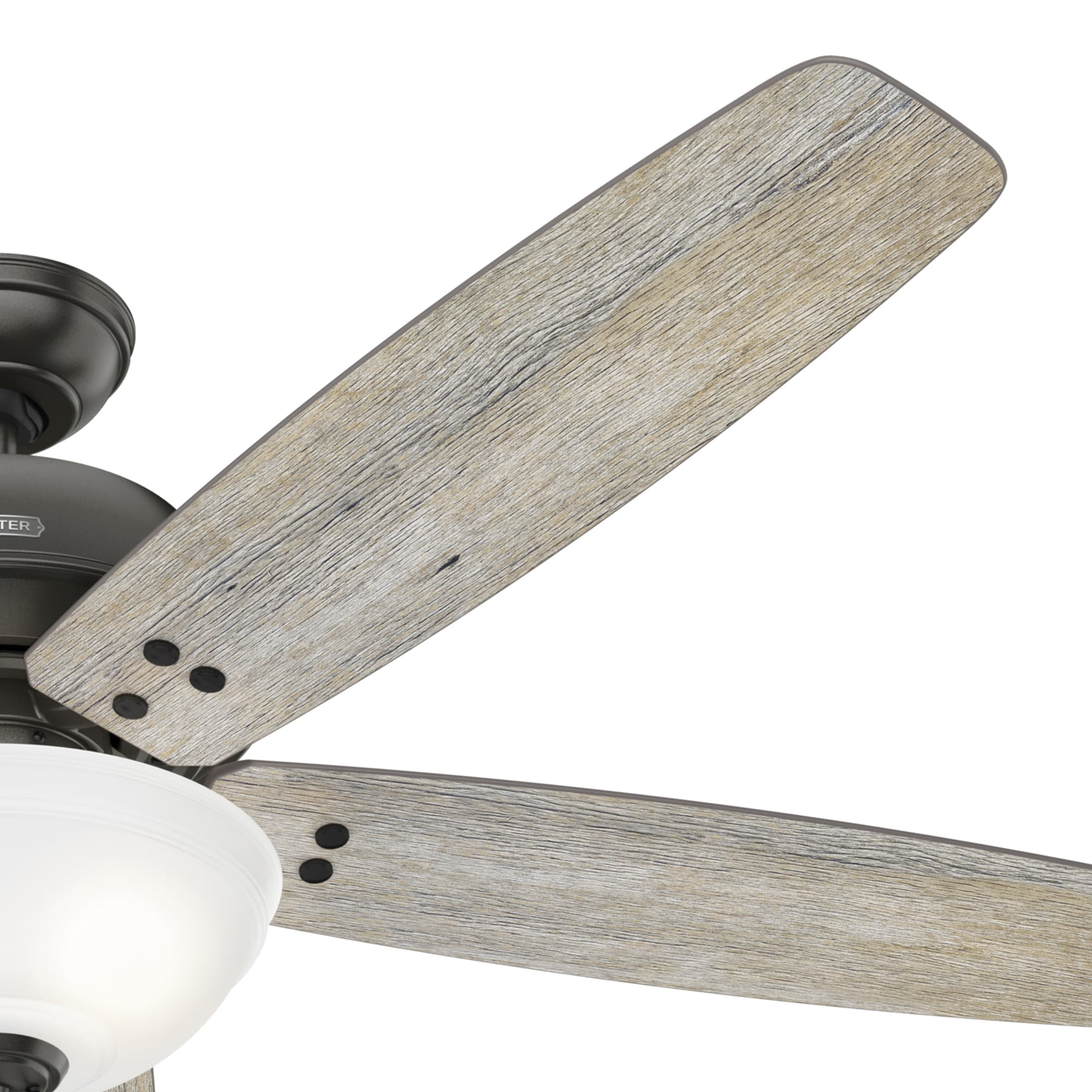 THE REVEILLE: A larger-sized, casual ceiling fan perfect for your bonus room / game room, living room / great room, master bedroom CLEARLY BRIGHTER: TrueLight™ products are designed for modern bulbs that provide illumination and efficiency so you get the perfect brightness, every time PULL CHAINS: Includes pull chains for quick and easy on/off and speed adjustments PULL CHAINS: Includes pull chains for quick and easy on/off and speed adjustments AIRFLOW: Strong airflow up to 5422 cubic feet per minute (CFM) on high speed INDOOR ONLY: This ceiling fan is ETL rated for indoor use only, making it ideal for spaces like living rooms, bedrooms, home offices, and kitchens BULBS INCLUDED: Includes three, 9-Watt energy-efficient, long-lasting, dimmable LED bulbs LONGEVITY: Hunter performs twice the agency recommended testing to ensure their ceiling fans – from the finishes to the fan motor your Hunter will stand the test of time WARRANTY: Limited Lifetime Motor Warranty is backed by the only company with over 135 years in the fan business PREMIUM GLASS SHADING: The light kit includes premium painted cased white glass shading FLIP THE BLADE: This fan features 5 reversible Barnwood and Stone blades to help match your room’s design DOWNROD: Includes a single 3-inch downrod to ensure proper distance from the ceiling and optimize air movement WINTER AND SUMMER: Reversible motor allows you to change the direction of your fan from downdraft mode during the summer which helps cool the room to updraft mode during the winter to help circulate trapped warm air near the ceiling BLADE PITCH: 13-degree blade pitch optimized to ensure ideal air movement and peak performance