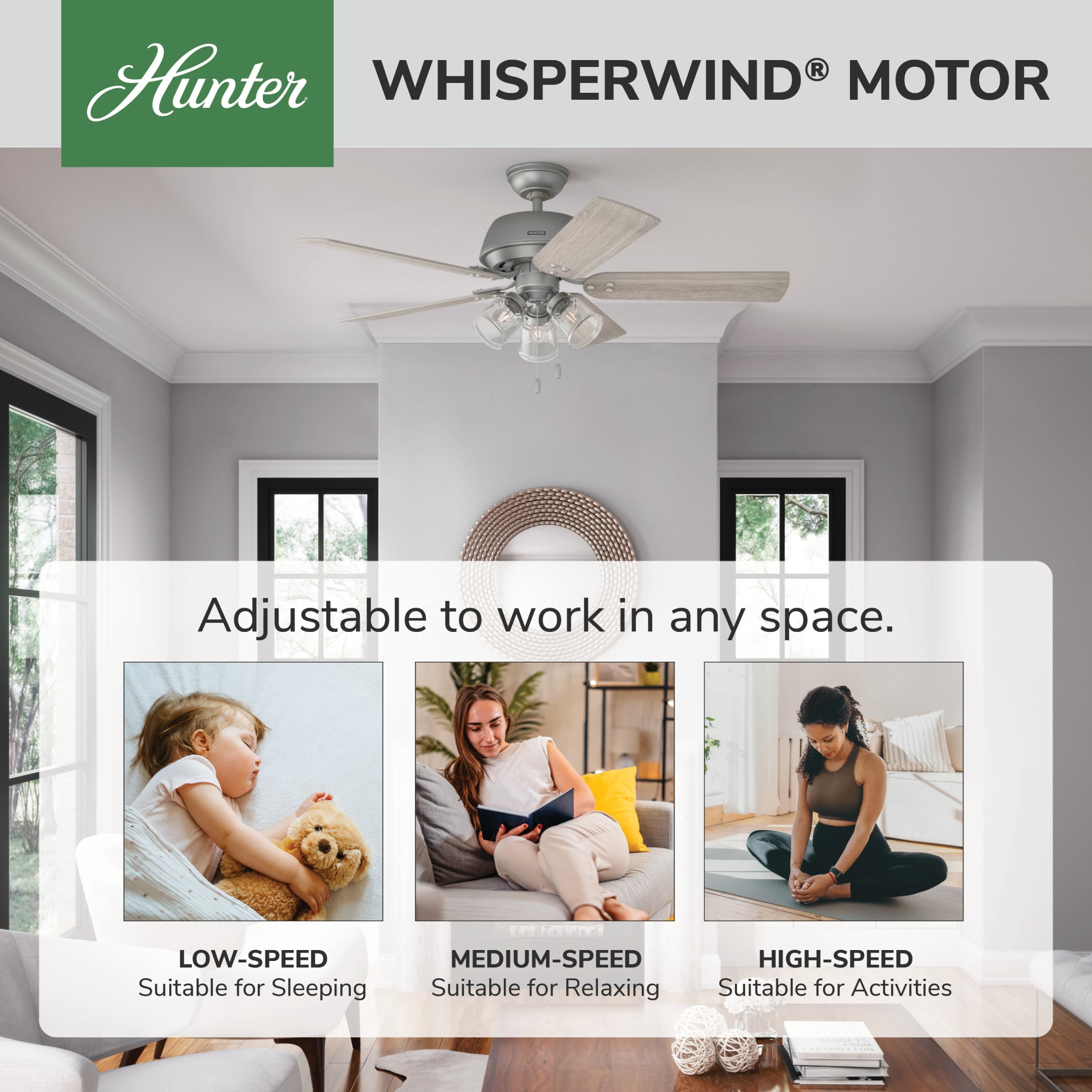 THE SHADY GROVE: A medium-sized, casual ceiling fan perfect for your bedroom CLEARLY BRIGHTER: TrueLight™ products are designed for modern bulbs that provide illumination and efficiency so you get the perfect brightness, every time PULL CHAINS: Includes pull chains for quick and easy on/off and speed adjustments PULL CHAINS: Includes pull chains for quick and easy on/off and speed adjustments AIRFLOW: Strong airflow up to 4791 cubic feet per minute (CFM) on high speed INDOOR ONLY: This ceiling fan is ETL rated for indoor use only, making it ideal for spaces like living rooms, bedrooms, home offices, and kitchens BULBS INCLUDED: Includes three, 4.5-Watt energy-efficient, long-lasting, dimmable LED bulbs LONGEVITY: Hunter performs twice the agency recommended testing to ensure their ceiling fans – from the finishes to the fan motor your Hunter will stand the test of time WARRANTY: Limited Lifetime Motor Warranty is backed by the only company with over 135 years in the fan business PREMIUM GLASS SHADING: The light kit includes premium clear glass shading FLIP THE BLADE: This fan features 5 reversible Light Gray Oak and Warm Grey Oak blades to help match your room’s design DOWNROD: Includes a single 3-inch downrod to ensure proper distance from the ceiling and optimize air movement WINTER AND SUMMER: Reversible motor allows you to change the direction of your fan from downdraft mode during the summer which helps cool the room to updraft mode during the winter to help circulate trapped warm air near the ceiling BLADE PITCH: 13-degree blade pitch optimized to ensure ideal air movement and peak performance