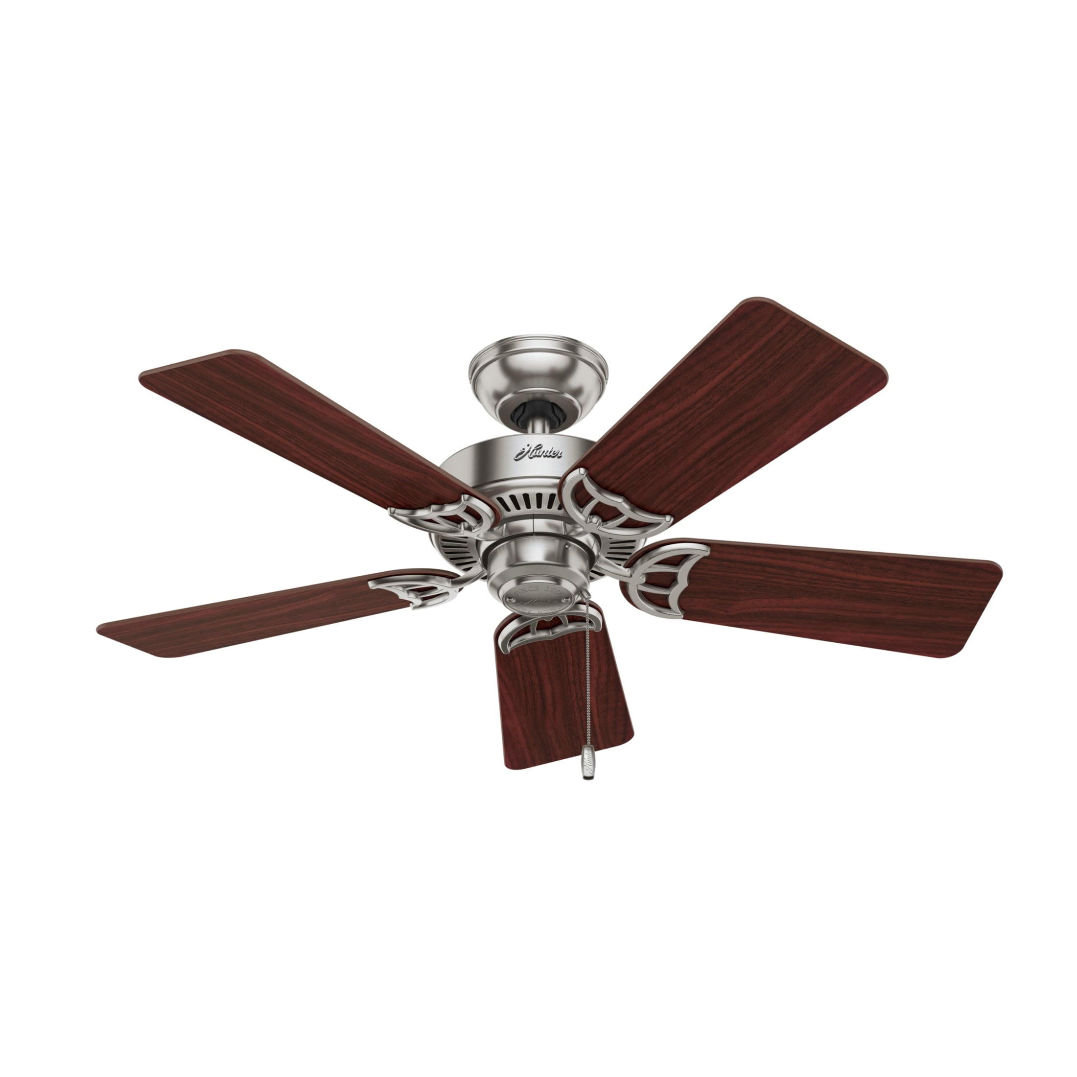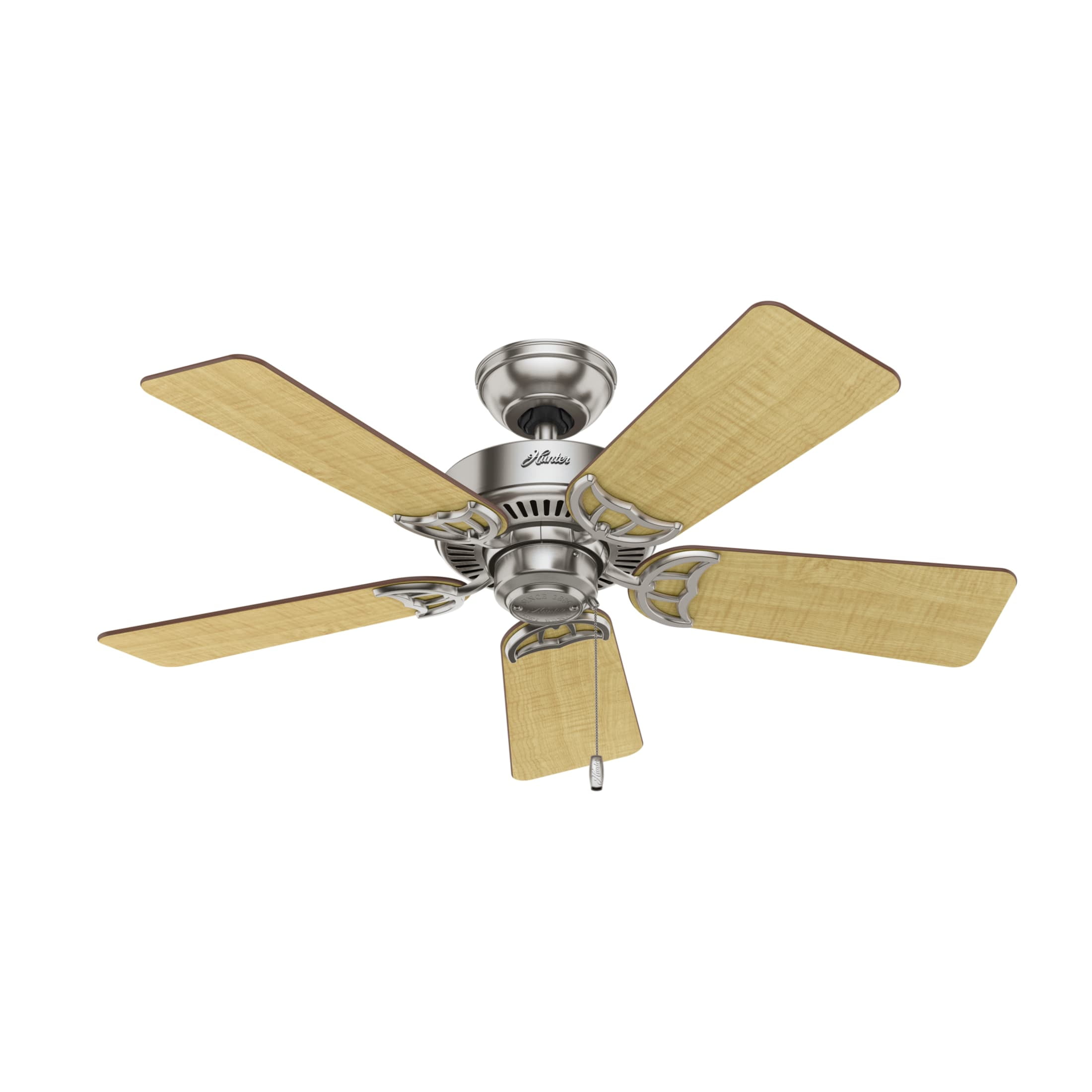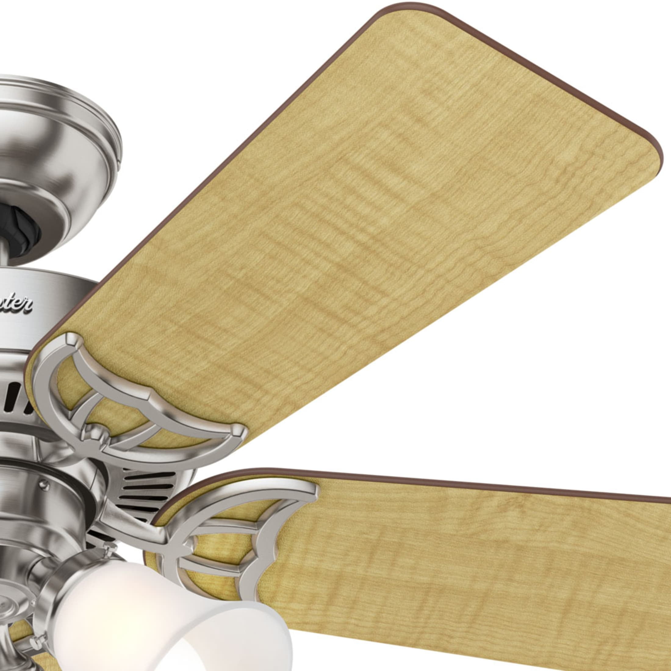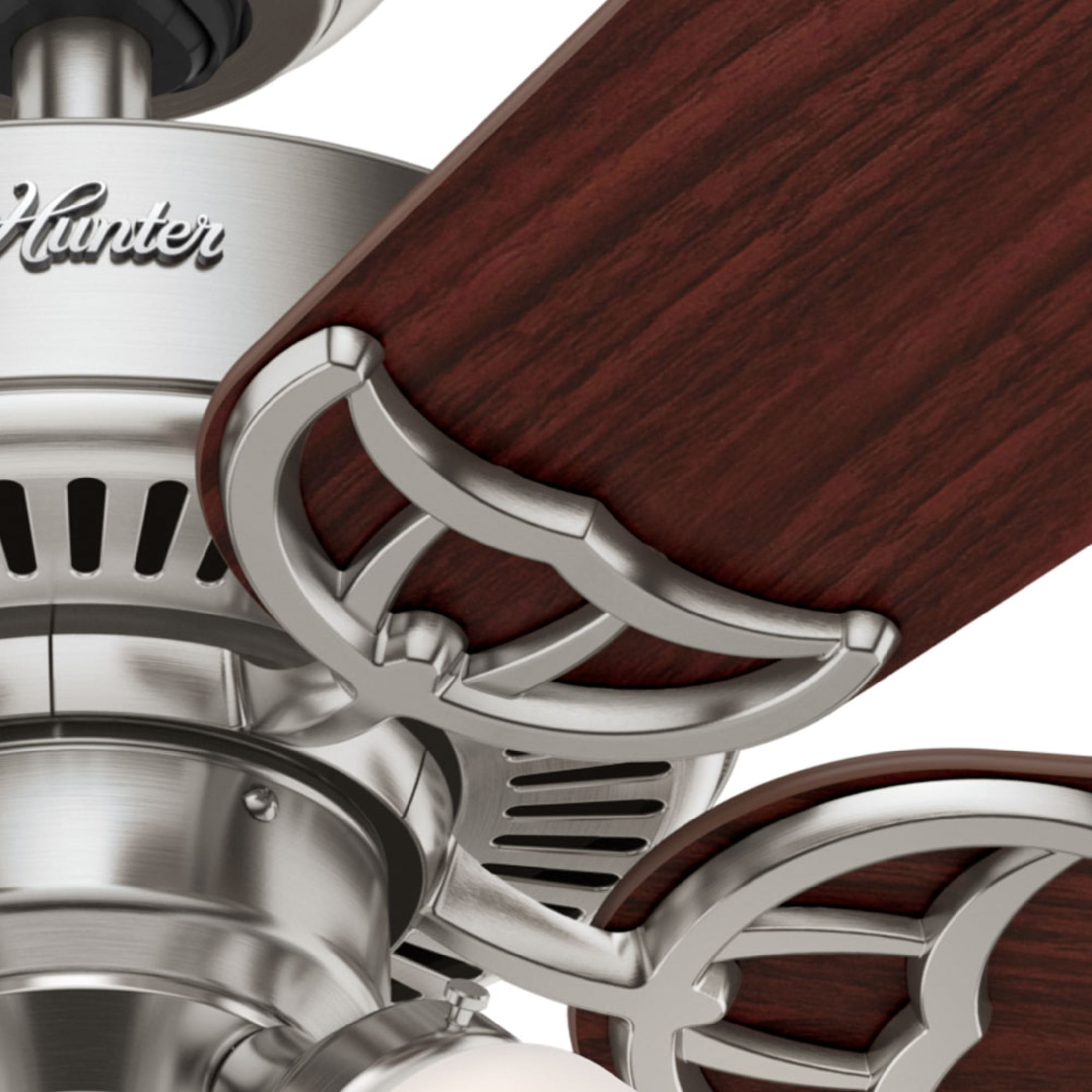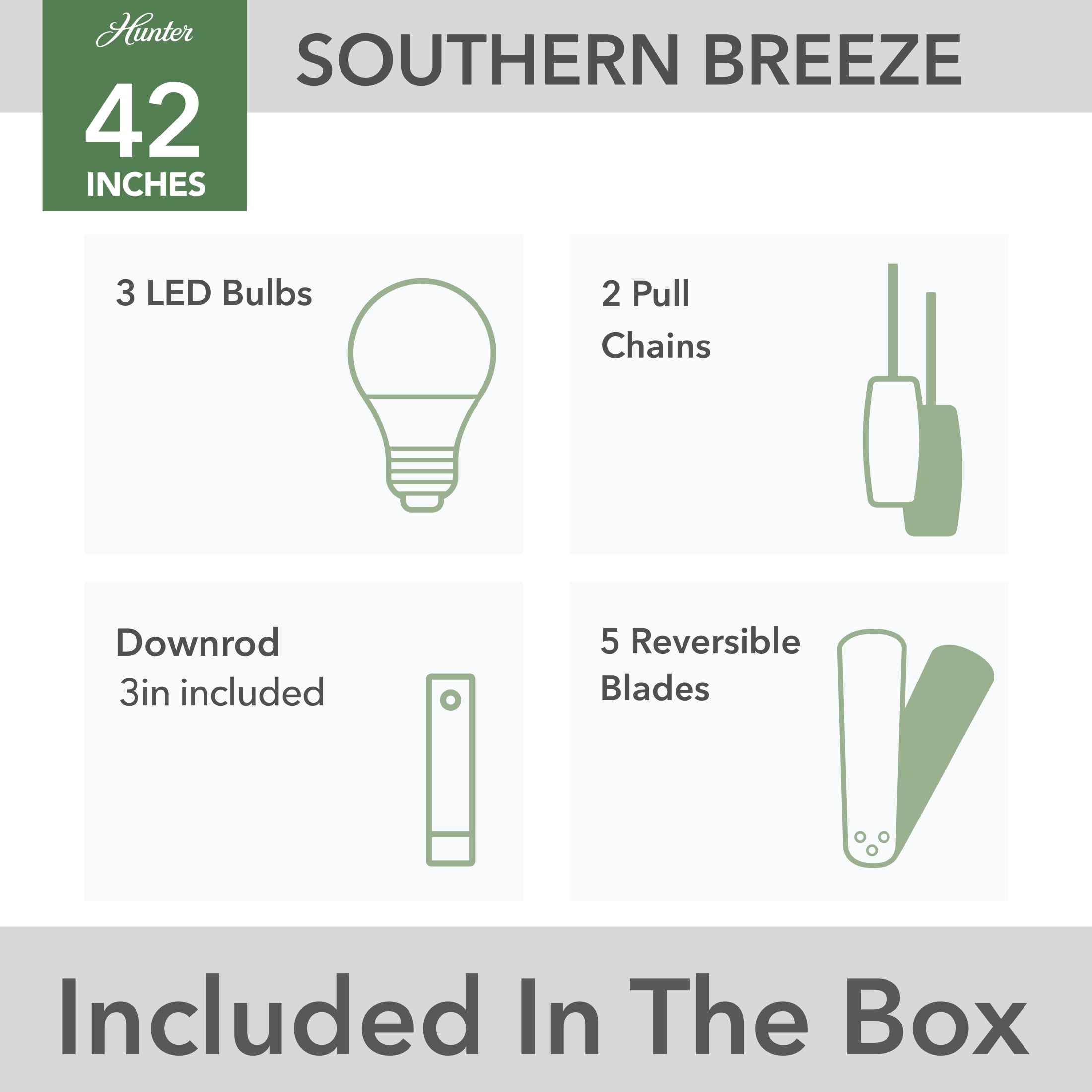 THE SOUTHERN BREEZE: A smaller-sized, traditional ceiling fan perfect for your foyer / entry way, craft / hobby room, dining room, mudroom / utility room, fitness room, kitchen, office, laundry room, bedroom CLEARLY BRIGHTER: TrueLight™ products are designed for modern bulbs that provide illumination and efficiency so you get the perfect brightness, every time PULL CHAINS: Includes pull chains for quick and easy on/off and speed adjustments PULL CHAINS: Includes pull chains for quick and easy on/off and speed adjustments AIRFLOW: Strong airflow up to 3241 cubic feet per minute (CFM) on high speed INDOOR ONLY: This ceiling fan is ETL rated for indoor use only, making it ideal for spaces like living rooms, bedrooms, home offices, and kitchens BULBS INCLUDED: Includes three, 9-Watt energy-efficient, long-lasting, dimmable LED bulbs LONGEVITY: Hunter performs twice the agency recommended testing to ensure their ceiling fans – from the finishes to the fan motor your Hunter will stand the test of time WARRANTY: Limited Lifetime Motor Warranty is backed by the only company with over 135 years in the fan business PREMIUM GLASS SHADING: The light kit includes premium clear frosted glass shading FLIP THE BLADE: This fan features 5 reversible Cherry and Maple blades to help match your room’s design DOWNROD: Includes a single 3-inch downrod to ensure proper distance from the ceiling and optimize air movement WINTER AND SUMMER: Reversible motor allows you to change the direction of your fan from downdraft mode during the summer which helps cool the room to updraft mode during the winter to help circulate trapped warm air near the ceiling BLADE PITCH: 13-degree blade pitch optimized to ensure ideal air movement and peak performance