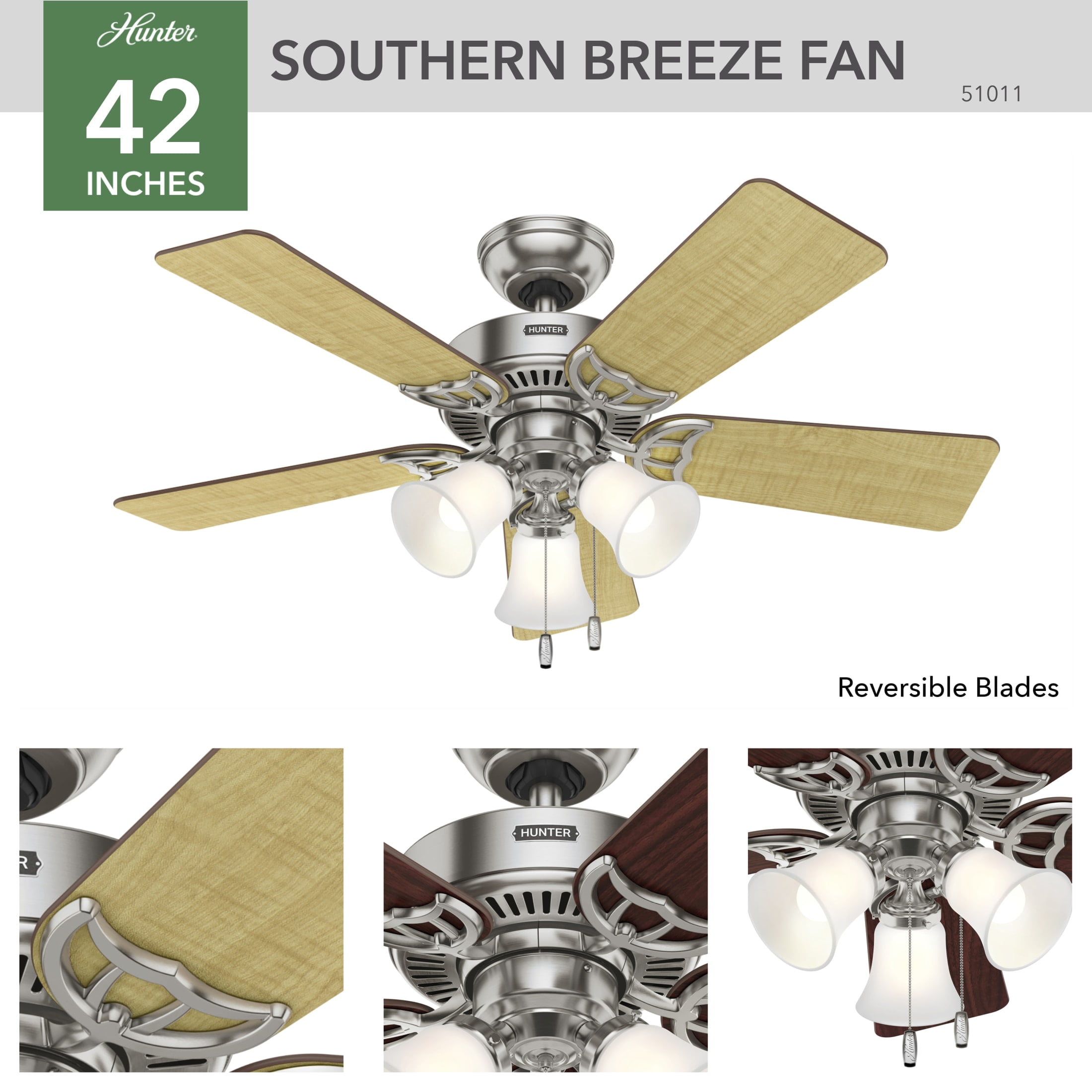 Hunter – Southern Breeze Indoor Ceiling Fan With Light, 42-inch, Brushed Nickel, Traditional-style, 3-speed WhisperWind Motor, 51011, for living rooms, bedrooms, home offices, kitchens