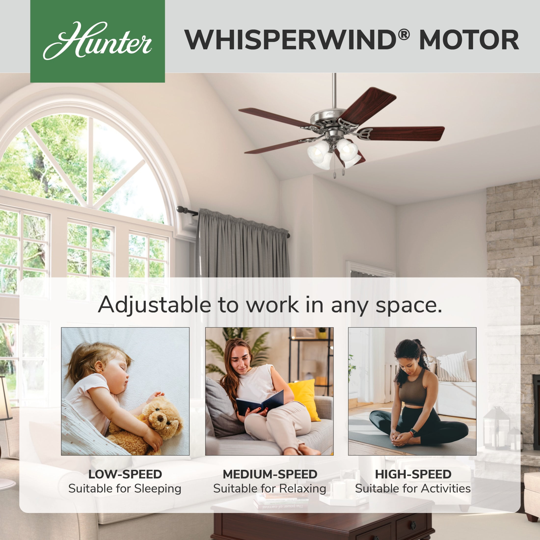 THE STUDIO SERIES: A medium-sized, traditional ceiling fan perfect for your master bedroom, dining room, bonus room / game room, office, bedroom, living room / great room CLEARLY BRIGHTER: TrueLight™ products are designed for modern bulbs that provide illumination and efficiency so you get the perfect brightness, every time PULL CHAINS: Includes pull chains for quick and easy on/off and speed adjustments PULL CHAINS: Includes pull chains for quick and easy on/off and speed adjustments AIRFLOW: Strong airflow up to 4412 cubic feet per minute (CFM) on high speed INDOOR ONLY: This ceiling fan is ETL rated for indoor use only, making it ideal for spaces like living rooms, bedrooms, home offices, and kitchens BULBS INCLUDED: Includes four, 7-Watt energy-efficient, long-lasting, dimmable LED bulbs LONGEVITY: Hunter performs twice the agency recommended testing to ensure their ceiling fans – from the finishes to the fan motor your Hunter will stand the test of time WARRANTY: Limited Lifetime Motor Warranty is backed by the only company with over 135 years in the fan business PREMIUM GLASS SHADING: The light kit includes premium clear frosted glass shading FLIP THE BLADE: This fan features 5 reversible Cherry and Maple blades to help match your room’s design DOWNROD: Includes a single 3-inch downrod to ensure proper distance from the ceiling and optimize air movement WINTER AND SUMMER: Reversible motor allows you to change the direction of your fan from downdraft mode during the summer which helps cool the room to updraft mode during the winter to help circulate trapped warm air near the ceiling BLADE PITCH: 13-degree blade pitch optimized to ensure ideal air movement and peak performance