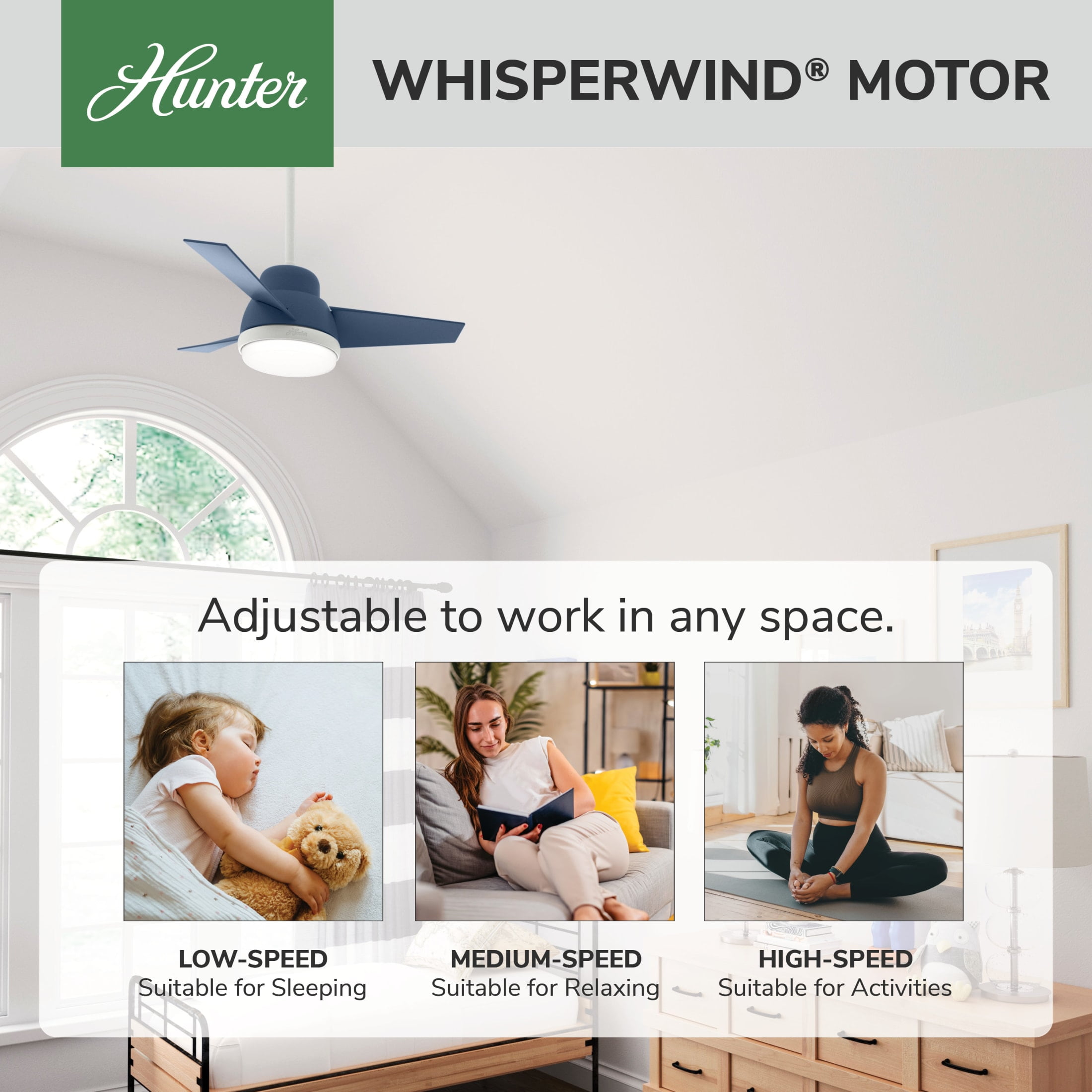 THE VALDA: A smaller-sized, casual ceiling fan perfect for your child’s bedroom, craft / hobby room, guest bedroom, bedroom, office, foyer / entry way CLEARLY BRIGHTER: TrueLight™ products are designed for modern bulbs that provide illumination and efficiency so you get the perfect brightness, every time SURESPEED AND WHISPERWIND: The 3-speed WhisperWind reversible motor and exclusive SureSpeed Technology deliver ultra-powerful airflow for high-speed cooling with quiet performance PREMIUM CONTROL: Handheld remote included for easy fan adjustments from anywhere in the room AIRFLOW: Strong airflow up to 2934 cubic feet per minute (CFM) on high speed INDOOR ONLY: This ceiling fan is ETL rated for indoor use only, making it ideal for spaces like living rooms, bedrooms, home offices, and kitchens BULBS INCLUDED: Includes two, 9-Watt energy-efficient, long-lasting, dimmable LED bulbs LONGEVITY: Hunter performs twice the agency recommended testing to ensure their ceiling fans – from the finishes to the fan motor your Hunter will stand the test of time WARRANTY: Limited Lifetime Motor Warranty is backed by the only company with over 135 years in the fan business PREMIUM GLASS SHADING: The light kit includes premium white lens glass shading DOWNROD: Includes a single 2-inch downrod to ensure proper distance from the ceiling and optimize air movement WINTER AND SUMMER: Reversible motor allows you to change the direction of your fan from downdraft mode during the summer which helps cool the room to updraft mode during the winter to help circulate trapped warm air near the ceiling BLADE PITCH: 13-degree blade pitch optimized to ensure ideal air movement and peak performance