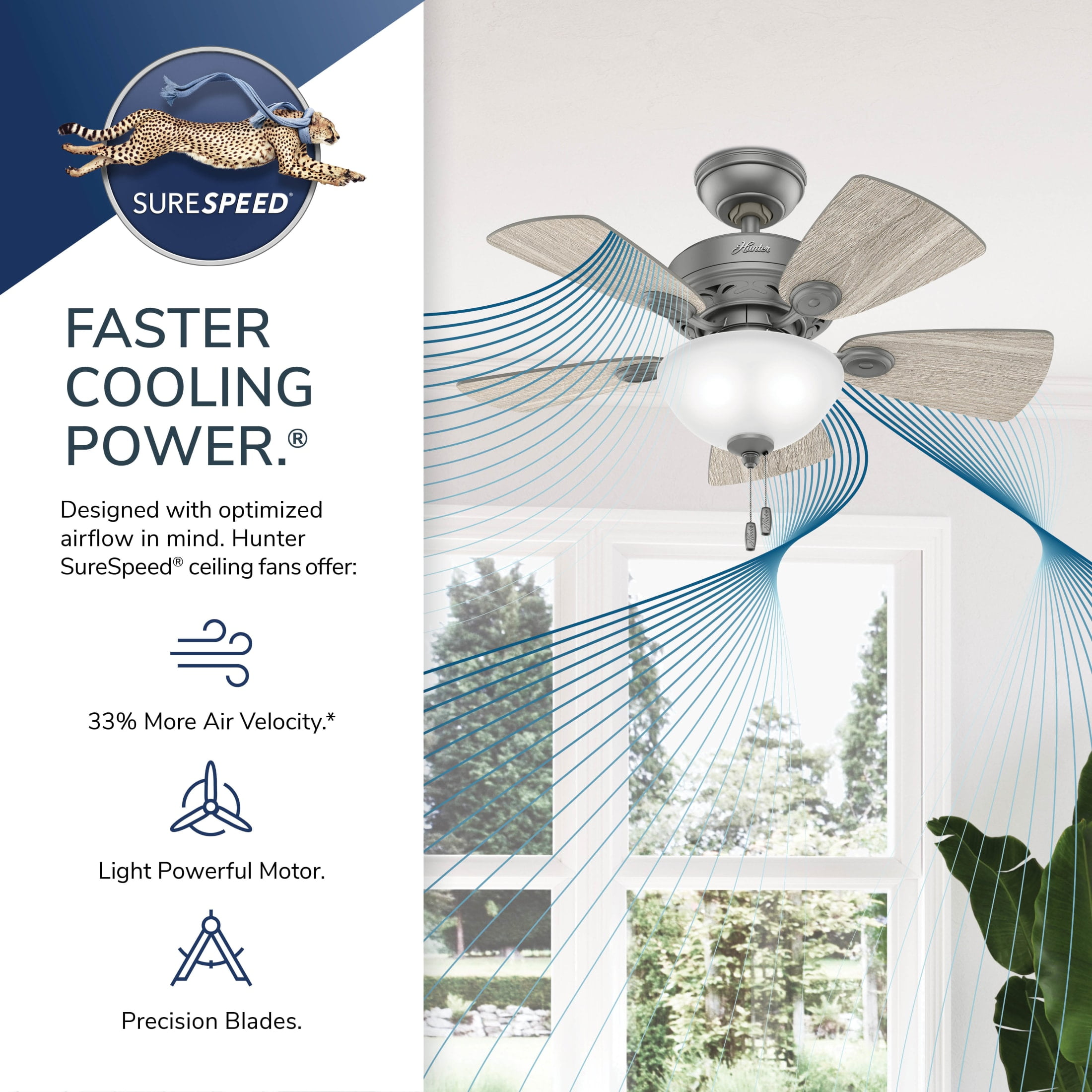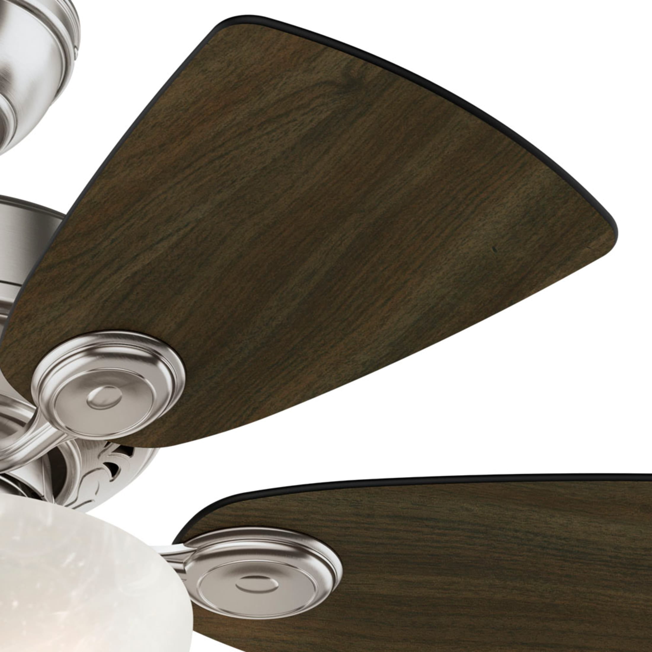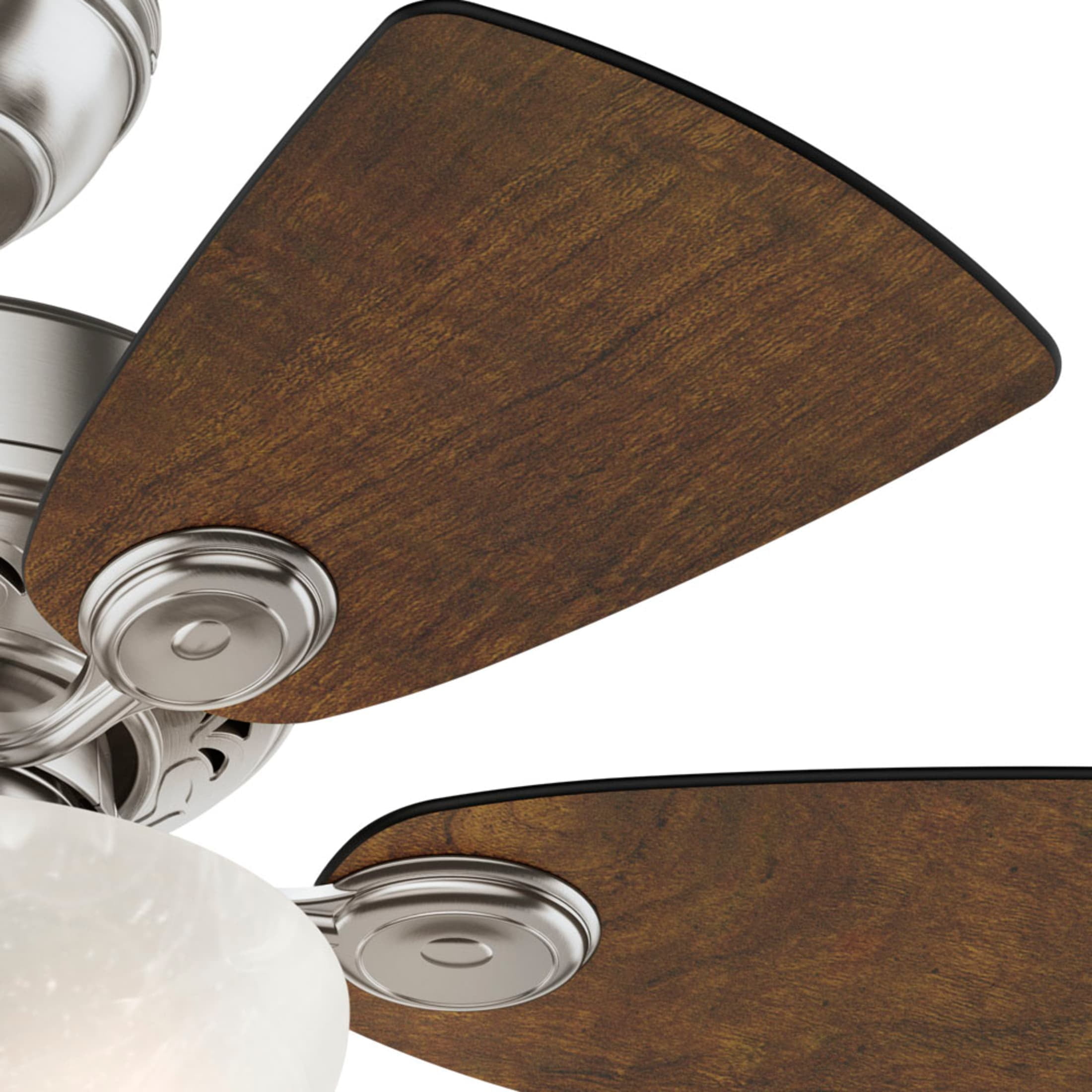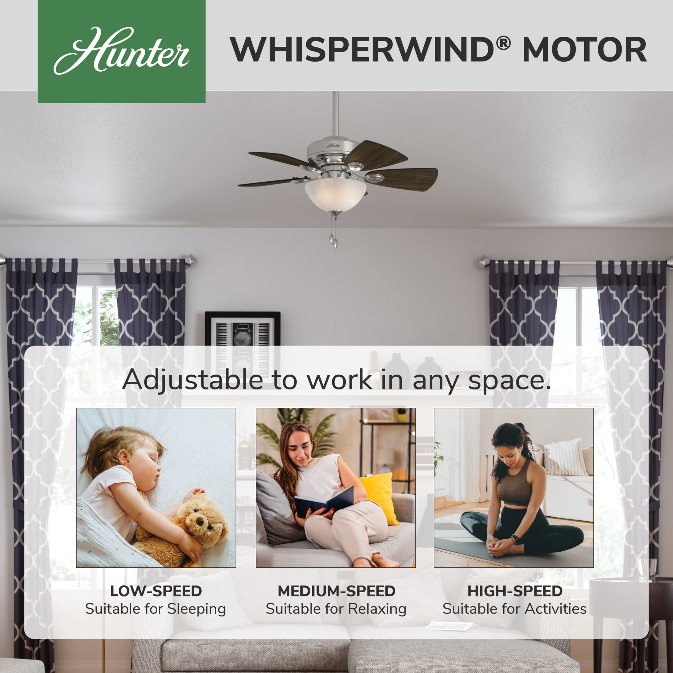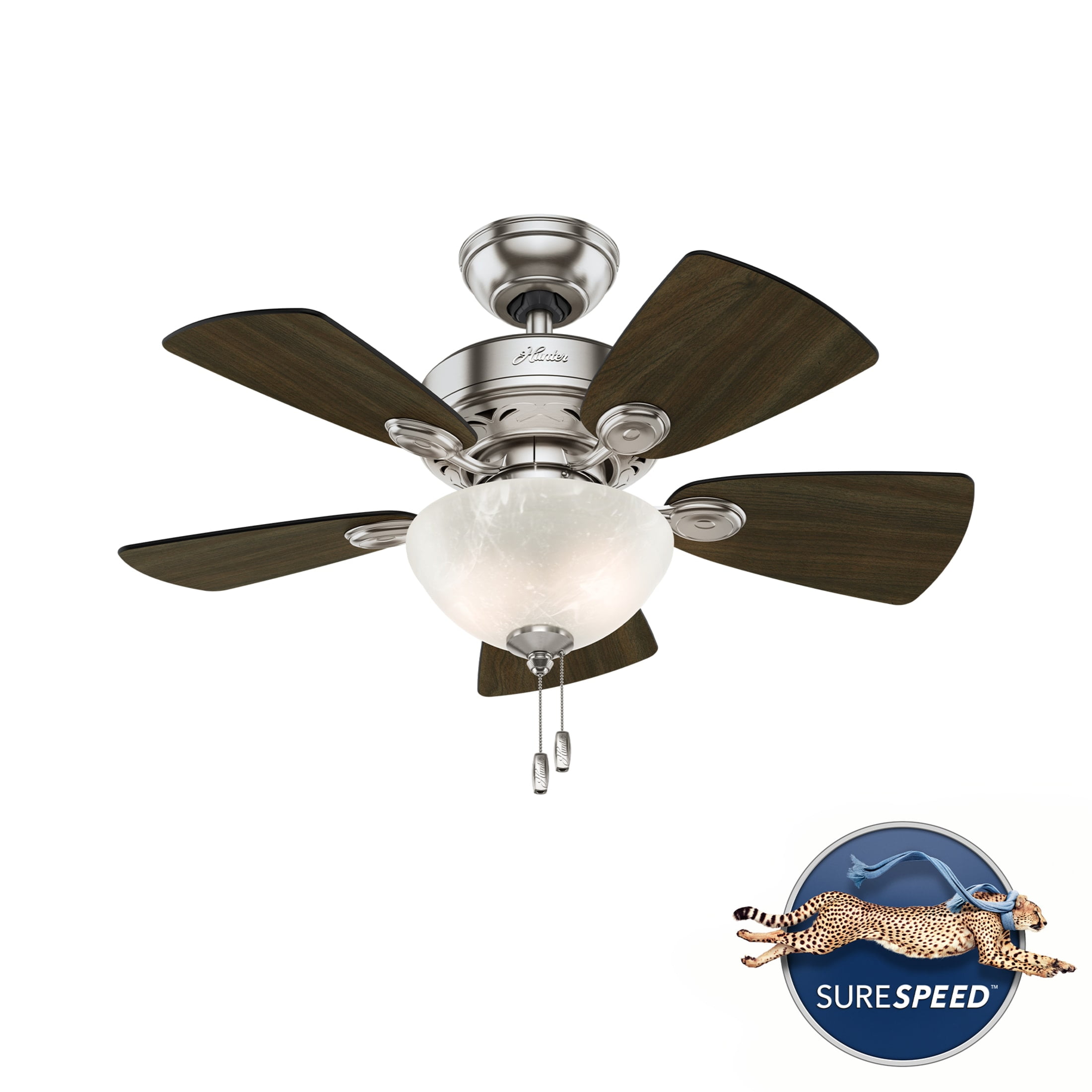 THE WATSON: A smaller-sized, traditional ceiling fan perfect for your foyer / entry way, craft / hobby room, mudroom / utility room, kitchen, laundry room, bedroom, office CLEARLY BRIGHTER: TrueLight™ products are designed for modern bulbs that provide illumination and efficiency so you get the perfect brightness, every time SURESPEED AND WHISPERWIND: The 3-speed WhisperWind reversible motor and exclusive SureSpeed Technology deliver ultra-powerful airflow for high-speed cooling with quiet performance PULL CHAINS: Includes pull chains for quick and easy on/off and speed adjustments PULL CHAINS: Includes pull chains for quick and easy on/off and speed adjustments AIRFLOW: Strong airflow up to 3113 cubic feet per minute (CFM) on high speed INDOOR ONLY: This ceiling fan is ETL rated for indoor use only, making it ideal for spaces like living rooms, bedrooms, home offices, and kitchens BULBS INCLUDED: Includes two, 7-Watt energy-efficient, long-lasting, dimmable LED bulbs LONGEVITY: Hunter performs twice the agency recommended testing to ensure their ceiling fans – from the finishes to the fan motor your Hunter will stand the test of time WARRANTY: Limited Lifetime Motor Warranty is backed by the only company with over 135 years in the fan business PREMIUM GLASS SHADING: The light kit includes premium swirled marble glass shading FLIP THE BLADE: This fan features 5 reversible Dark Walnut and Cherry blades to help match your room’s design DOWNROD: Includes a single 2-inch downrod to ensure proper distance from the ceiling and optimize air movement WINTER AND SUMMER: Reversible motor allows you to change the direction of your fan from downdraft mode during the summer which helps cool the room to updraft mode during the winter to help circulate trapped warm air near the ceiling BLADE PITCH: 13-degree blade pitch optimized to ensure ideal air movement and peak performance