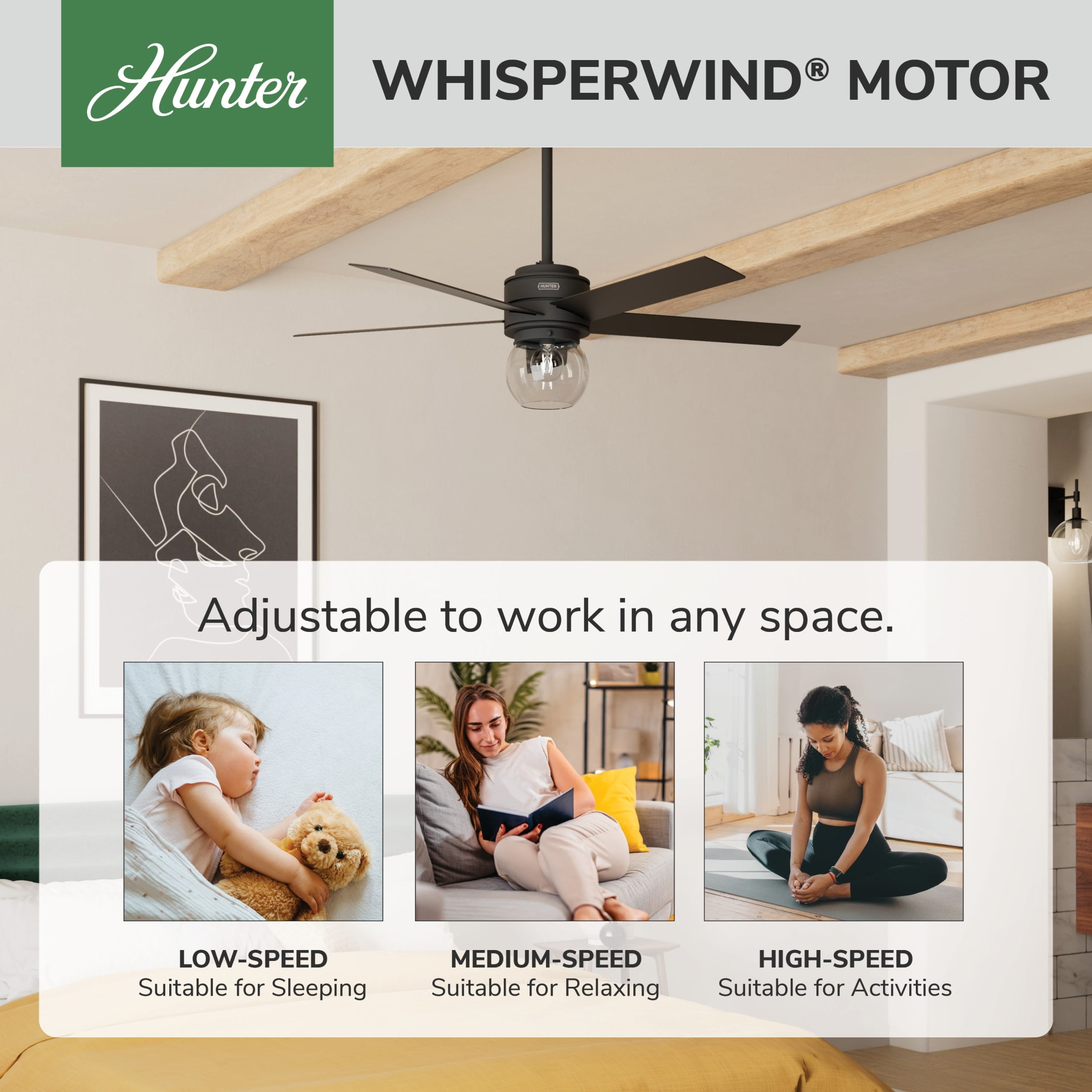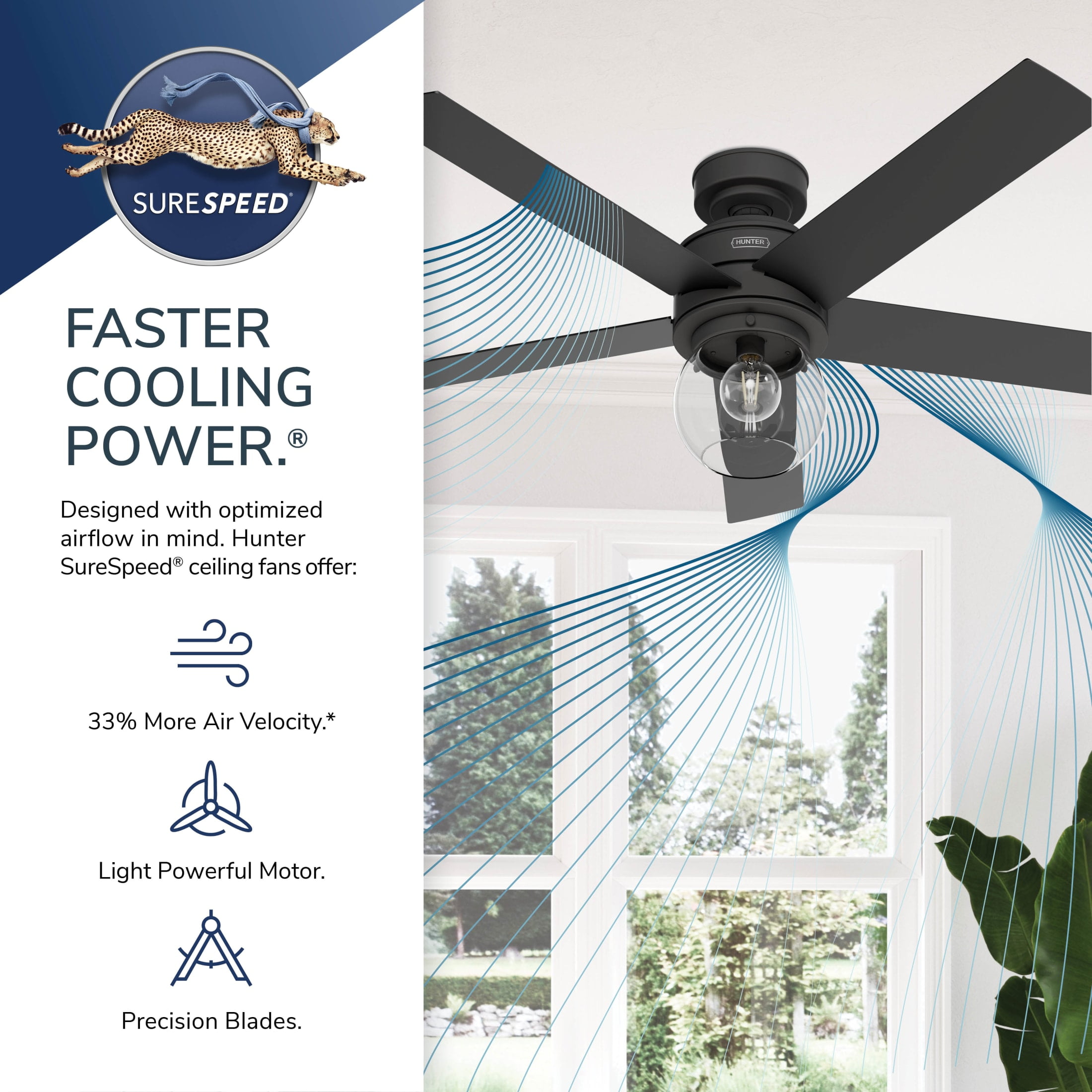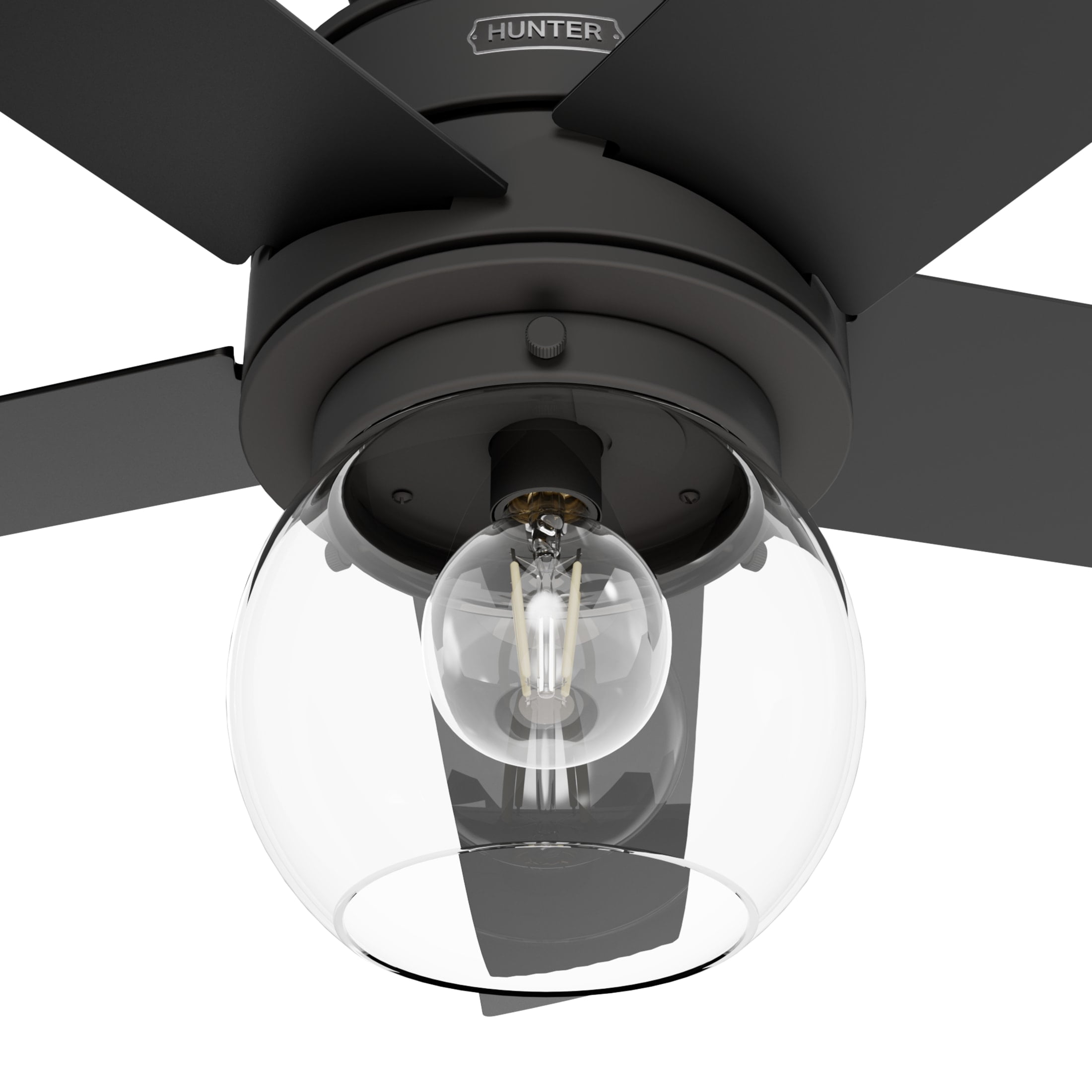 THE XIDANE: A medium-sized, casual ceiling fan perfect for your living room / great room CLEARLY BRIGHTER: TrueLight™ products are designed for modern bulbs that provide illumination and efficiency so you get the perfect brightness, every time SURESPEED AND WHISPERWIND: The 3-speed WhisperWind reversible motor and exclusive SureSpeed Technology deliver ultra-powerful airflow for high-speed cooling with quiet performance PREMIUM CONTROL: Handheld remote included for easy fan adjustments from anywhere in the room AIRFLOW: Strong airflow up to 5150 cubic feet per minute (CFM) on high speed INDOOR ONLY: This ceiling fan is ETL rated for indoor use only, making it ideal for spaces like living rooms, bedrooms, home offices, and kitchens BULBS INCLUDED: Includes one, 6.2-Watt energy-efficient, long-lasting, dimmable LED bulb LONGEVITY: Hunter performs twice the agency recommended testing to ensure their ceiling fans – from the finishes to the fan motor your Hunter will stand the test of time WARRANTY: Limited Lifetime Motor Warranty is backed by the only company with over 135 years in the fan business PREMIUM GLASS SHADING: The light kit includes premium clear glass shading DOWNROD: Includes a single 2-inch downrod to ensure proper distance from the ceiling and optimize air movement WINTER AND SUMMER: Reversible motor allows you to change the direction of your fan from downdraft mode during the summer which helps cool the room to updraft mode during the winter to help circulate trapped warm air near the ceiling BLADE PITCH: 13-degree blade pitch optimized to ensure ideal air movement and peak performance