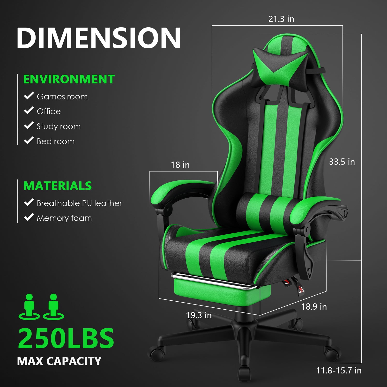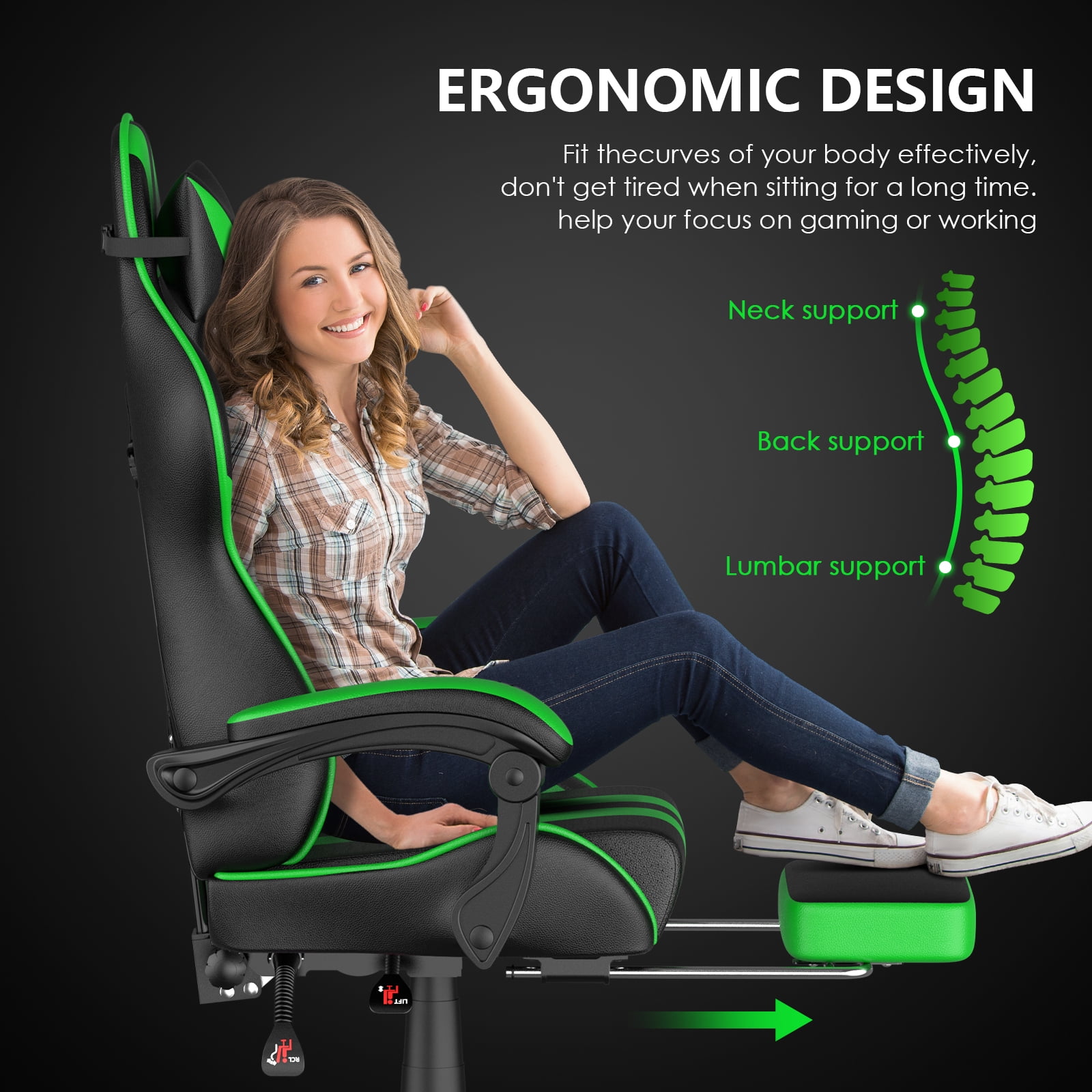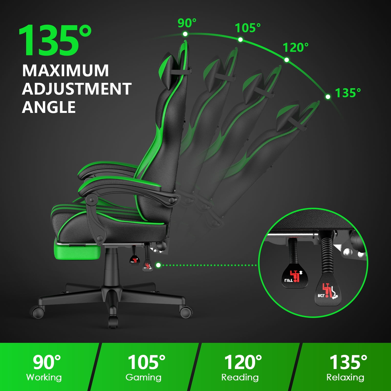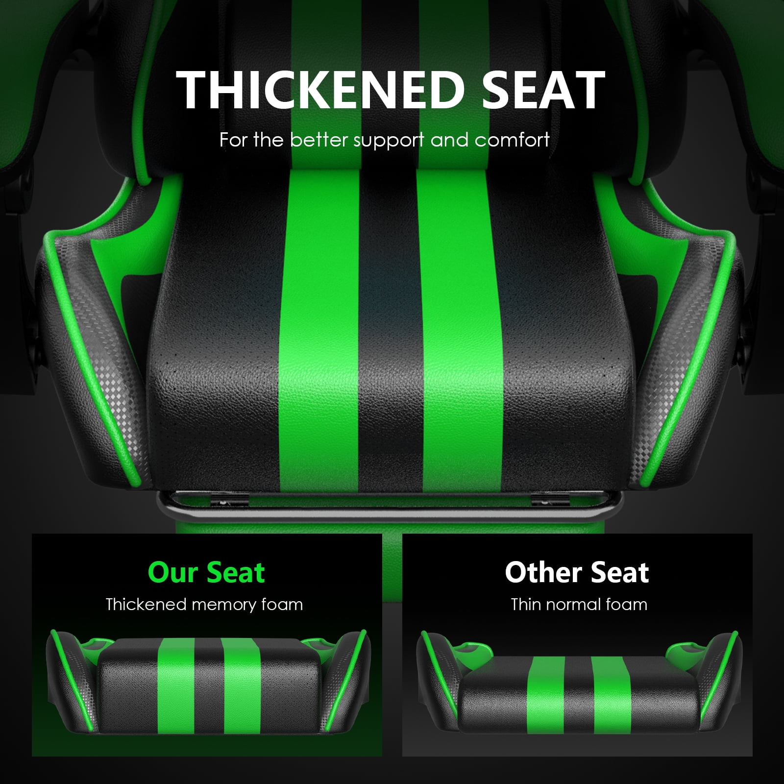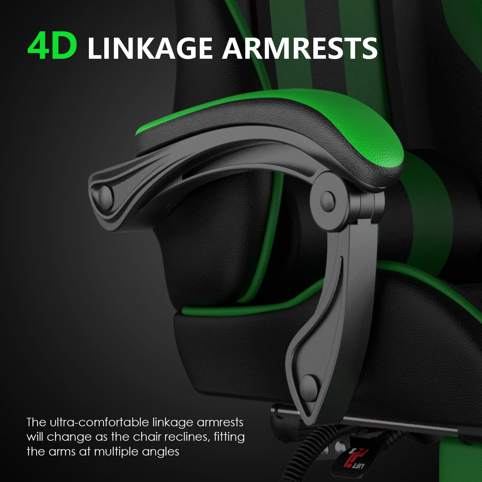 Huracan Gaming Chair for Adults High Back Gaming Chair with Footrest & Massage Lumbar Pillow Adjustable Height Office Chair with Headrest, Ergonomic Swivel Gamer Chair, Green