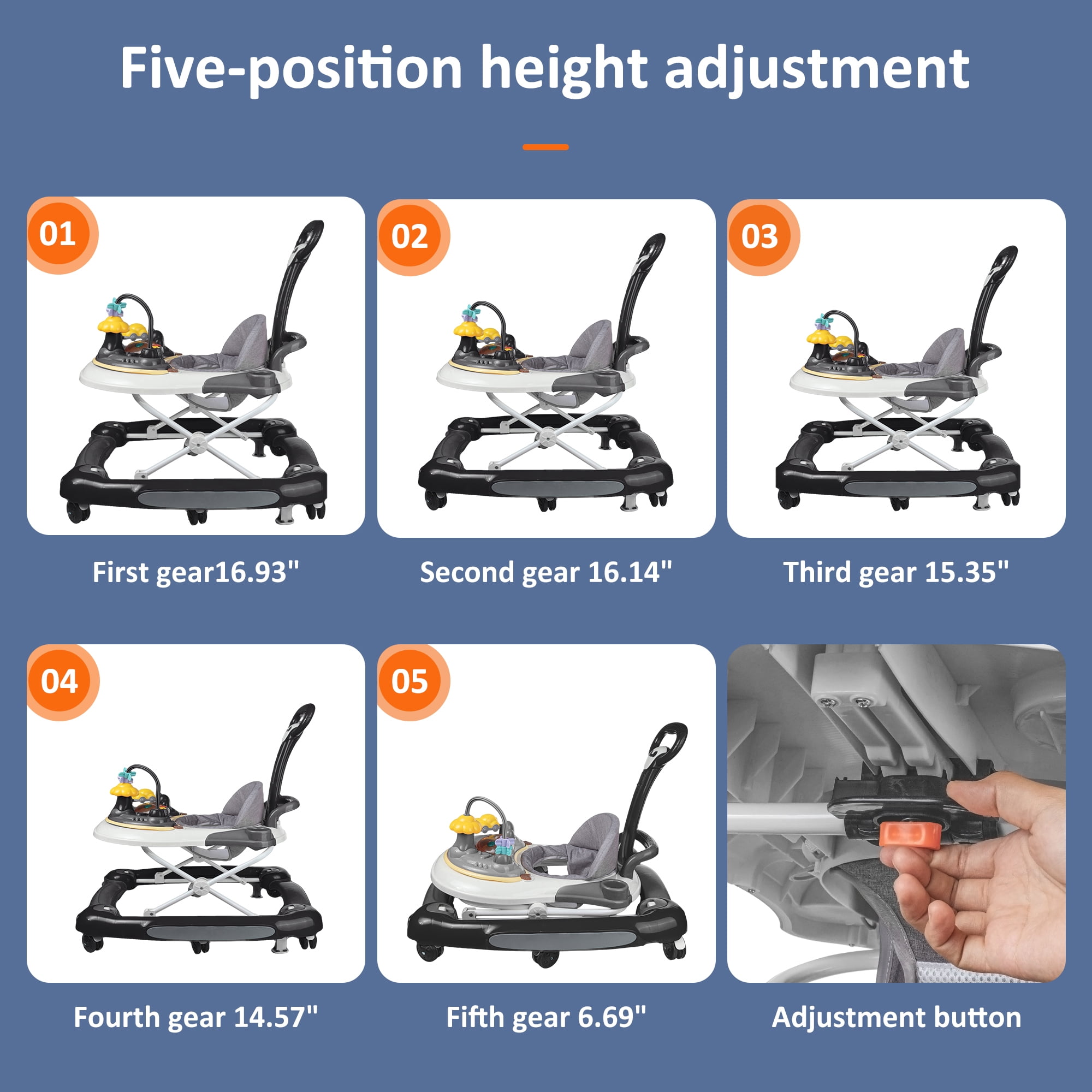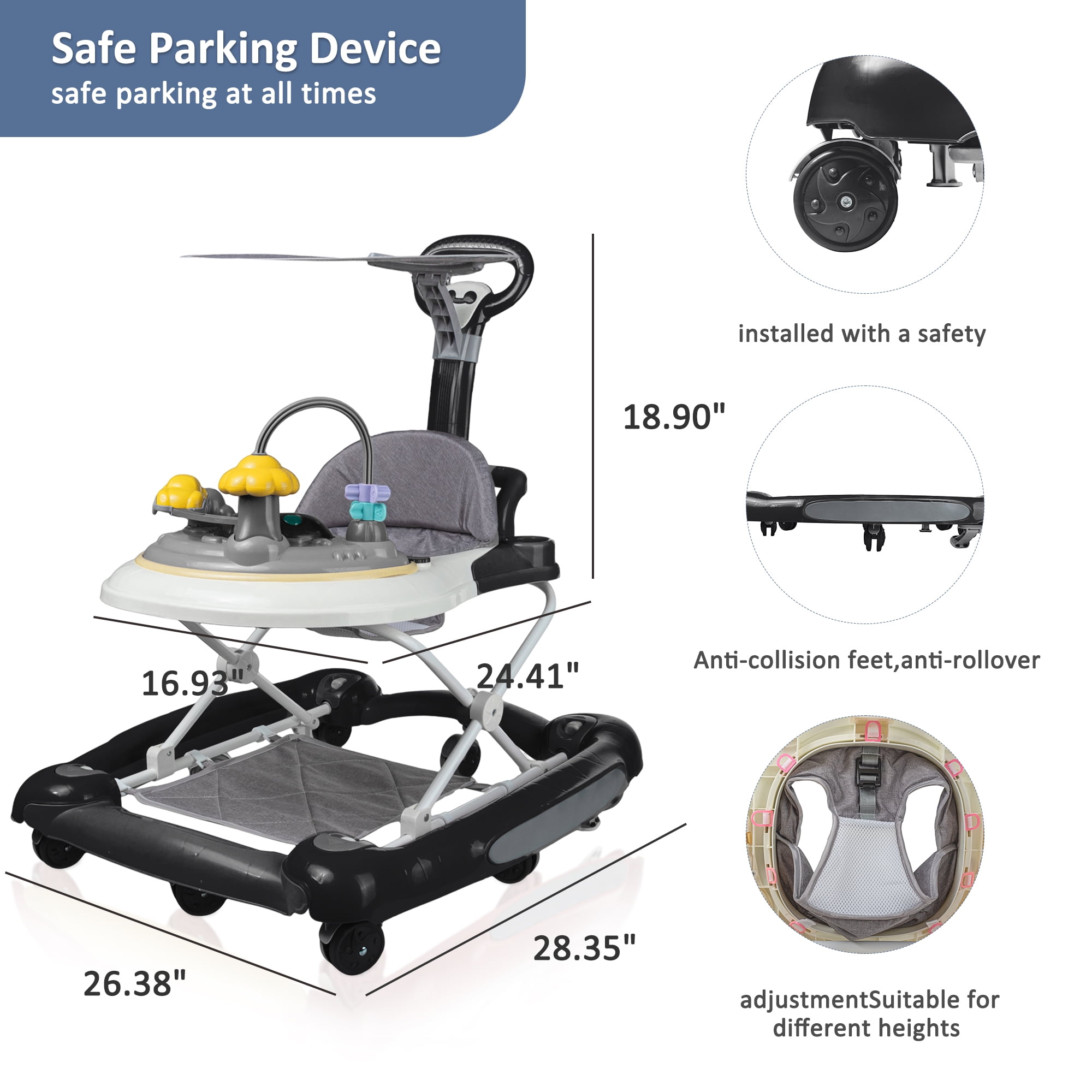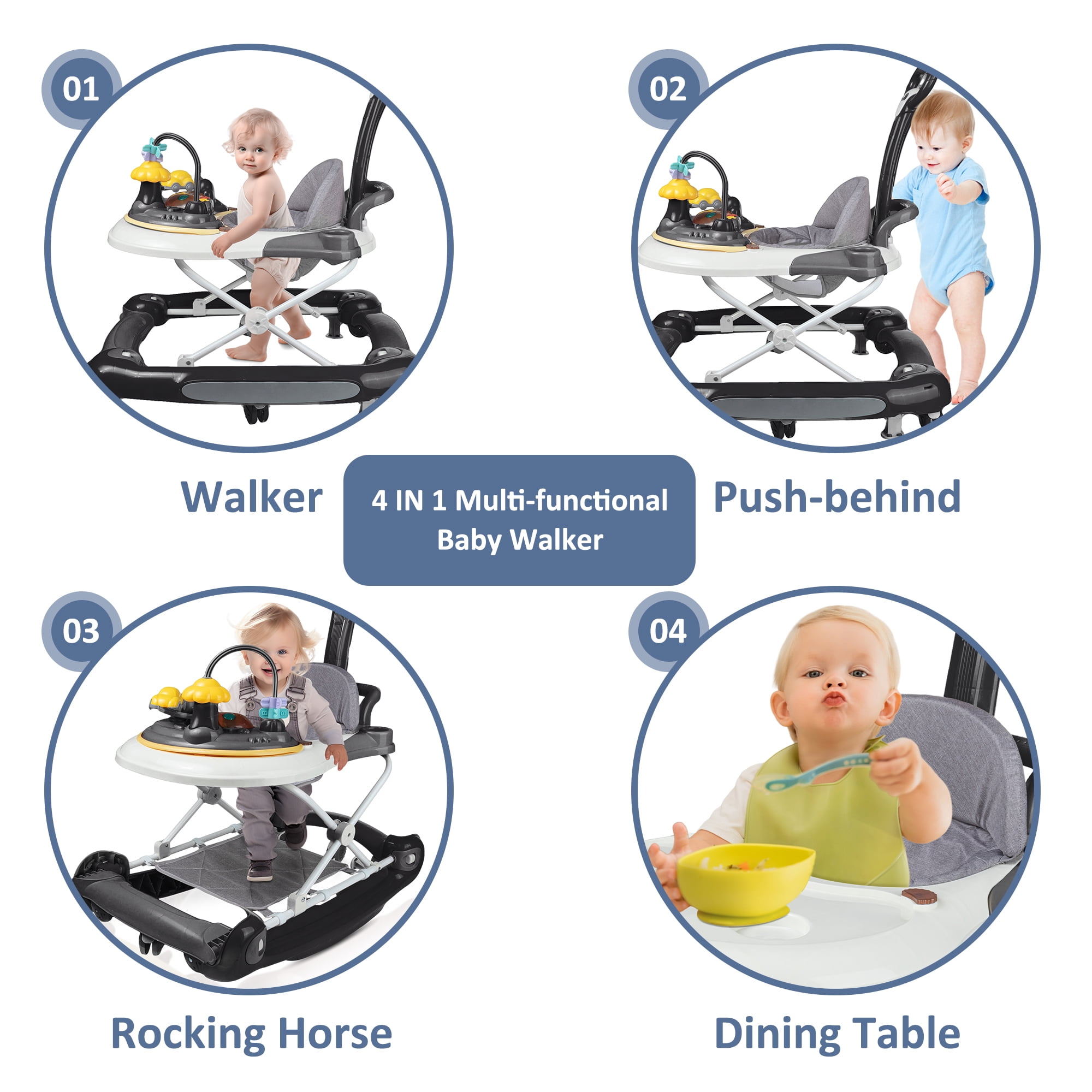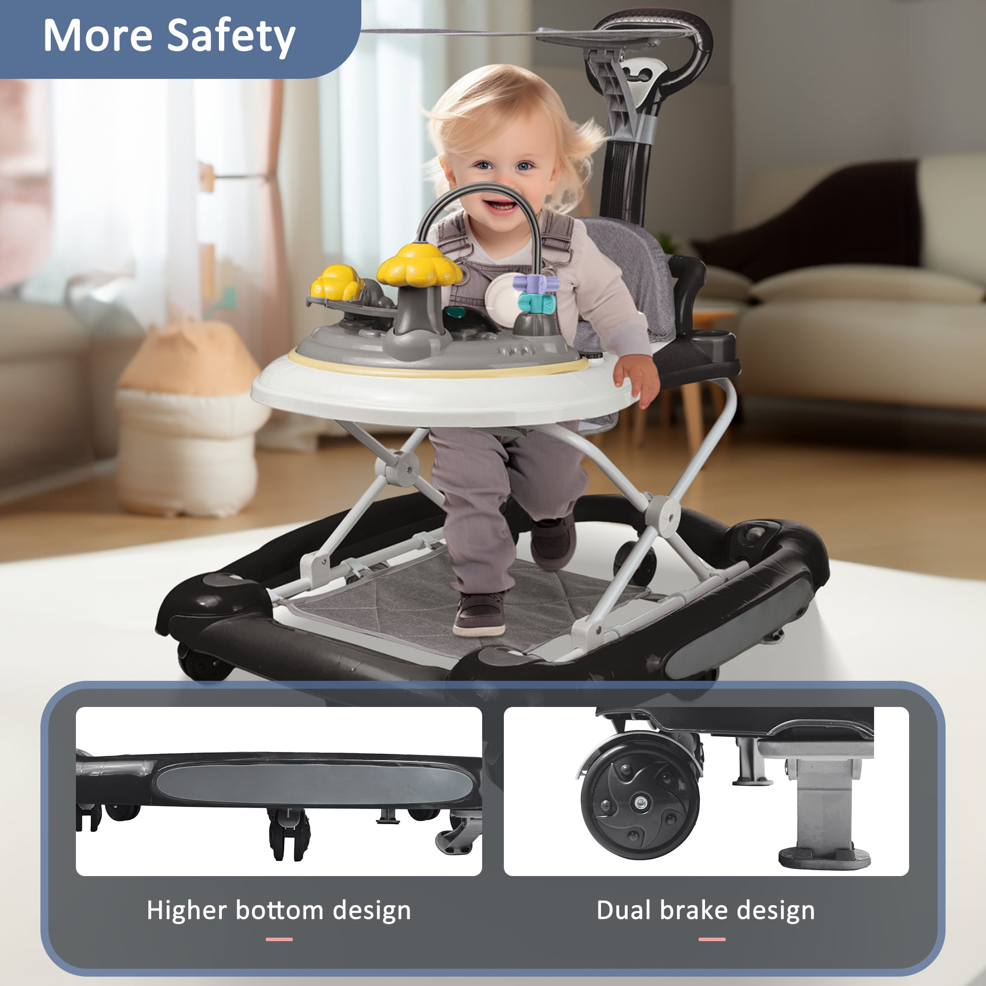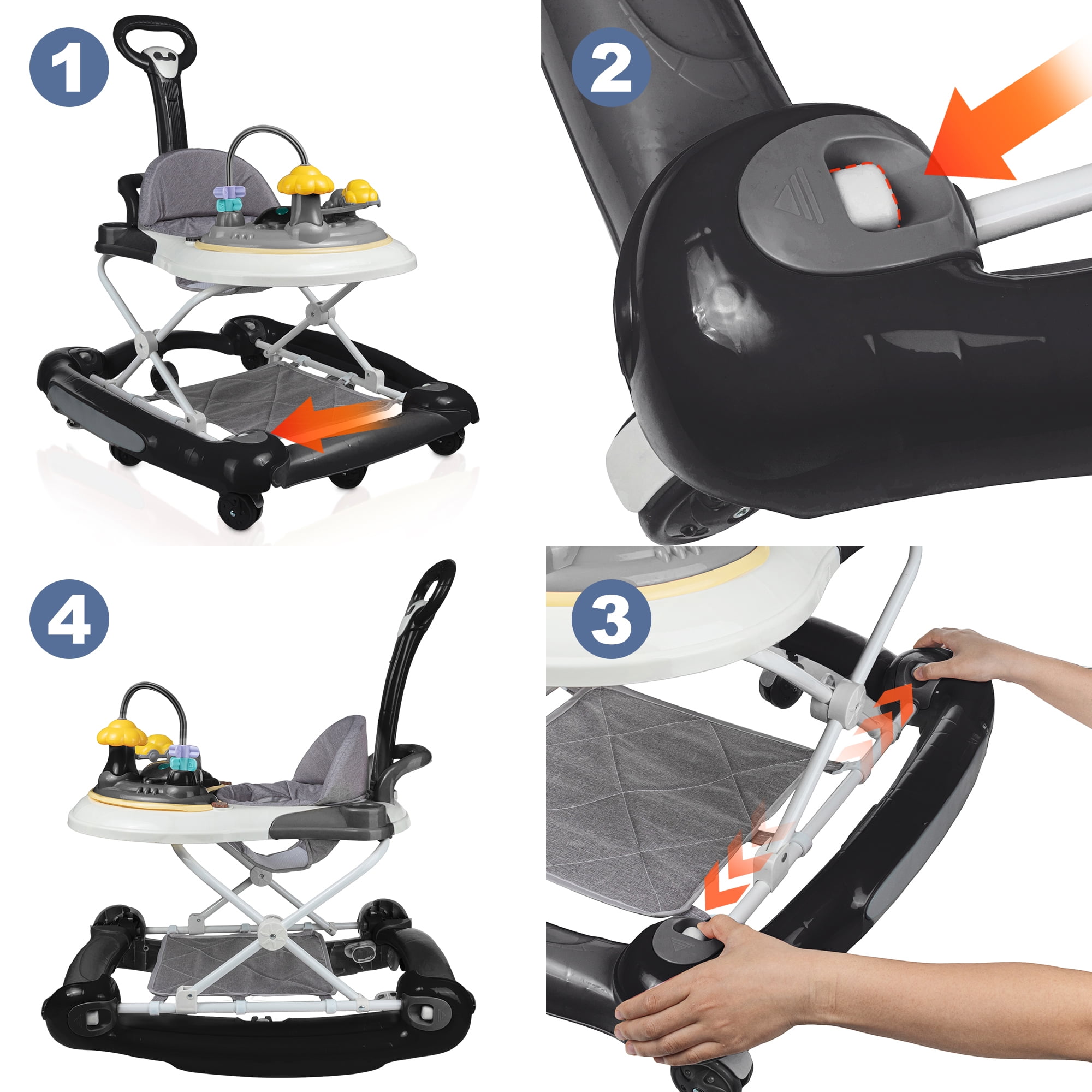 HAOUUCYIN 4-in-1 Baby Walker, Music Activity Push Walker with Wheel, Foldable and Height Adjustable, Black