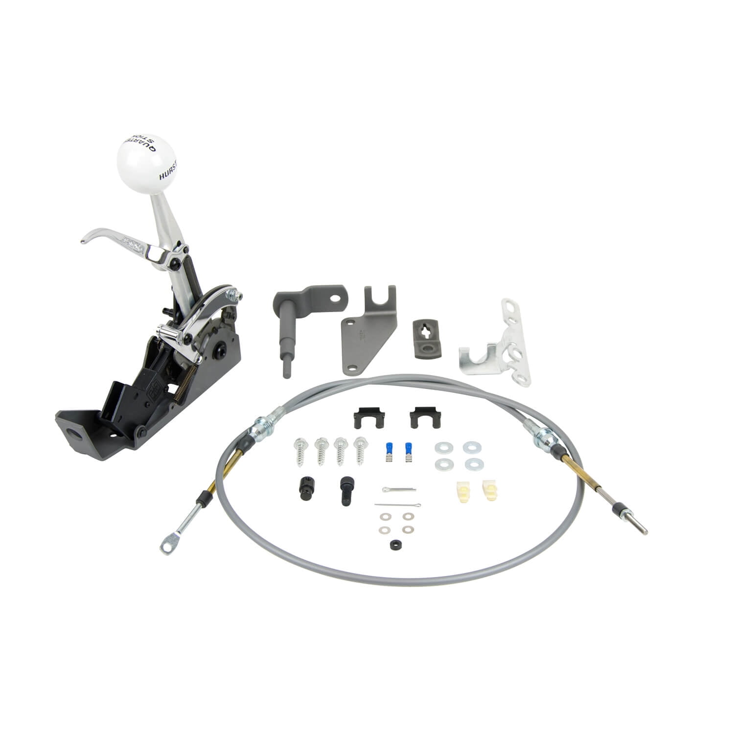 Compatible with GM Powerglide transmission Fwd/Rev Pattern.; The Hurst® Quarter Stick® shifter provides positive gear change control for both street and race applications. Its compact size fits easily in race cars with limited space and is very lightweight at only 2.5 pounds. Features include black oxide coated steel construction, 1018 hardened steel gate plate, forged aluminum shift stick with 7/16-20 tpi and a classic white Hurst® shift knob. Other features include factory installed neutral safety switch, chrome-plated reluctor, and a spring-loaded reverse Loc/Out mechanism that complies with NHRA/IHRA safety rules. Includes all necessary hardware, a 5-foot long shifter cable, and complete installation instructions. Note: Optional aluminum mounting bracket, backup light switch and lightweight aluminum or plastic shifter covers available separately. Does not fit early GM cast iron PG transmission.;
