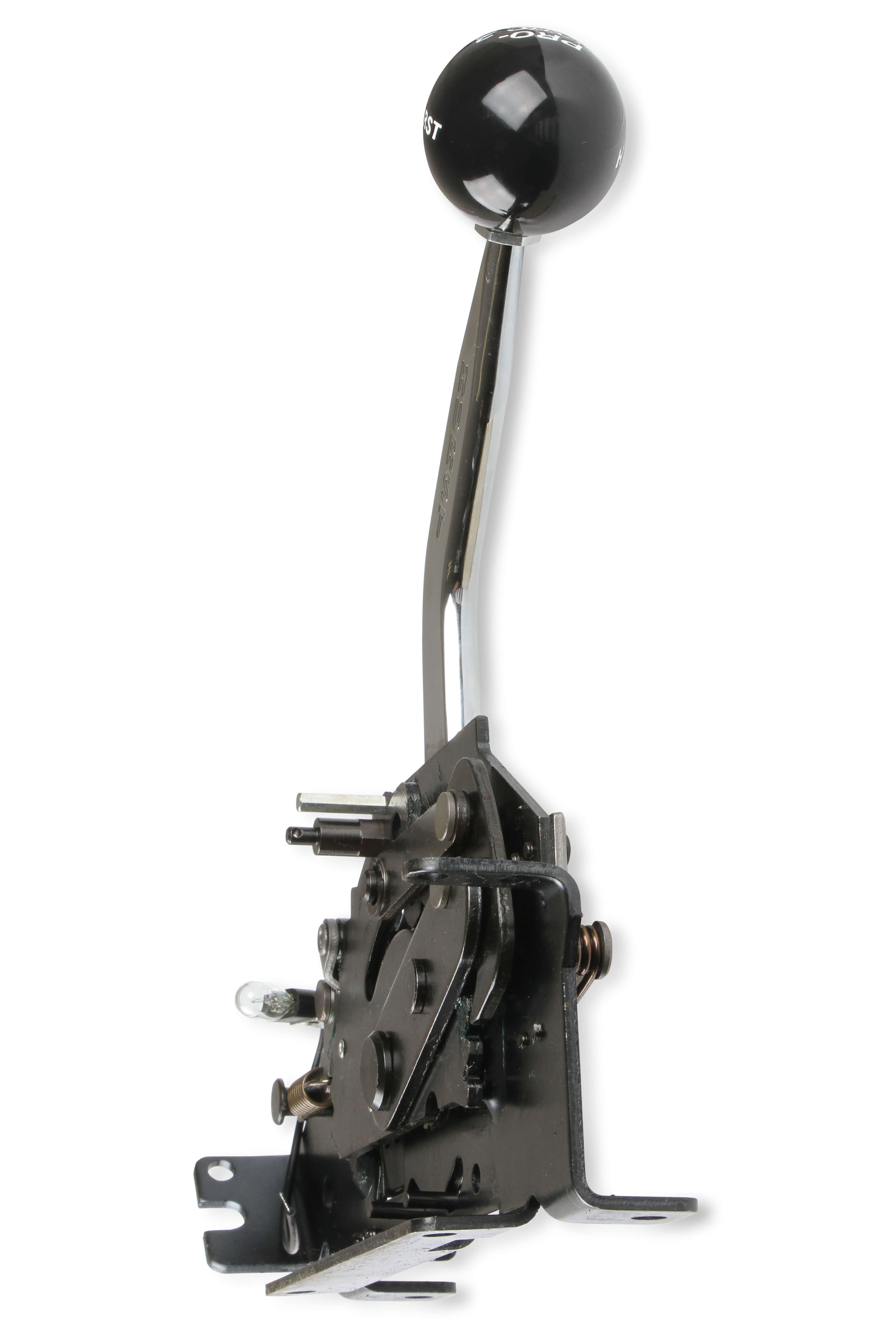 Universal 3-speed Automatic Ratchet Shifter; The Hurst® Pro-Matic®2 ratchet shifter with its chrome-plated stick and black knob is quality engineered for years of precise, trouble-free operation. Once the shifter is installed, the textured console and brilliant top cover that can be trimmed to fit any floor contour integrates the shifter with the interior. While easy on the eyes, this shifter is not all about looks. On the street, you will enjoy the ride as you freely tap the stick from gear to gear. If you decide to transfer your beauty of a machine to the track, give it all you’ve got because this shifter is built to handle the most powerful shifts and the special positive reverse Loc/Out meets NHRA and IHRA technical requirements. This shifter comes complete with all the hardware required to make installation a breeze including a 5-ft long heavy-duty shifter cable and instructions. Also includes a neutral safety and back-up light switch assembly. Notes: Ford AOD transmissions require B&M cable bracket & lever kit 40496. Compatible with Fwd/Rev pattern valve bodies. Overall Dimensions 12.65L x 5.6W x 11.5H;