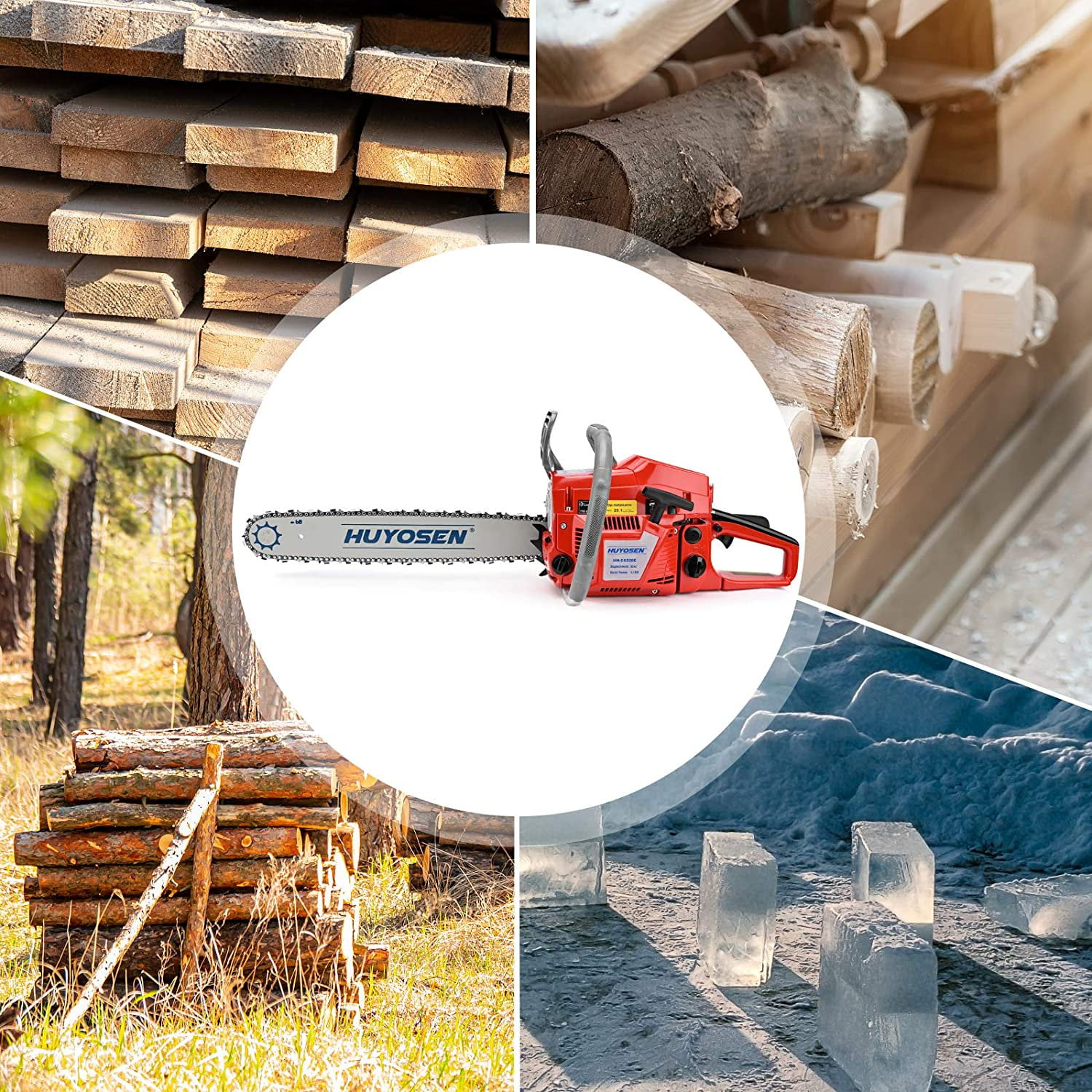 HUYOSEN 20” 62cc 2-Cycle Gas Powered Chainsaw, Automatic Oiling System, Low-Kickback Bar High Output Engine: 62CC 4.1HP gas powered chainsaw with 20-inch bar and chain for cutting wood, trees, and ice cubes with an engine speed of up to 8500 rpm Air Filter and Chain: Fitted with a filtration system for longer air filter life and reduced fuel consumption; tough, wear-resistant, and sharp chain for fast cutting Automatic Filling Oil: Automatic oil supply system reduces wear on the chain and guide bar, increasing service life Comfortable and Safety Design: Ergonomic design with cushion wrap handle for comfort during extended use; equipped with a safety switch for quick stops Durable Construction: Made with new ABS plastic materials that can withstand high temperatures and resist aging Easy Start Mechanism: Features a big rope wheel and easier starter for effortless starting Safety Features: Includes a safety valve throttle switch for added protection Reliable Performance: Engineered polymer chassis designed for prolonged use and reliability Super Air Filter System: Extends the life of the chainsaw with efficient air filtration Specification Engine: 1E48F Displacement: 62CC Rated Input Power: 4.1HP Fuel Tank Capacity: 750ml Oil Tank Capacity: 400ml Idling Speed: 8500r/min Two-Cycle Oil/Gasoline Mixing Ratio: 1:25 Adjustable Automatic Chain Lubrication Package Content 1 X 20″ guide bar 1 X 20″ saw chain (pitch: 3/8″, gauge:.058″, drive link count: 76) 1 X Instruction Manual 1 X Tool Kit 1 X 2L Fuel Mixing Bottle
