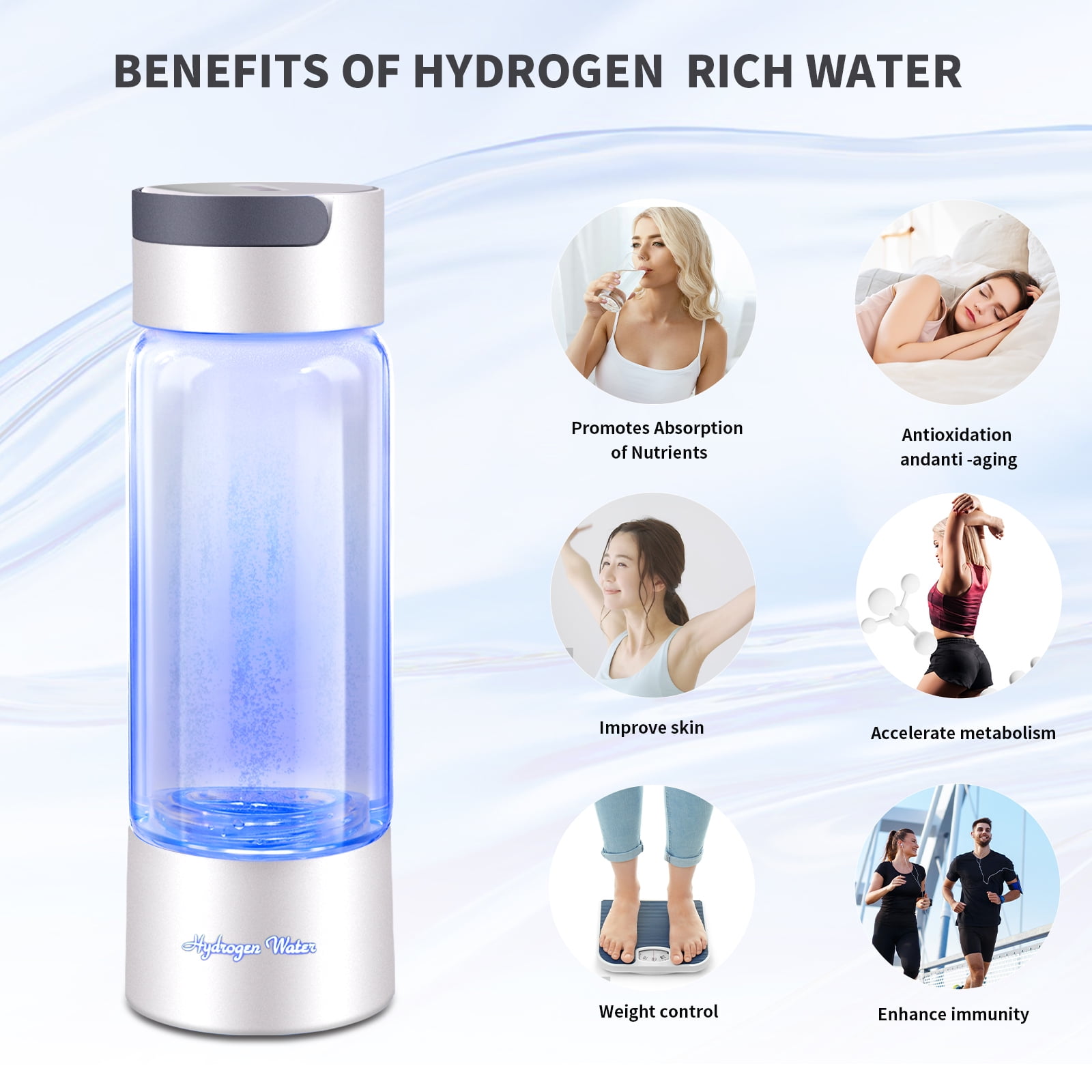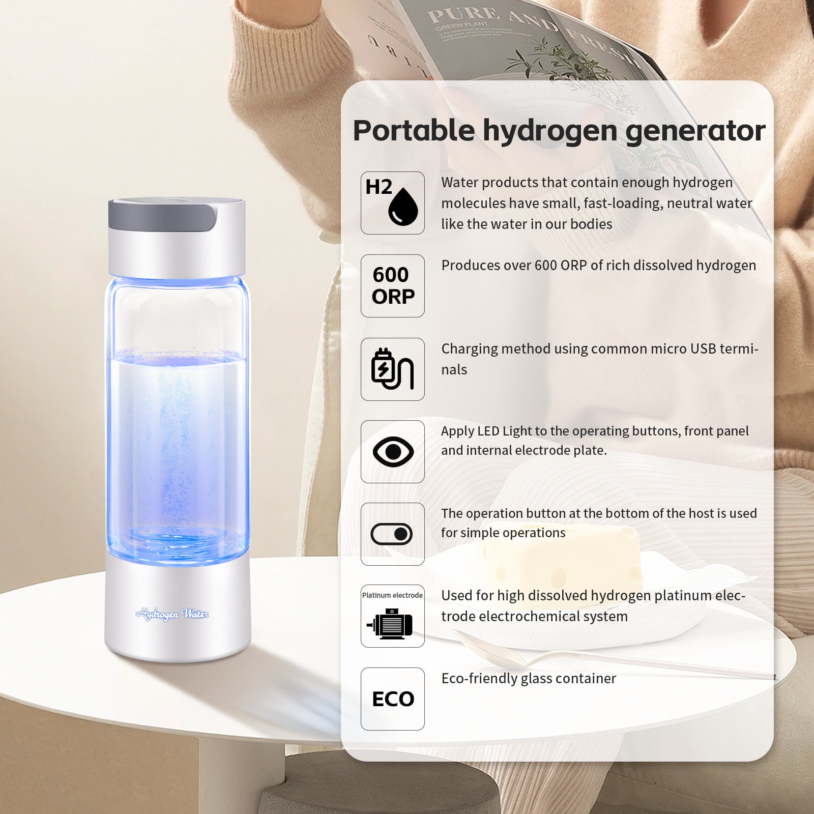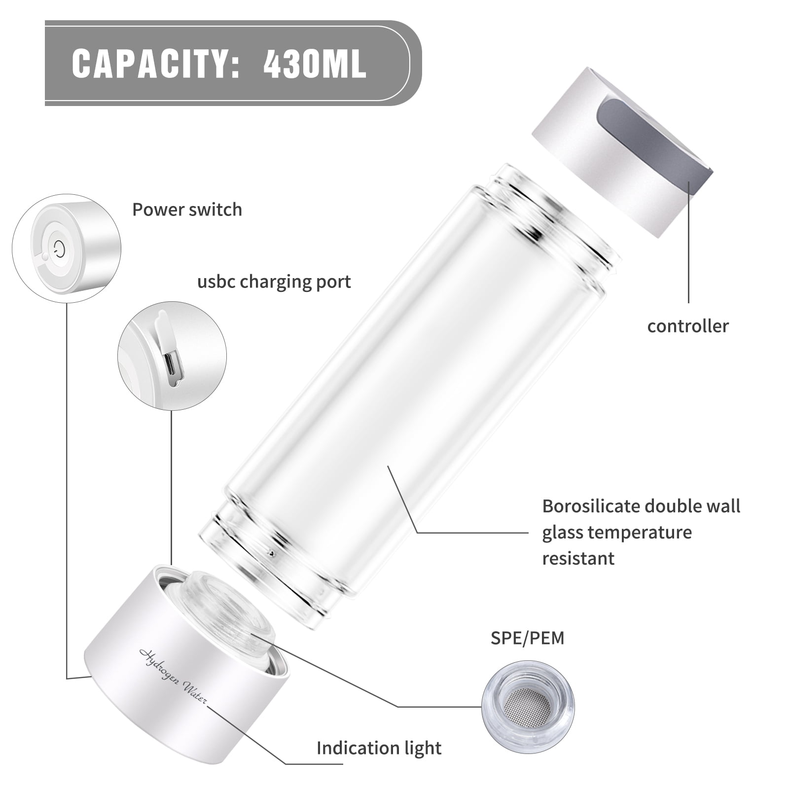 【Separation Technology】When ordinary hydrogen-rich cups produce hydrogen, they will also produce residual chlorine, ozone, heavy metals, etc.Hydrogen and oxygen separation technology to produce hydrogen purity up to 99.9%, ef-fective separation of residual chlorine, ozone, so that it is sep-arated from the bottom of the discharge. 【Self Cleaning Mode】Long press the off/on button, when the green light turns on, it is cleaning mode. The water after cleaning needs to be poured out. With a portable inhaler adapter and self-cleaning mode, it allows you to enjoy hydrogen-rich water anytime, anywhere. 【Easy & Safe】Just click to start/stop, click for 3 minutes for fast electrolysis, double click for 10 minutes for higher concentration.The hydrogen-rich water bottle has EVE pads on the bottom for stability and slip resistance. Easy to use in the office, on the go and at work, reducing the physical fatigue you may experience throughout the day, giving you more natural ATP energy. 【Thoughtful Little Gift】: Long-term drinking can help improve muscle soreness after exercise and reduce physical fatigue. It is an excellent gift for family and friends. 【Kind tips】There will be a small amount of pure water in the cup’s sink. No need to worry, the purpose is to maintain and keep moist so you can have a better experience, When not in use, keep the electrolytic film moist, do not pour juice, milk, tea etc. into the alkaline water ioniser, one year hassle free warranty and 7*24Hour friendly customer service.