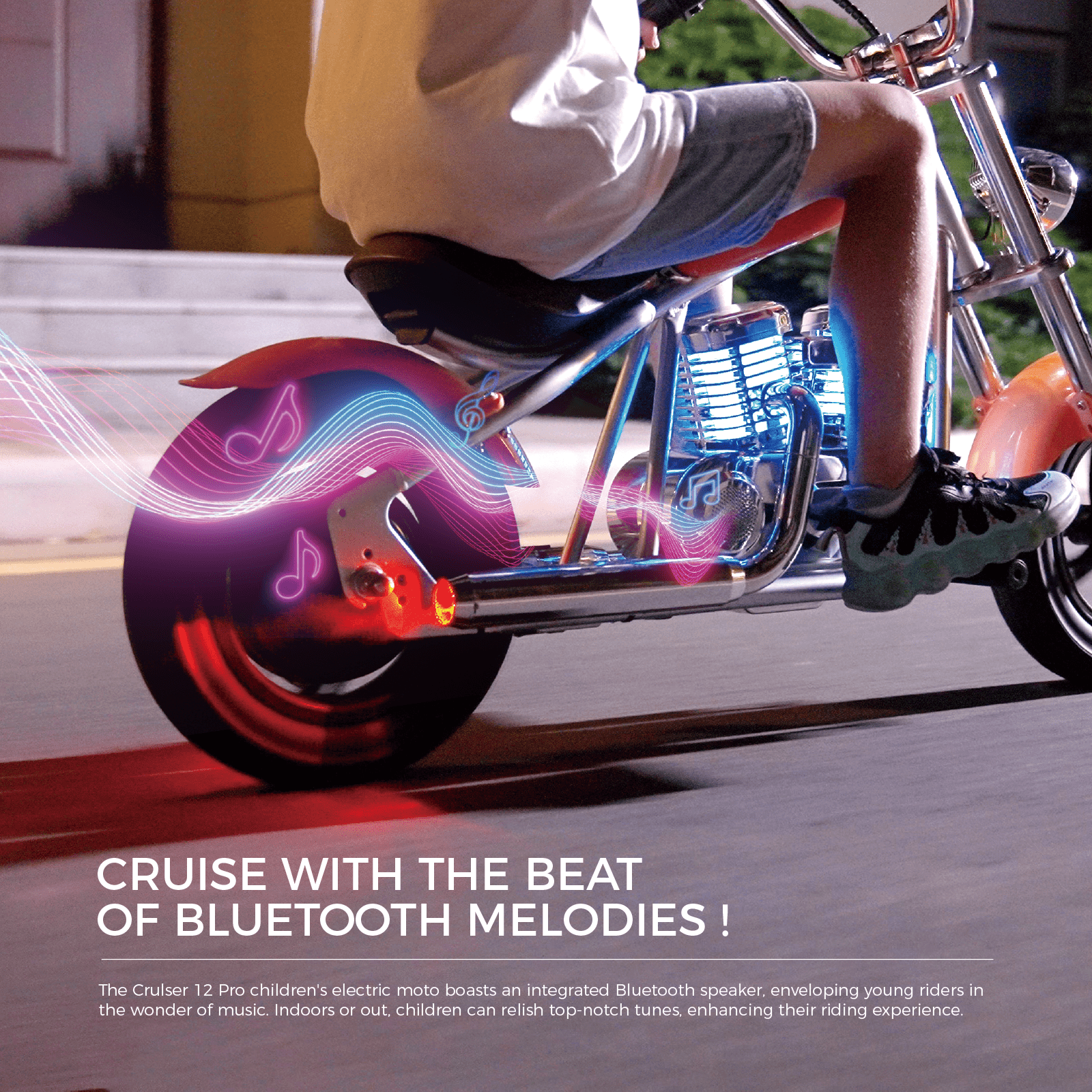 Overview: Introducing the HYPER GOGO CRUISER 12 PLUS- an electric motorbike crafted with the young thrill-seeker in mind. Built with a robust steel frame and packed with exciting features, this motorcycle guarantees endless hours of riding fun.Key Features: Durable Build: Constructed with a steel frame ensuring longevity and resilience. Size: 45.3 x 19.6 x 28.5 inches — perfect dimensions for young riders. Weight: Lightweight at only 33lbs, ensuring easy maneuverability. Powerful Performance: Armed with a 24V 160W motor and a Li-ion 21.9V 5.2A battery. Charging: Comes with a DC24V 1.5A charger. Range: Offers an impressive range of 7.5 miles on a single charge. Speed: 3 adjustable speed levels with a max speed of up to 10 MPH. Safety First: Equipped with a rear hub brake and a maximum uphill capability of 10°. Load Capacity: Can handle a weight of up to 145lbs All-Terrain Riding: 12×3″ tires designed for various terrains.Water Resistance: IP4 rating, ensuring protection against heavy splashing and rain. LED Lights: For enhanced visibility during low-light conditions. Additional Features: Discover the Magic of Fog Effects! The Cruiser 12 Plus children’s electric moto introduces an innovative simulated fog feature, plunging young riders into an authentic, atmospheric journey! It’s as if they’re navigating through a dense mist on a true adventure. This captivating effect elevates the riding adventure, letting kids revel in every moment on the road. Cruise with the Beat of Bluetooth Beats! The Cruiser 12 Plus children’s electric moto comes equipped with a built-in Bluetooth speaker, letting young riders jam to their favorite tracks on the go! Whether they’re inside or out, kids can groove to crisp tunes, adding an extra layer of excitement to their journey.