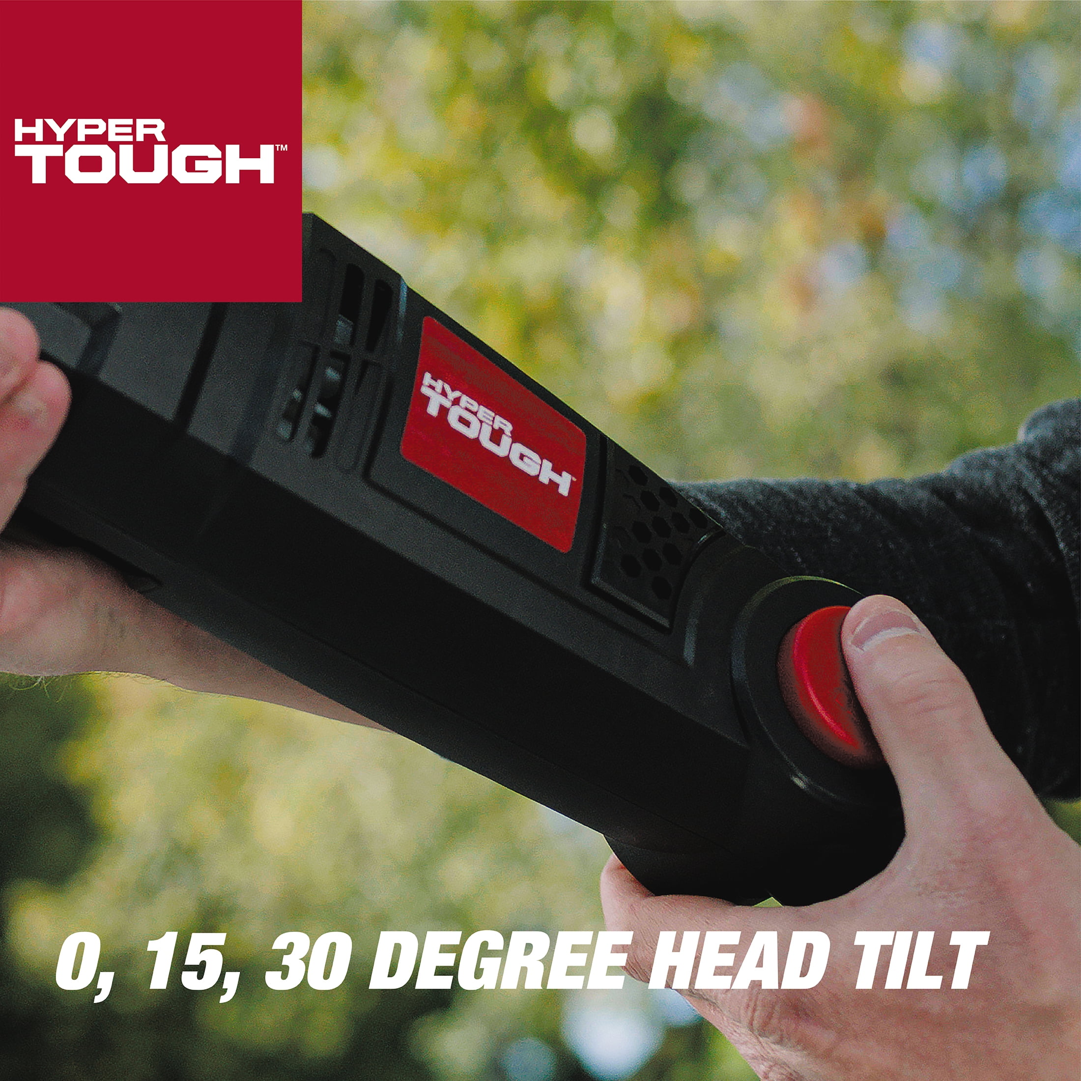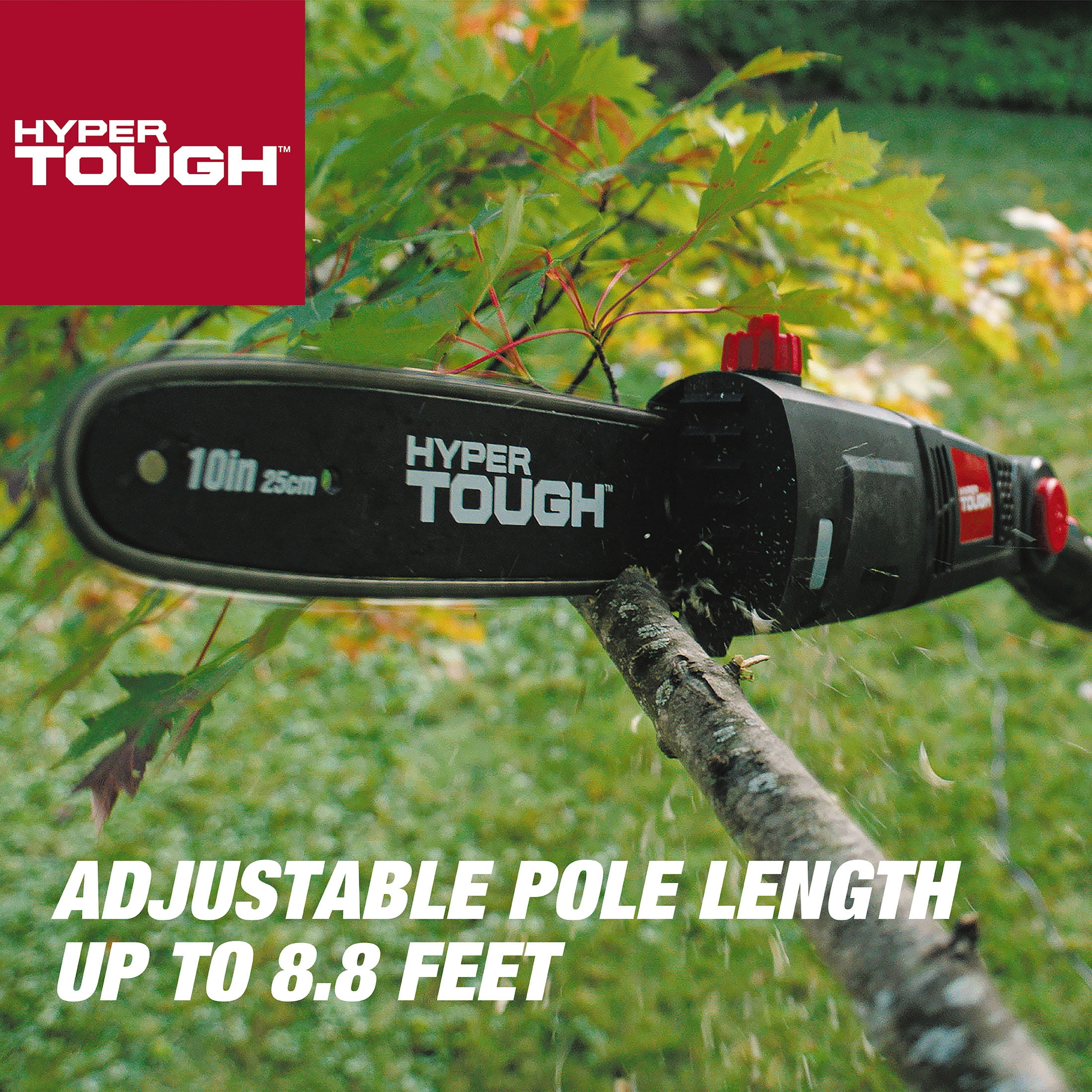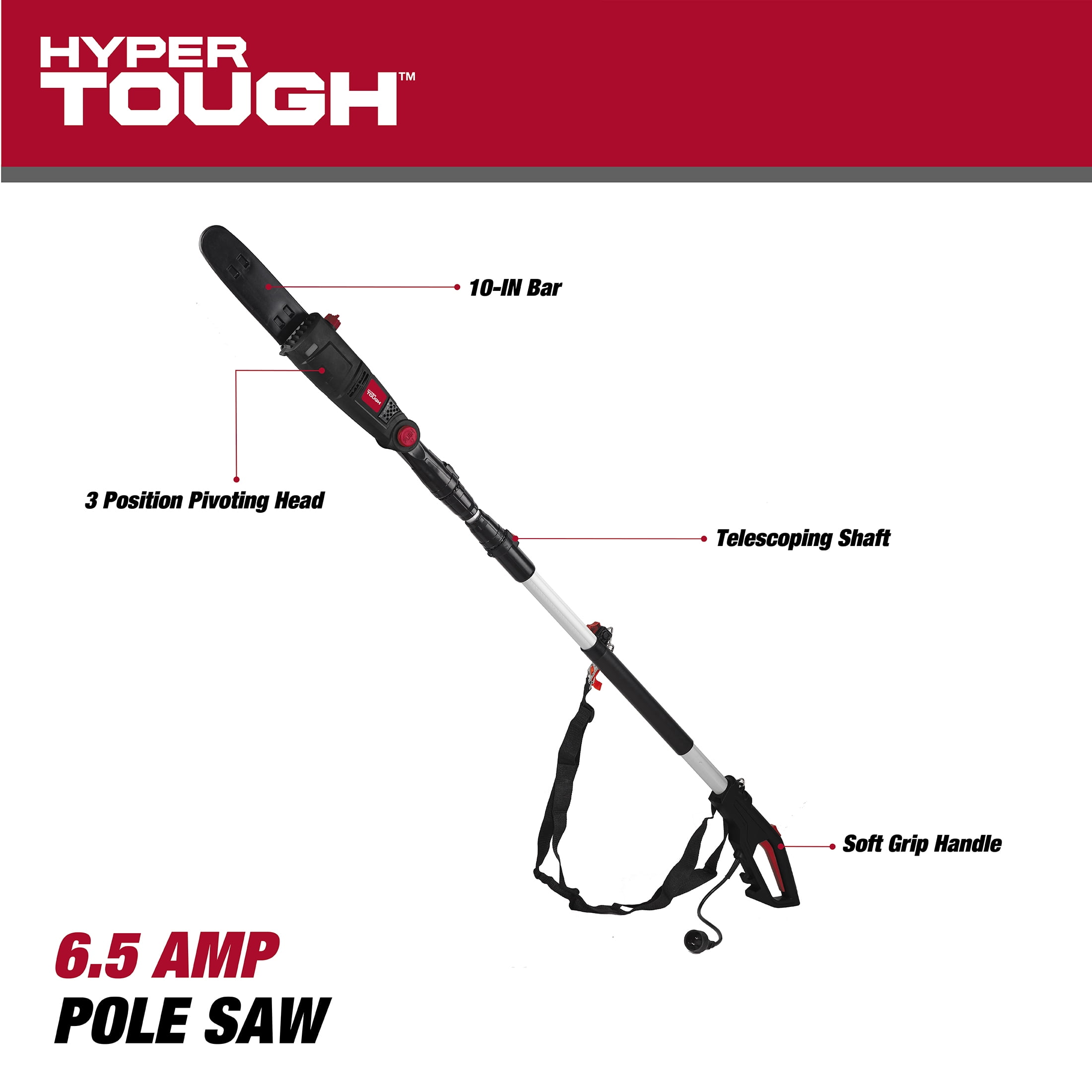 Hyper Tough 10-Inch Corded 6.5 Amp Pole Saw Adjustable and telescoping pole length up to 8.8 ft 3 positions pivoting head Soft-grip handle Rated Current: 6.5-Amp No Load Speed: 6500 RPM Pole saw blade: 10 in. Weight: 8.82 lb 2-Year Limited Warranty