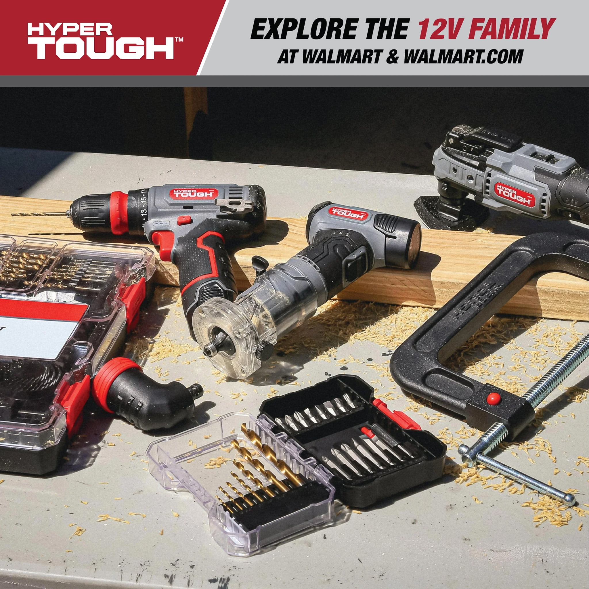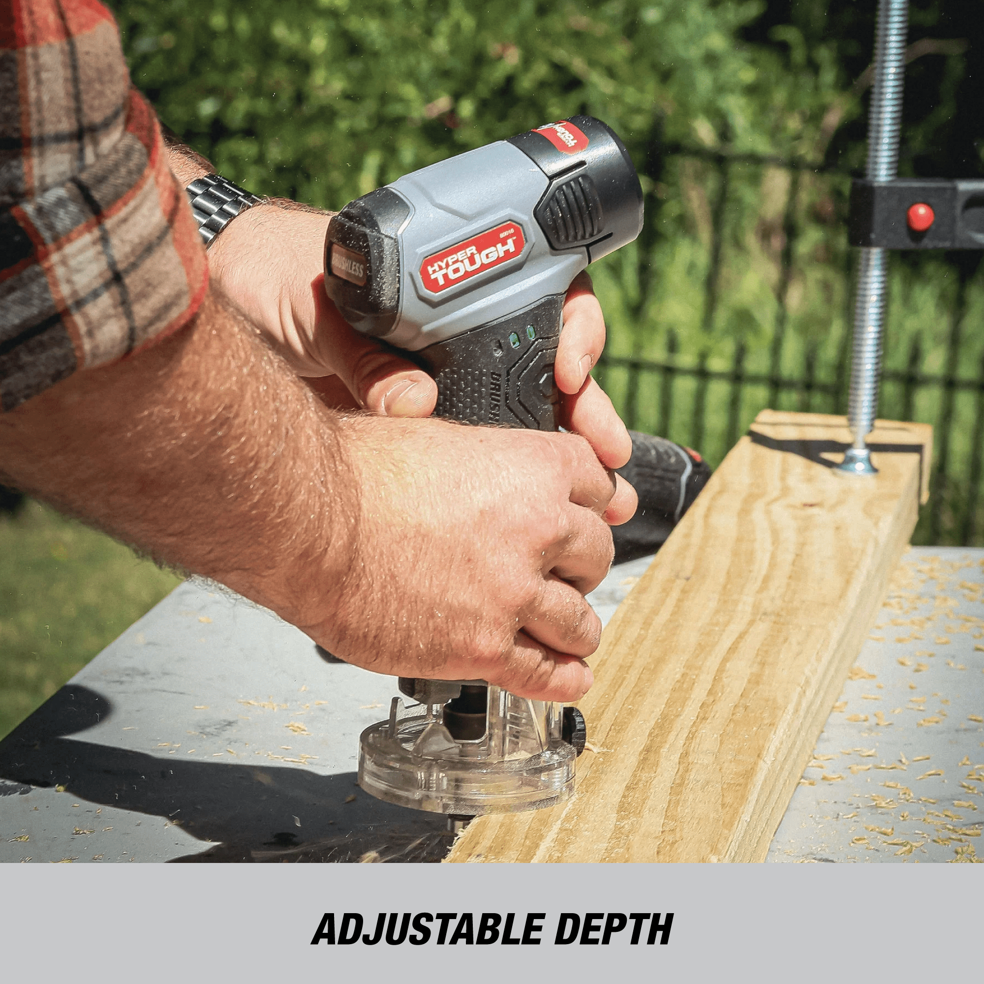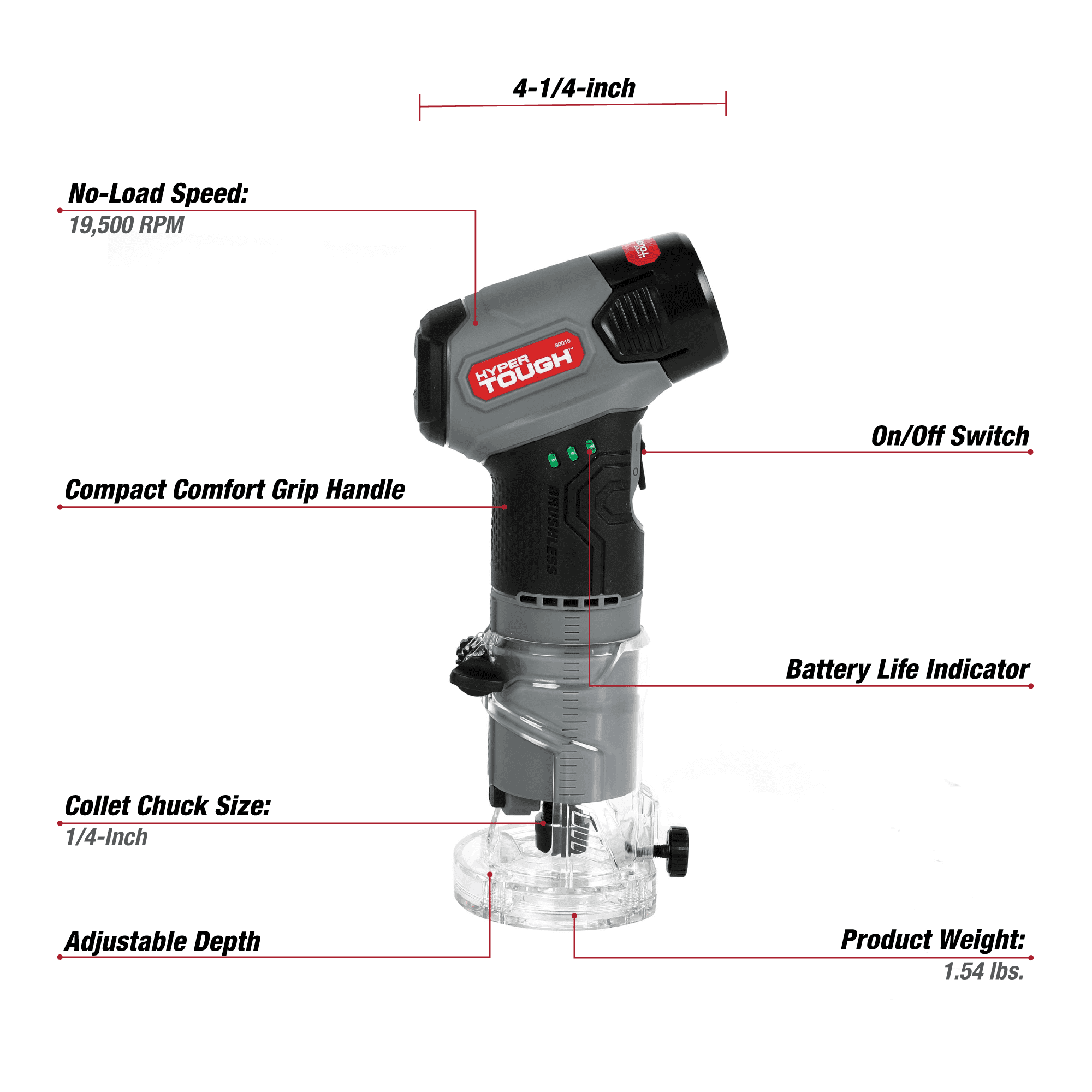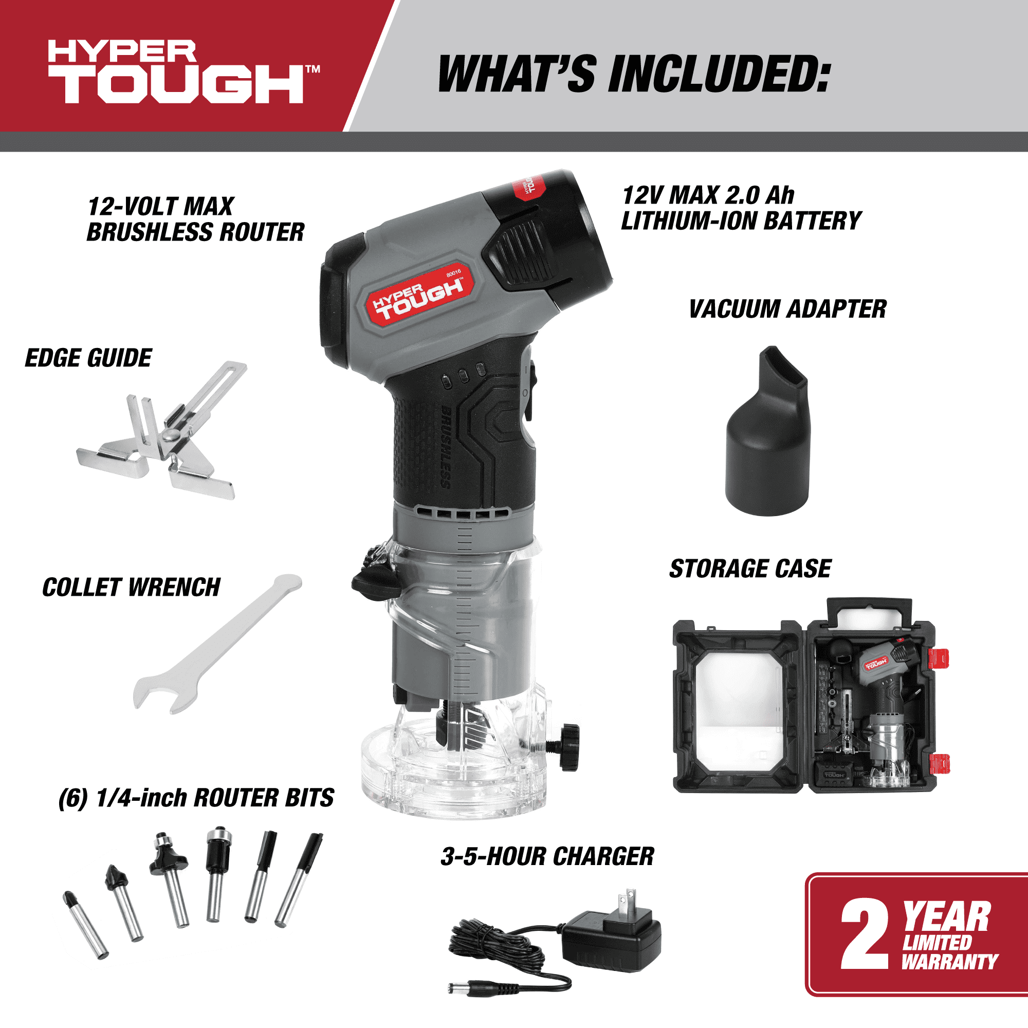 The Hyper Tough 12V Max* Lithium-Ion Palm Edge Router features a compact design and brushless motor for more power and longer run time. The Hyper Tough Brushless series provides up to 30% more power, 10x longer motor life and 30% more runtime compared to standard brushed models. This handheld router is great for small projects and easily allows you to curate decorative edges, engrave, round, bevel, and perform detailed cut profiles on wood applications. This router has speeds up to 19,500RPM with an adjustment depth ranging from 0-1.18″ for better control and handling on a variety of applications. The brushless palm router includes a 1/4-inch collet chuck, battery indicator light, 9 accessories, (1) 1.5 Ah lithium-ion battery, (1) 3-5 hour charger, and a 2-Year Limited Warranty. Discover the entire family of Hyper Tough 12-Volt Tools and accessories exclusively at .