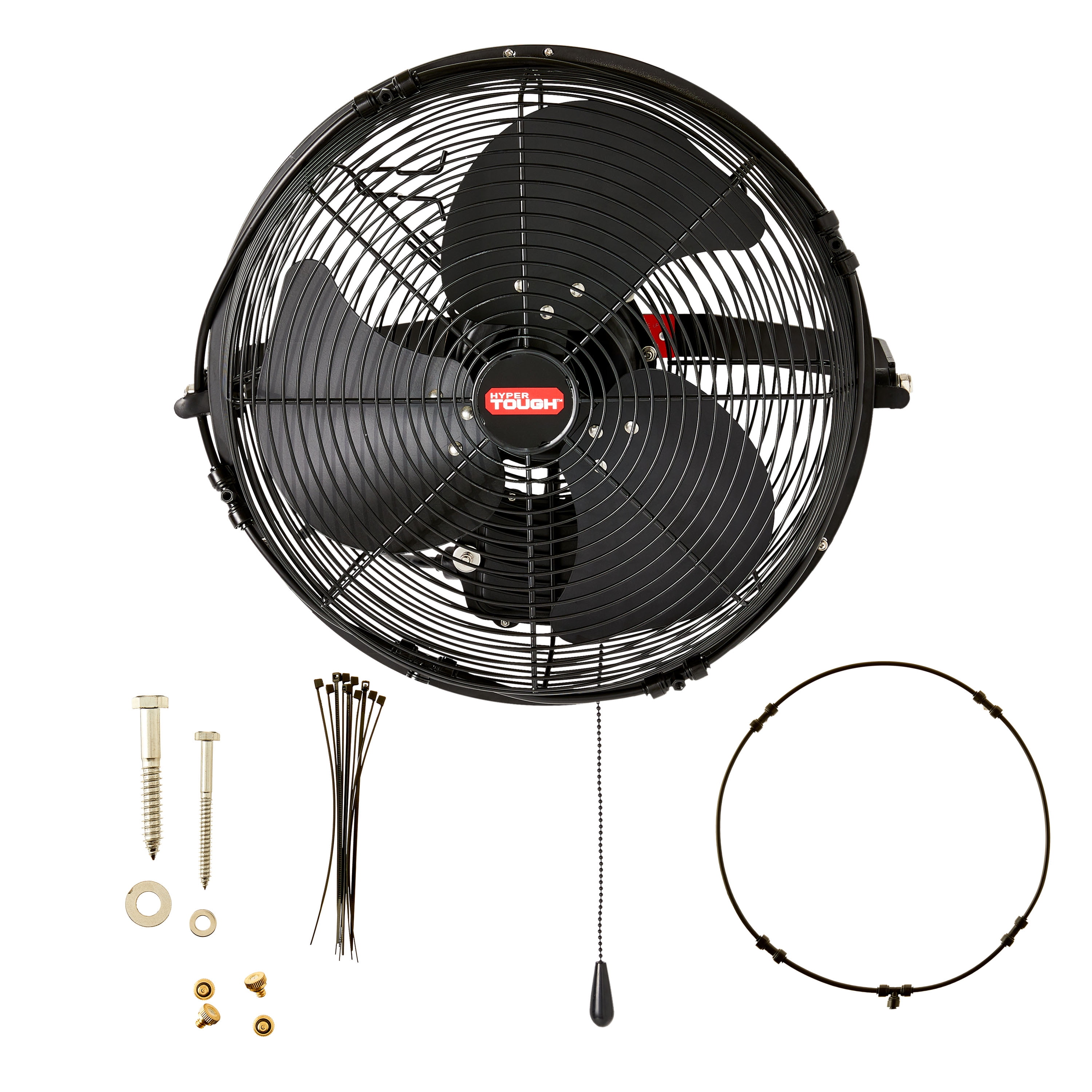 Hyper Tough 14 Inch Household Outdoor Wall Fan with Misting Kit, 3 Blades, Black Perfect for home use or commercial use in warehouse, loading dock, greenhouse Air flow capacity: 2500 CFM Factory balanced, powder coated aluminum blades Misting Kit included Speed adjustable with pull chain control featuring three different speeds Sealed, permanently lubricated industrial motor for wet locations 14″ curved fan blades for optimal air movement