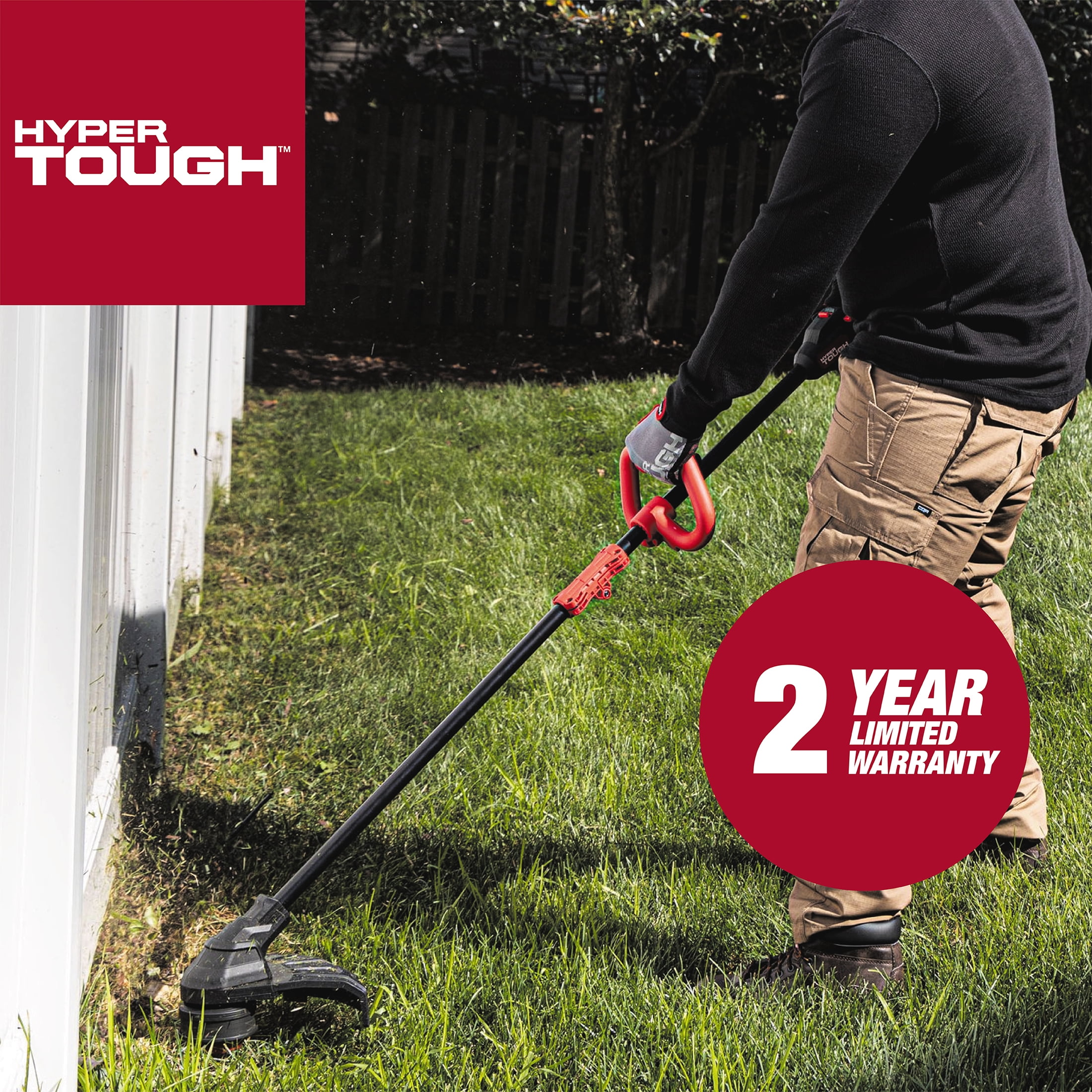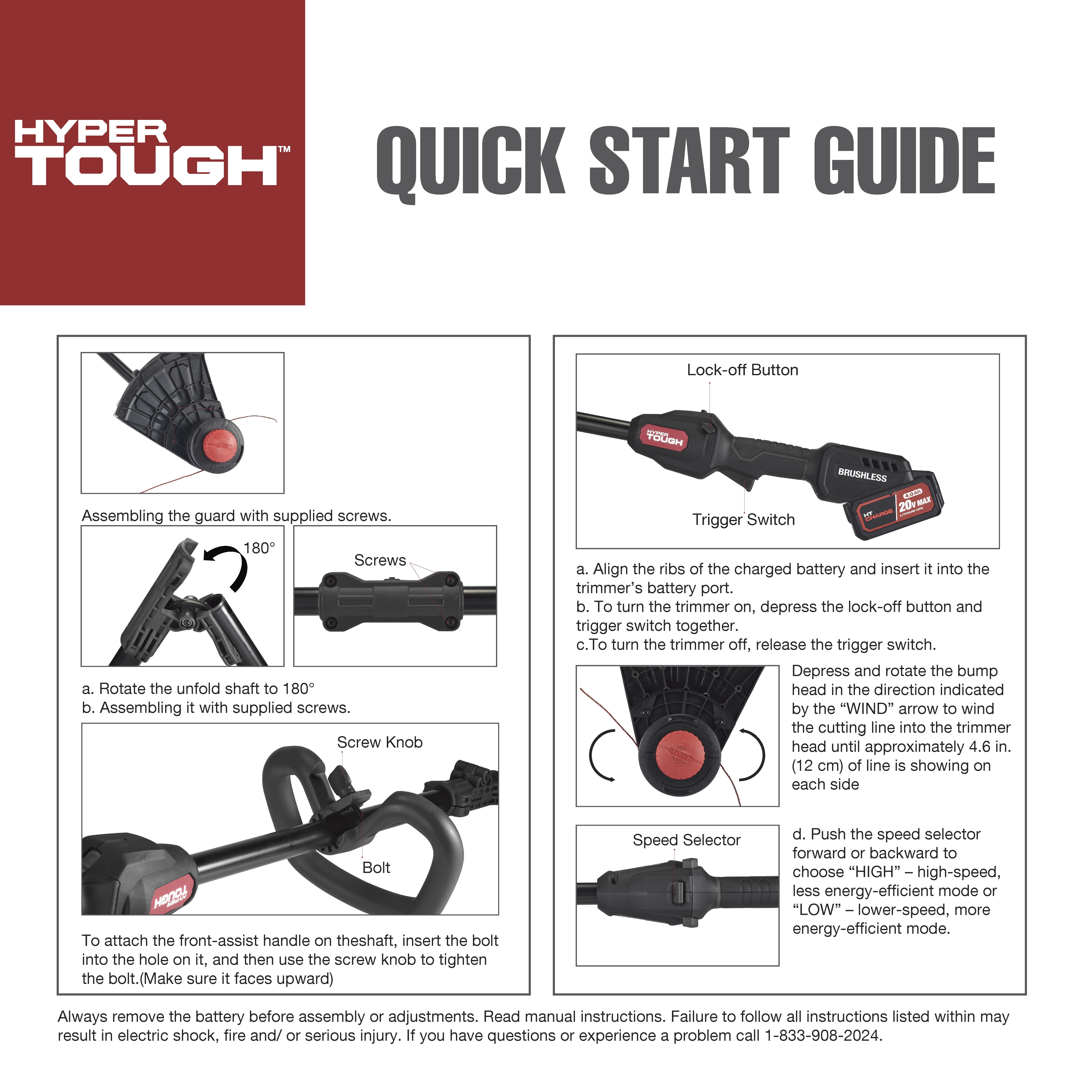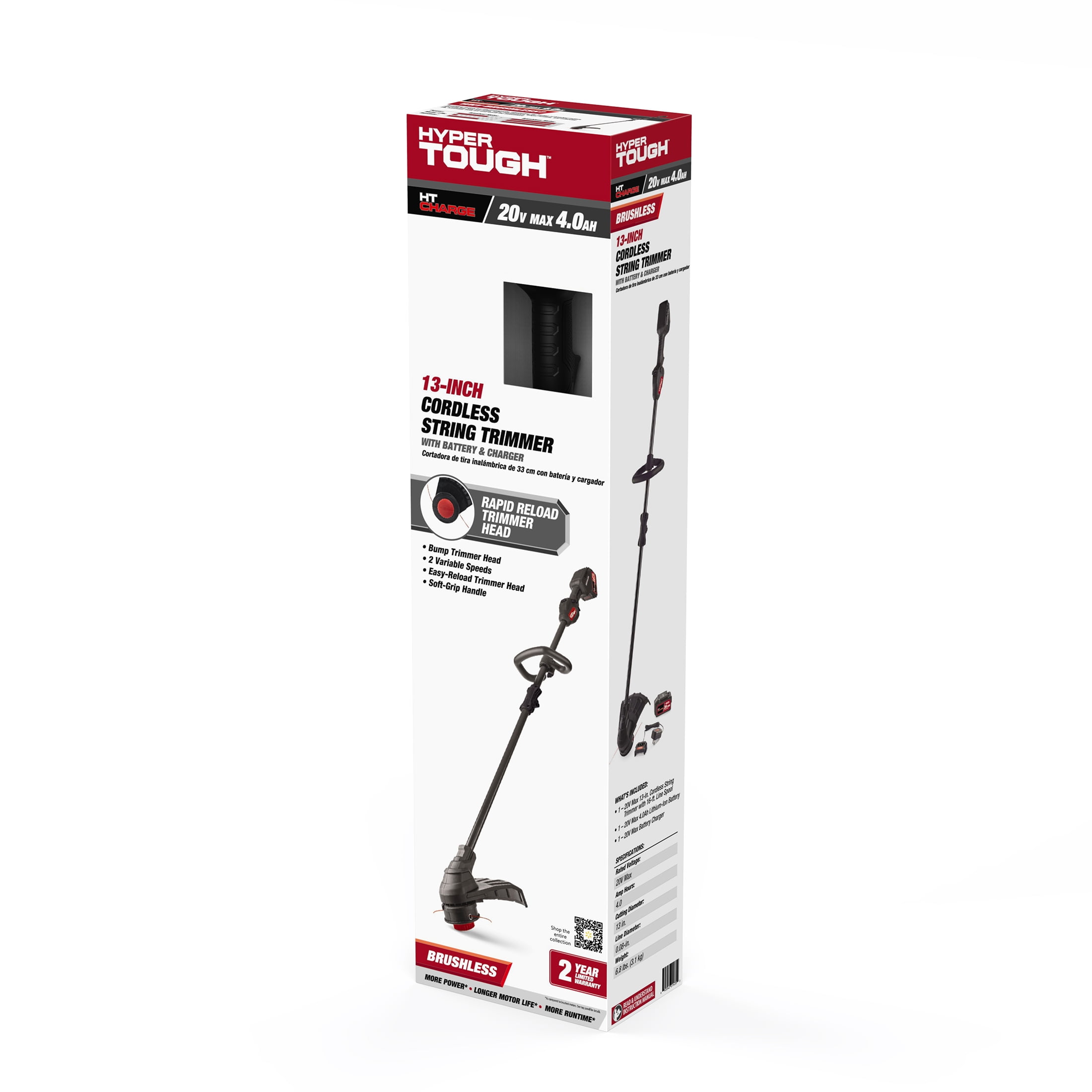 •Hyper Tough 20V Max 13-inch Brushless String Trimmer •Rapid Reload Bump Trimmer Head •2 Variable Speeds •Soft-grip Handle •Adjustable Front Handle •Rated Voltage: 20V Max •Amp Hours: 4.0 Ah •Cutting Diameter: 13 in. •Line Diameter: 0.08 in. •Weight: 6.8 lbs. (3.1 kg) •Includes: 1pc 20V Max 13-inch Brushless String Trimmer, 1pc 20V Max 4.0 Ah lithium-ion Battery and 1pc 20V Max Standard Charger •2-Year Limited Warranty •Model# HT22-401-03-02 •Customer Service Number: (833) 908-2024 •For product replacement parts contact customer service at 1-833-908-2024 Sunday-Saturday, 7:00 a.m.-9:00 p.m. CT