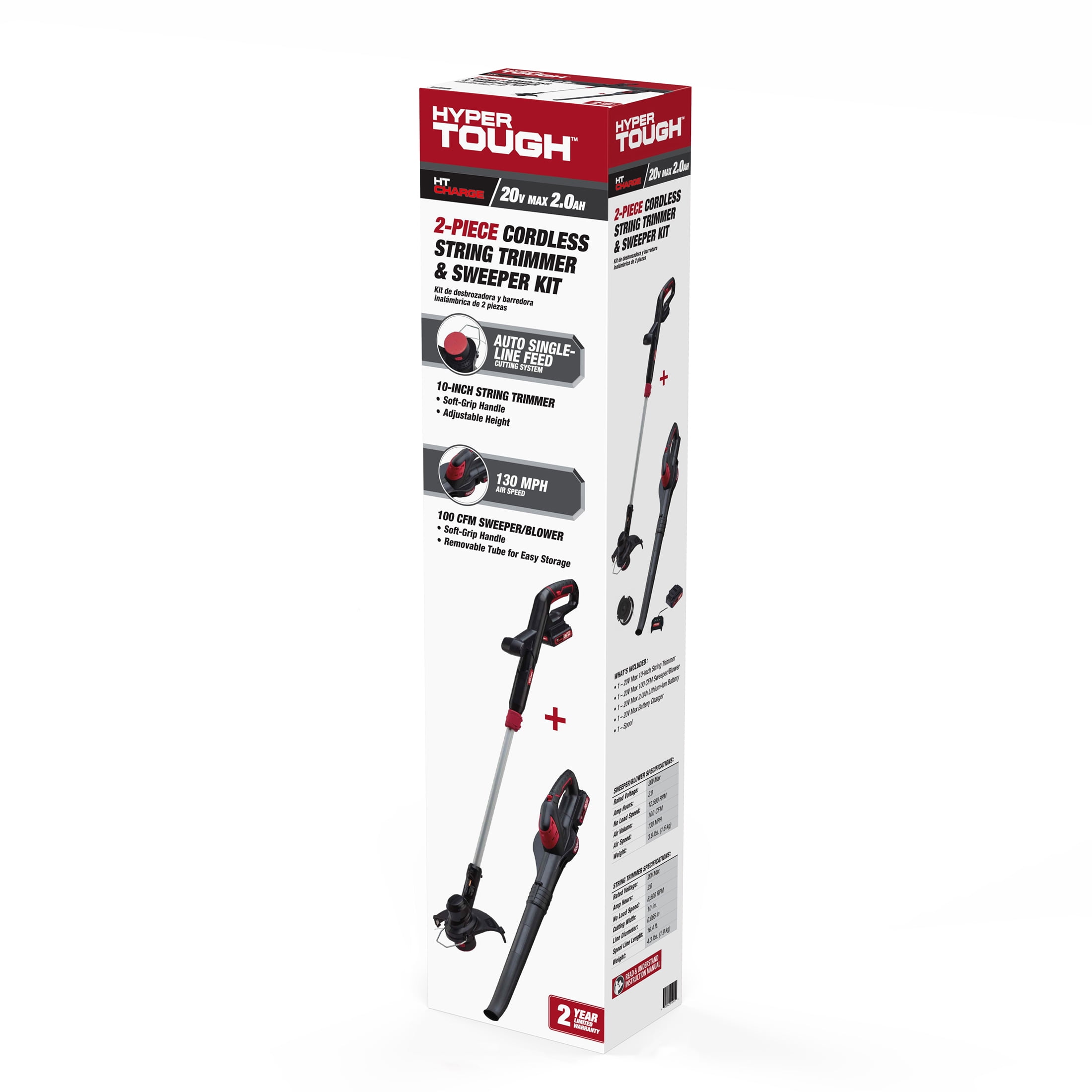 The Hyper Tough 20V Max Cordless Combo Kit 10″ String Trimmer and Sweeper: Key Features for String Trimmer: 2.0 Ah for good run time 10-Inch Guard Cutting Diameter Auto Single-Line Feed Cutting System Adjustable Height Key Features for Sweeper: 2.0 Ah Good Run Time 130 mph Max Air Speed Removable Tube For Easy Storage Over Mold Handle Key Specifications for String Trimmer: Rated Voltage 20V Line Diameter 0.065 In. No-Load Speed 8500 rpm Cutting Width 10 In. Key Specifications for Sweeper: Rated Voltage 20V Air Speed 130 mph No-Load Speed 12500 rpm Air Volume 100 CFM Customer Service Number: (833) 908-2024 For product replacement parts contact customer service at 1-833-908-2024 Sunday-Saturday, 7:00 a.m.-9:00 p.m. CT
