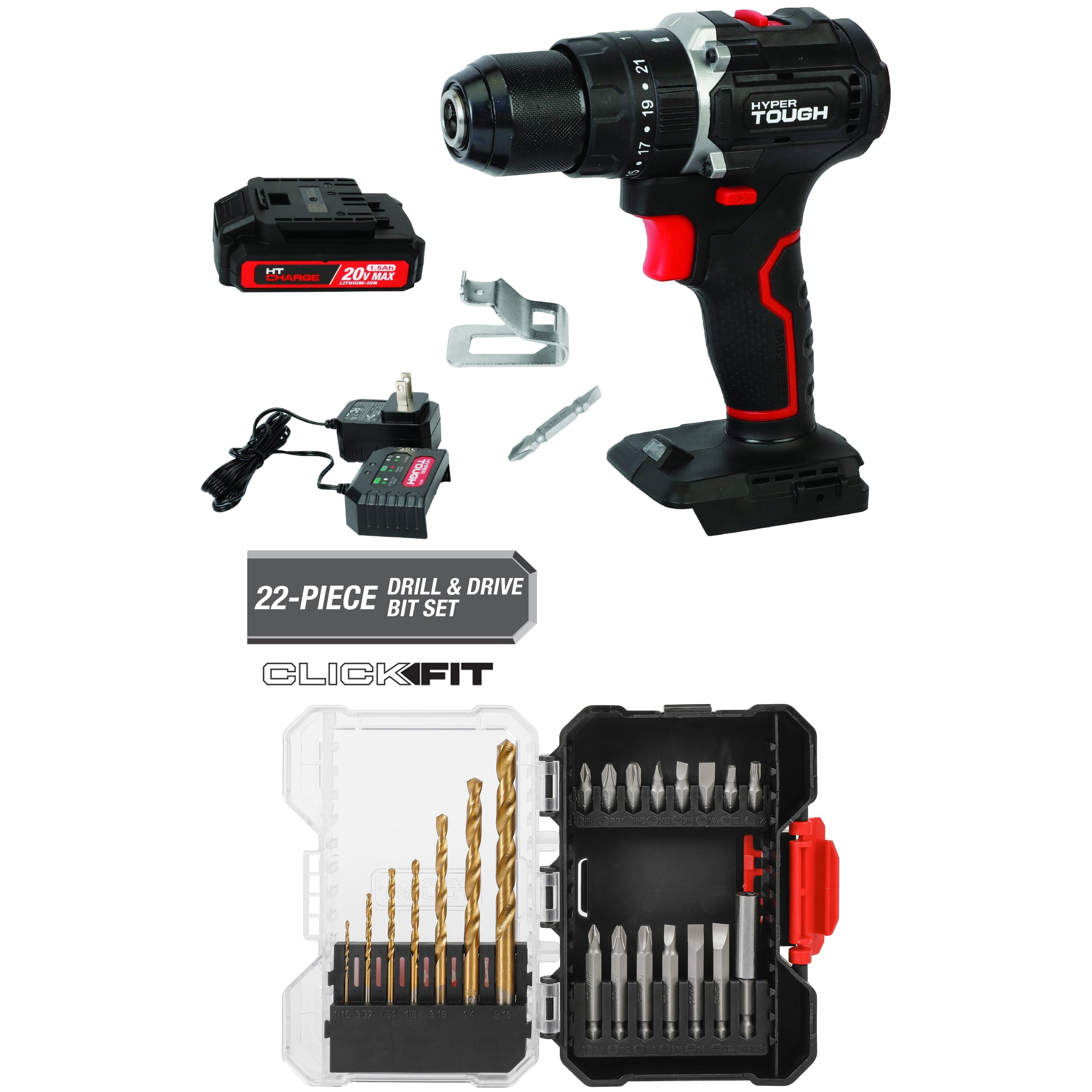 Hyper Tough 20V Max 1.5AH 70-Piece Project Kit with cordless drill, built-in LED work light, 3/8-inch keyless chuck, and 18+1 torque settings 70 essential accessories and a carry bag for versatile DIY projects and storage convenience Hyper Tough Fast Charger for 20V Max Lithium-Ion Batteries with LCD charging status display and 1-hour quick charge time Lightweight 0.77 lbs charger with a 6-foot power cable for flexible charging options