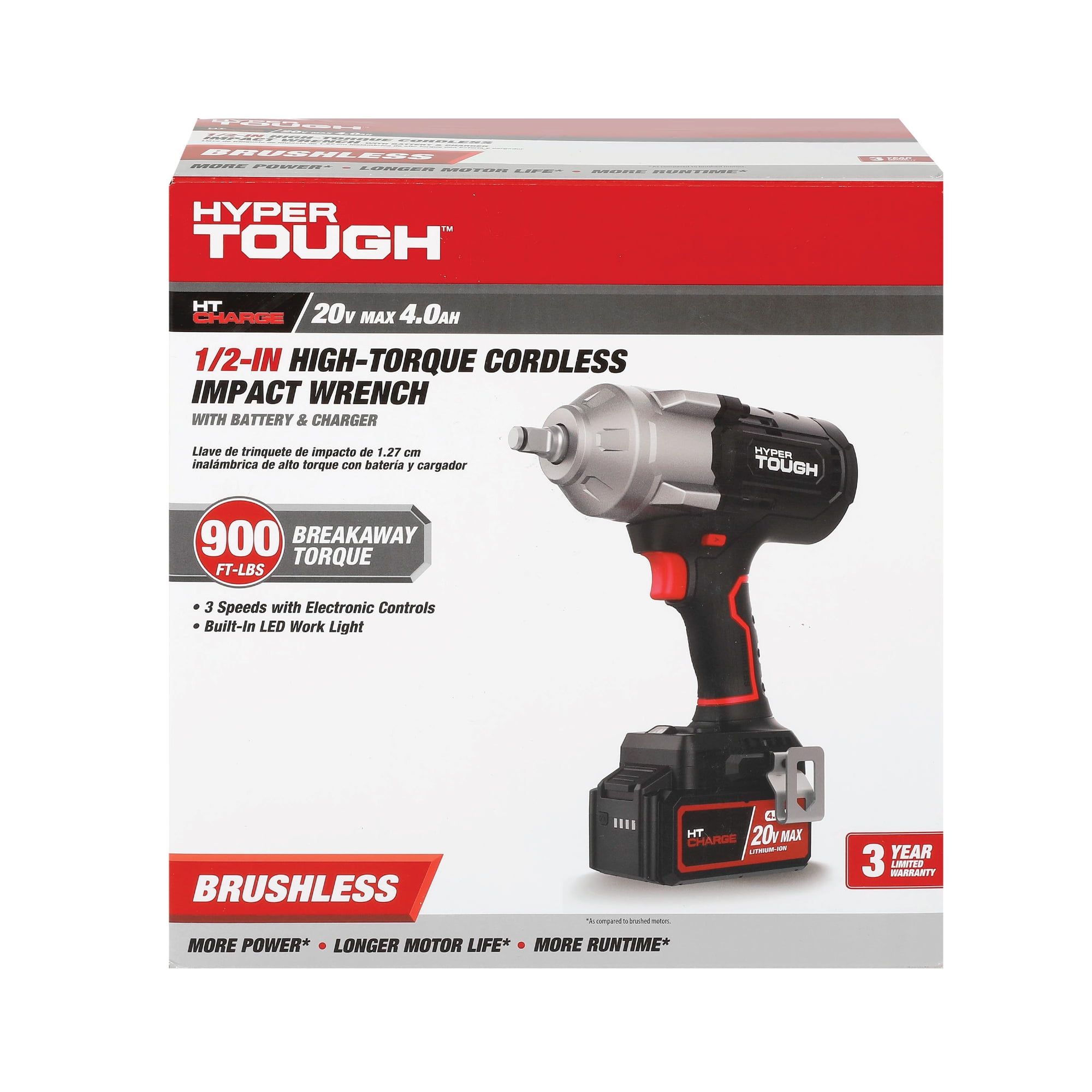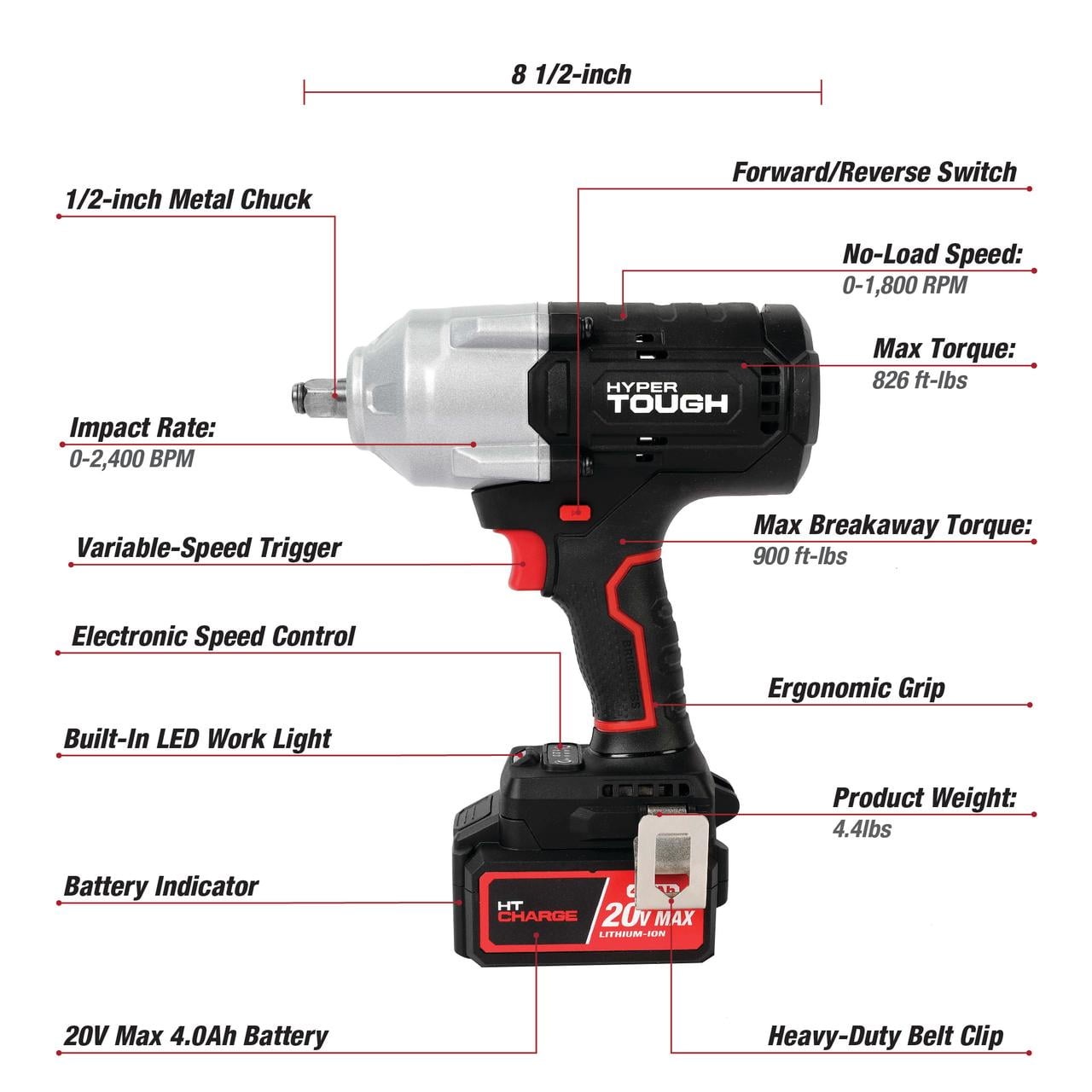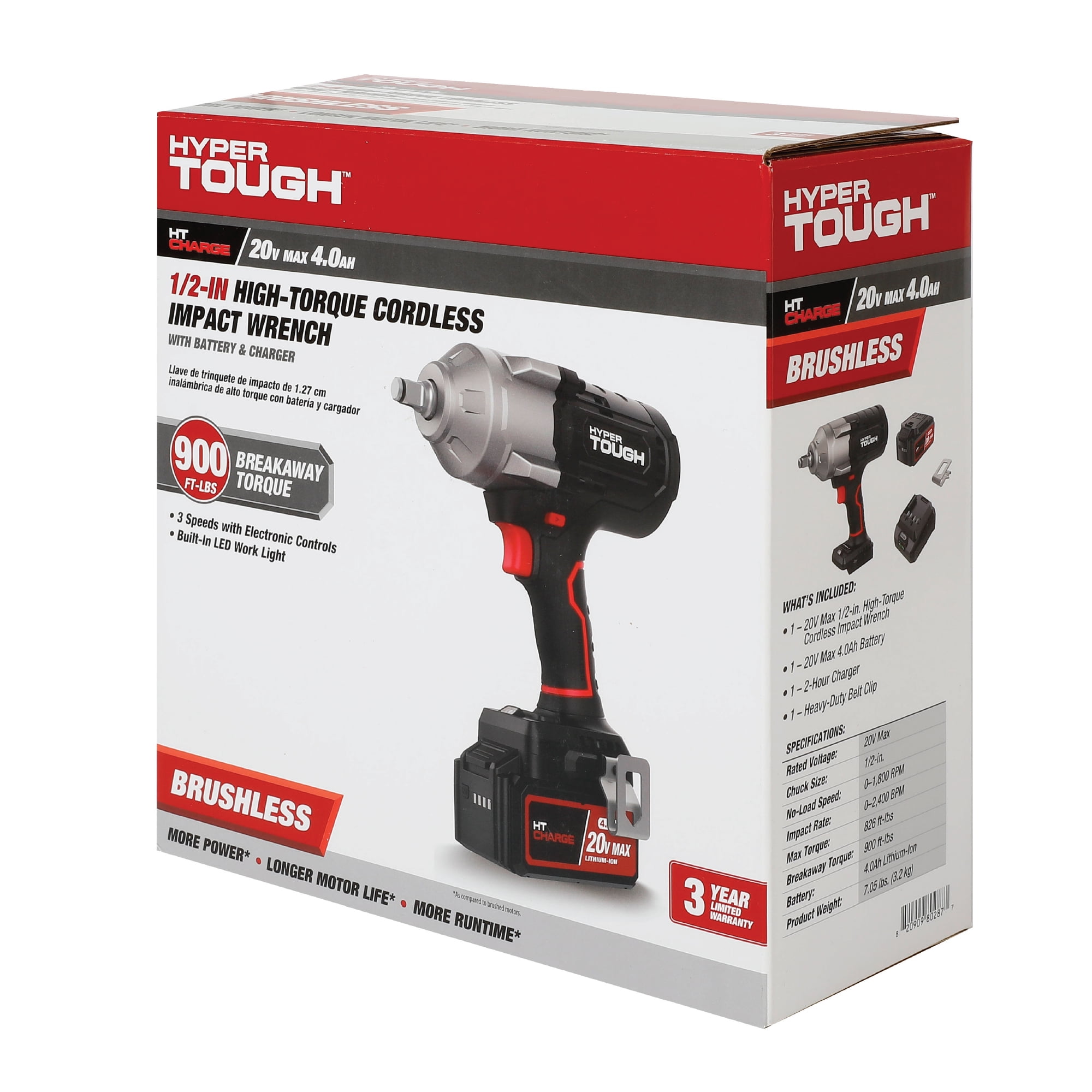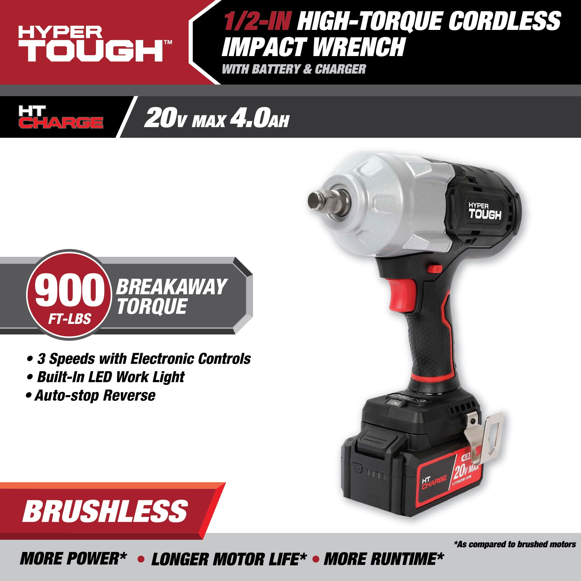 Hyper Tough 20V Max Brushless High-Torque Cordless Impact Wrench with 4.0Ah Lithium-Ion Battery and Charger 900 ft-lbs breakaway torque 826 ft-lbs max torque 1/2-inch chuck 3 speed control Built-in LED work light With Belt Clip 7.05 lbs product weight