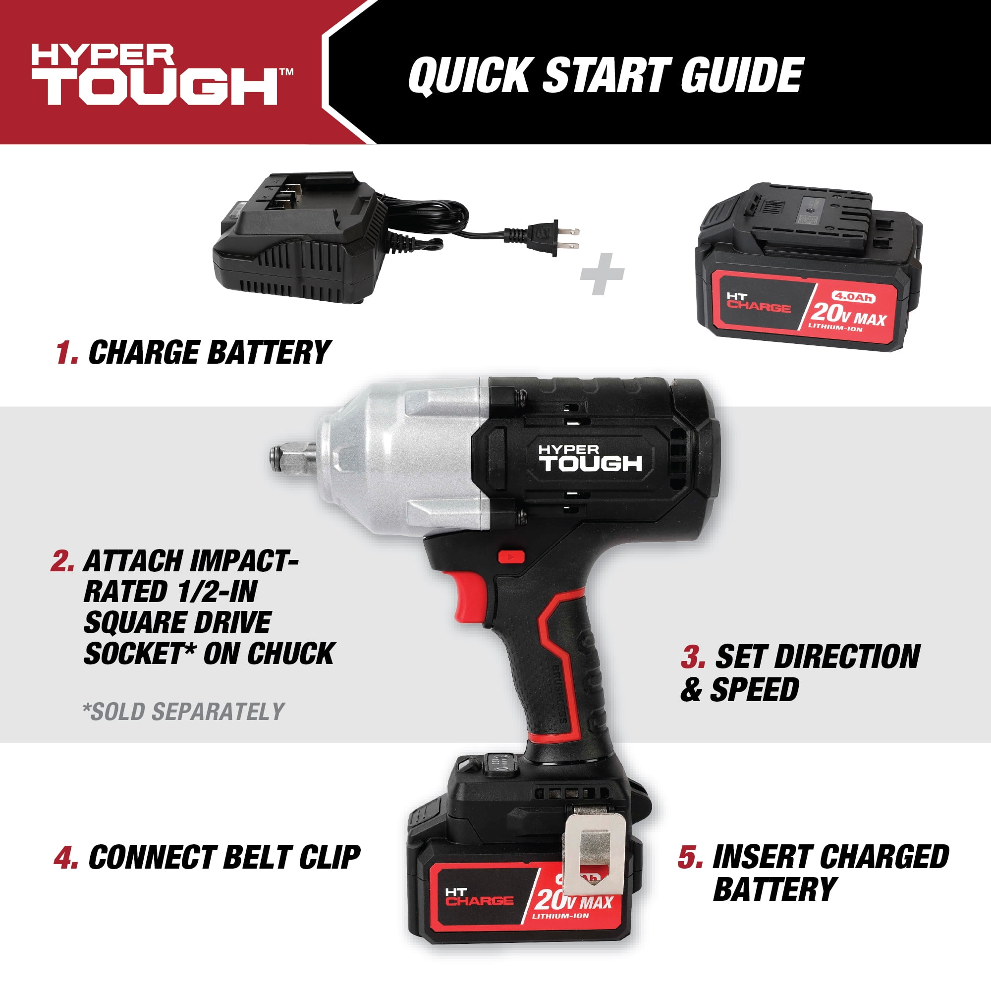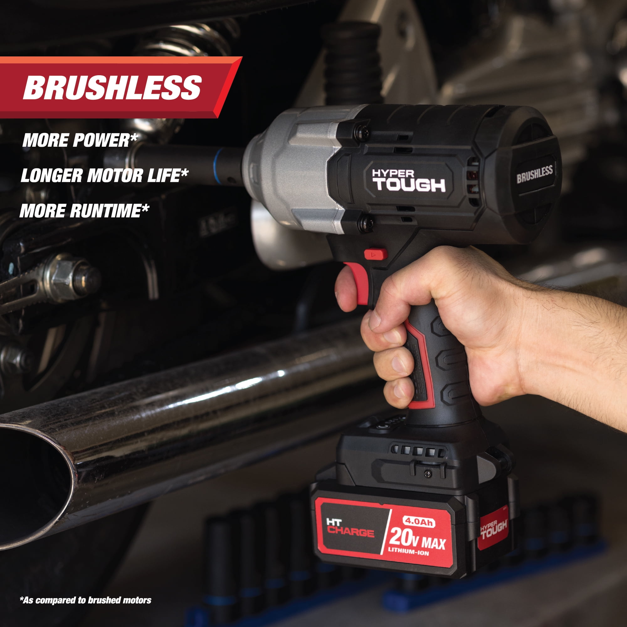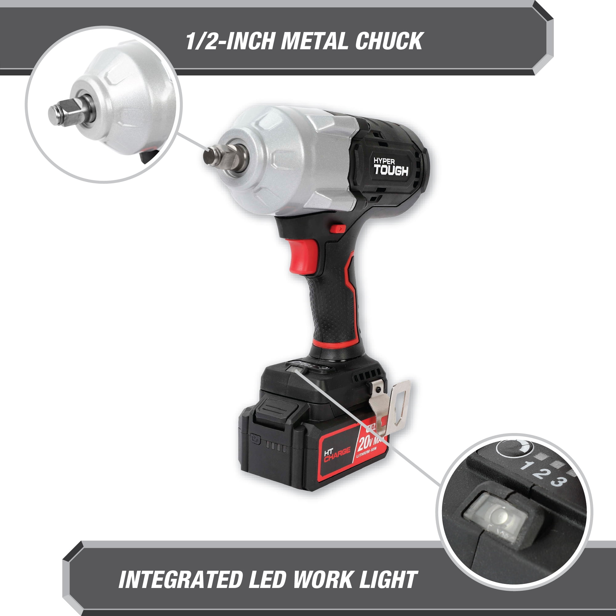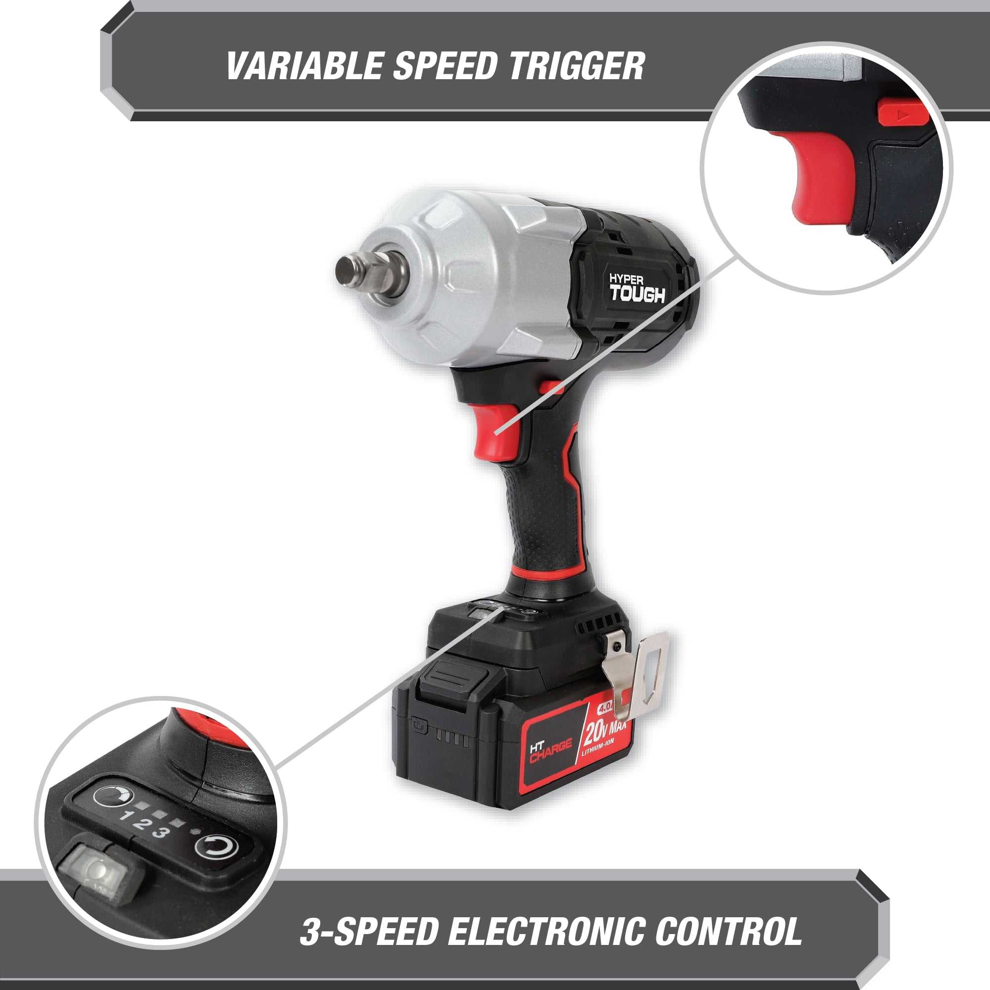 Hyper Tough 20V Max Brushless High-Torque Cordless Impact Wrench with 4.0Ah Lithium-Ion Battery and Charger 900 ft-lbs breakaway torque 826 ft-lbs max torque 1/2-inch chuck 3 speed control Built-in LED work light With Belt Clip 7.05 lbs product weight
