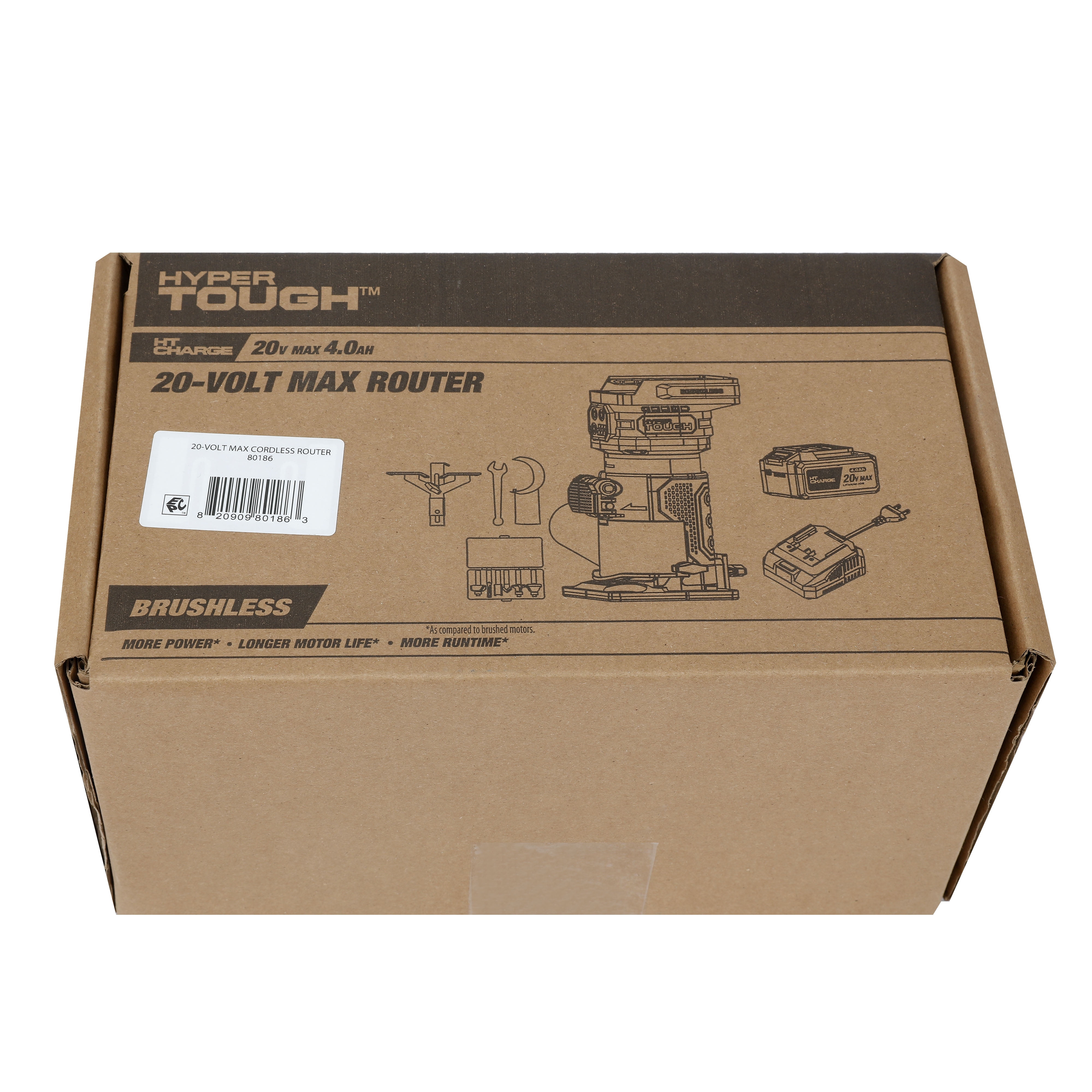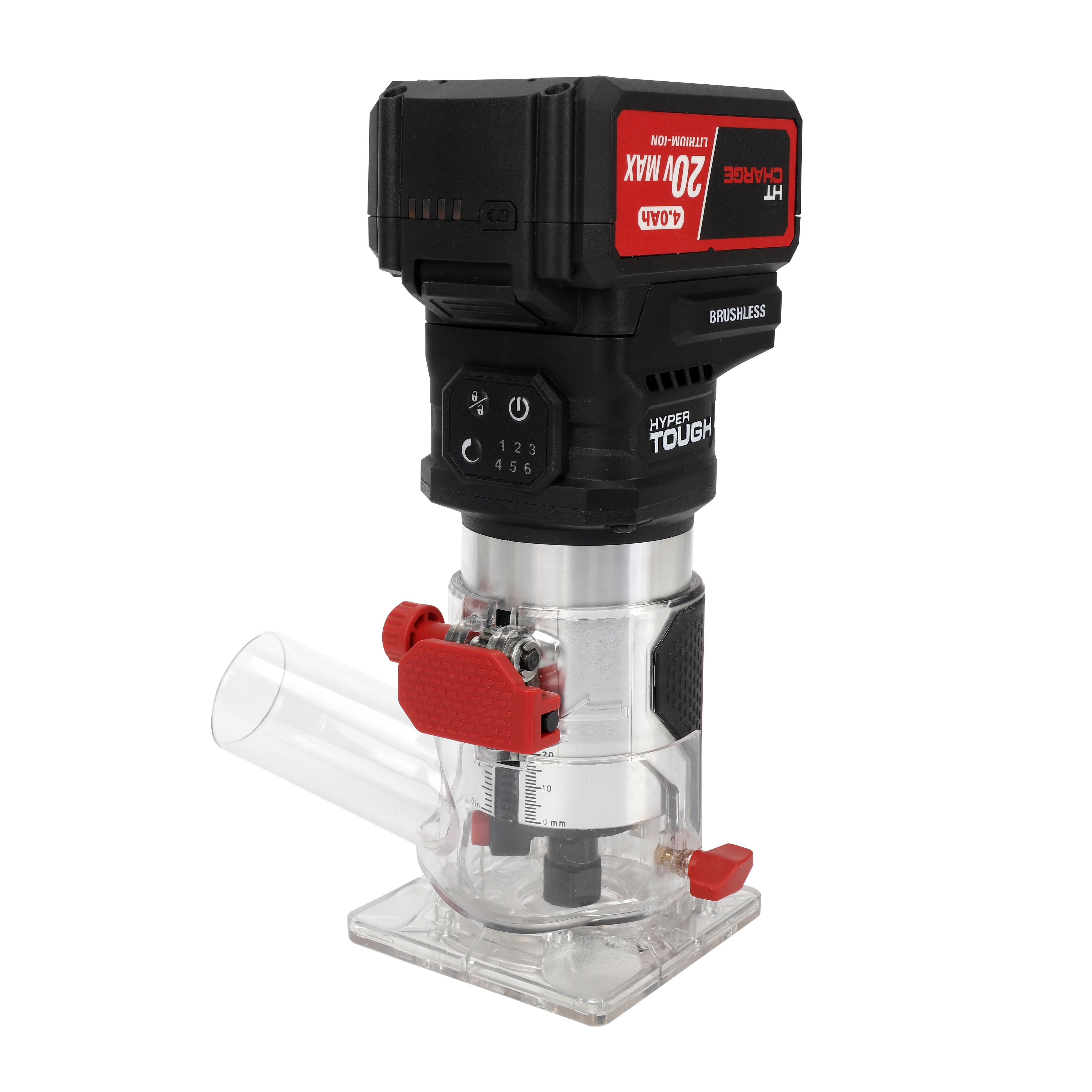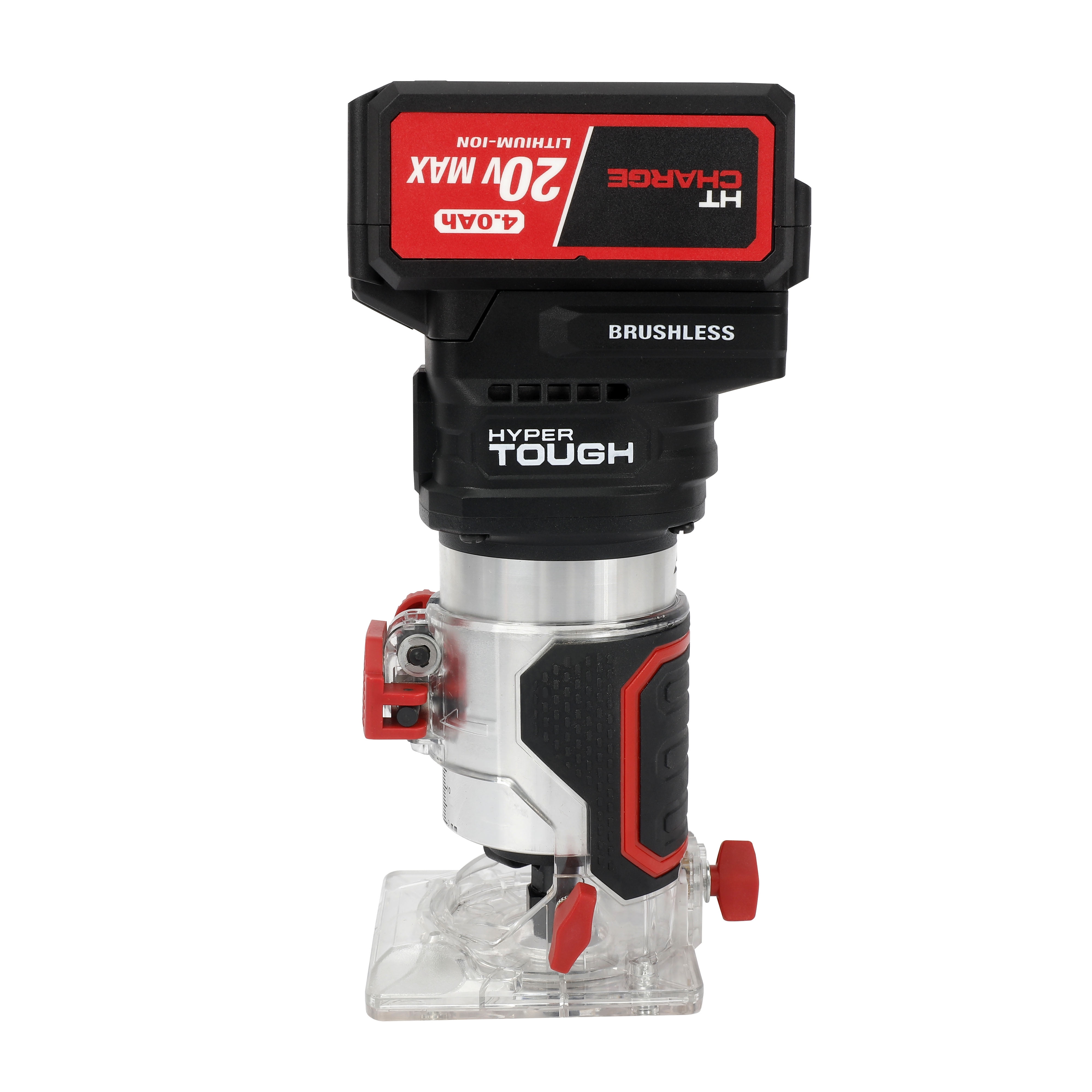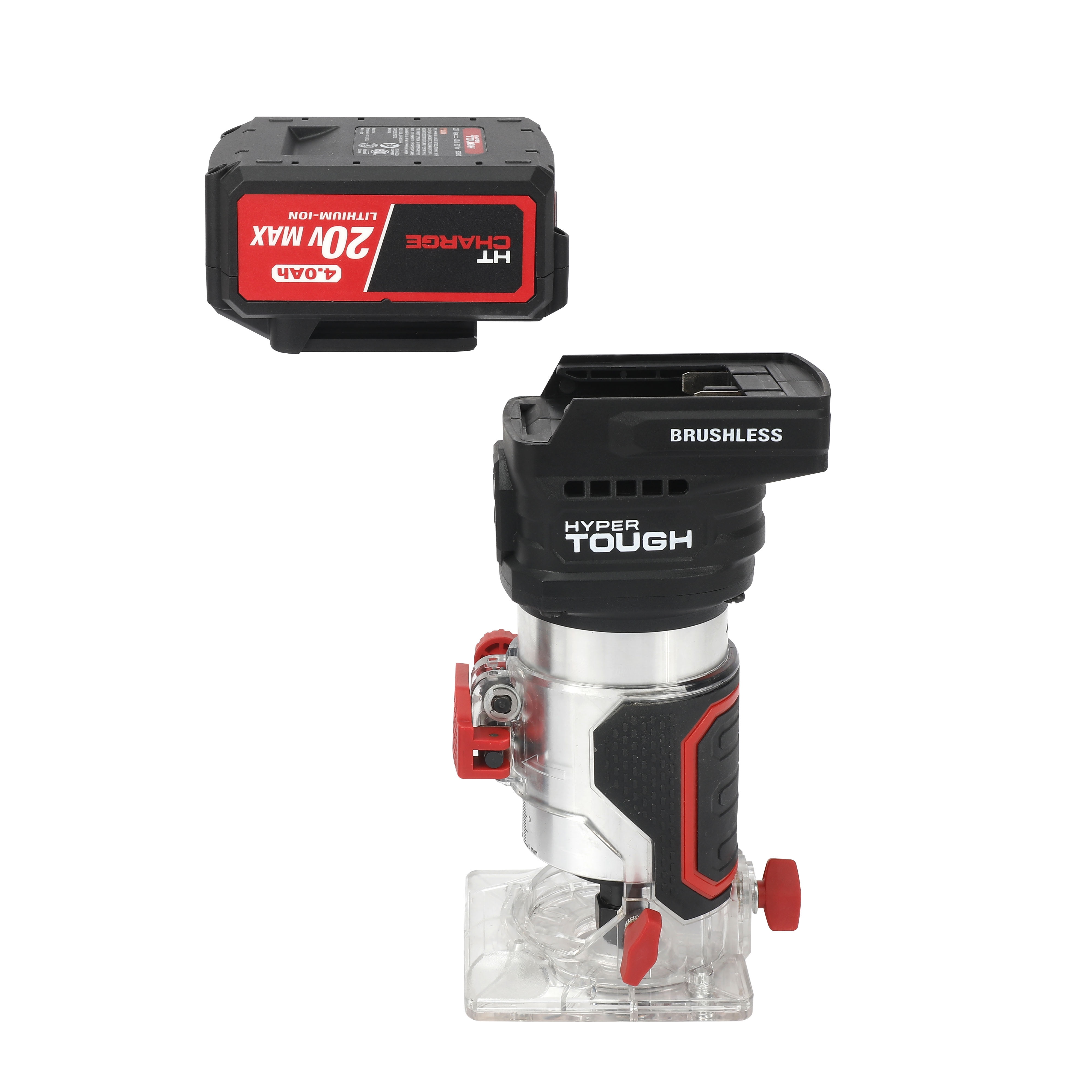 Hyper Tough 20V 5/16-inch Cordless Brushless Router Kit Cordless design powered by Hyper Tough 20 Volt Max system Up to 30,000 RPM for smooth, precise performance 6-setting speed control dial for versatile applications Built-in LED work light for enhanced visibility Lightweight at 3.3 lbs for easy handling and maneuverability Includes 4.0 Ah Lithium-Ion battery and charger for extended runtime Includes an edge guide, dust extraction attachment, collet wrench, and a set of router bits in a plastic storage case