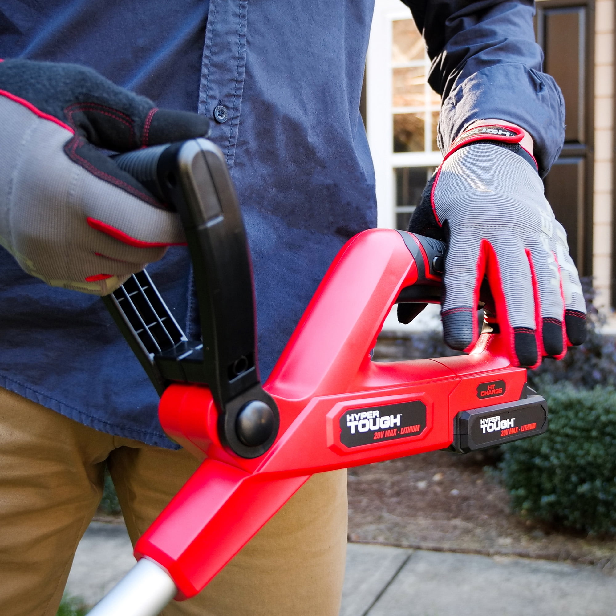 Maintain neat, clean edges around your home with the Hyper Tough String Trimmer. It features a 0.065-inch auto single-line feed cutting system that helps your trimming work go more smoothly. The length of the telescoping trimmer shaft is easily adjusted to obtain the right working height and the trimmer head can be set in any of five different operating angles. This allows the 20V string trimmer to reach a problematic and difficult-to-access area in your garden. The guide wheel also helps you with easy edge cutting along driveways and the metal guard prevents contact with flowers and other plantings. An over mold main handle and adjustable assist handle are designed for operator comfort and confident handling. Efficiency is increased by 12-inch cutting width. The cordless string trimmer also includes a 20V Max 2.0 Ah lithium-ion battery and a 20V Max battery charger, which provides a consistent power supply. When you are ready to make repairs or tackle home-improvement projects, Hyper Tough is ready.
