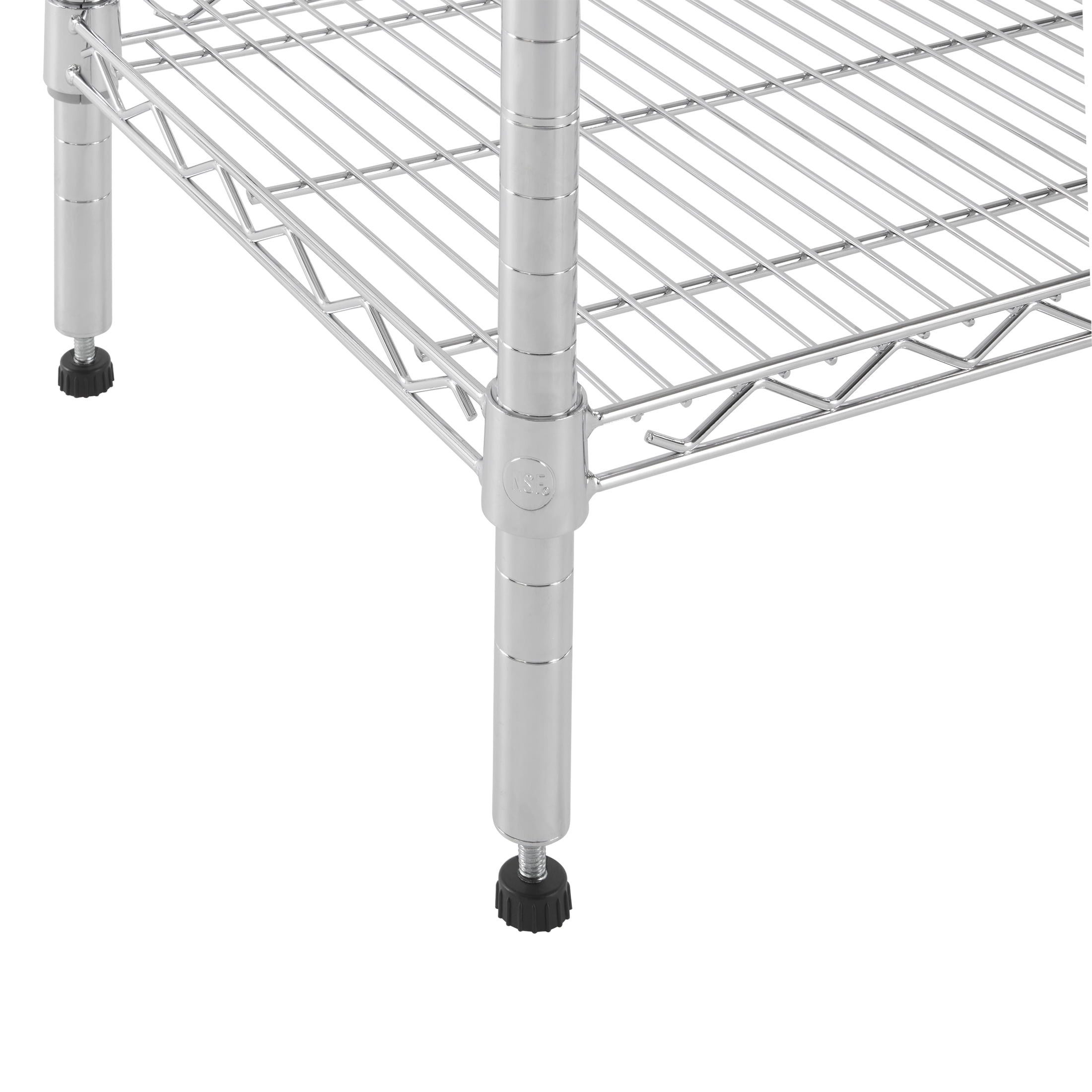 The classic, highly versatile Hyper Tough Commercial 5-Tier Heavy Duty Steel Wire Freestanding Storage Shelf Unit Set, Chrome, Holds up to 3,000-lb Capacity, makes an excellent storage solution for your home or business kitchen, laundry room, garage, or office. This multipurpose, freestanding storage shelf unit measures 16″D x 48″W x 72″H and features 5 stable, spacious shelves that adjust in 1-inch increments. It is NSF certified for dry environment and comes with a five-year, limited warranty. The frame and wire shelves are constructed of durable steel for years of reliable use, and the adjustable, plastic feet levelers help with uneven floors. This sturdy shelving rack supports a maximum load weight of 3,000 pounds evenly distributed and is ideal for storing kitchenware, tools, and laundry or office supplies. Organize lots of stuff easily with the mixed-use Hyper Tough Commercial 5-Tier Heavy Duty Steel Wire Freestanding Storage Shelf Unit Set.