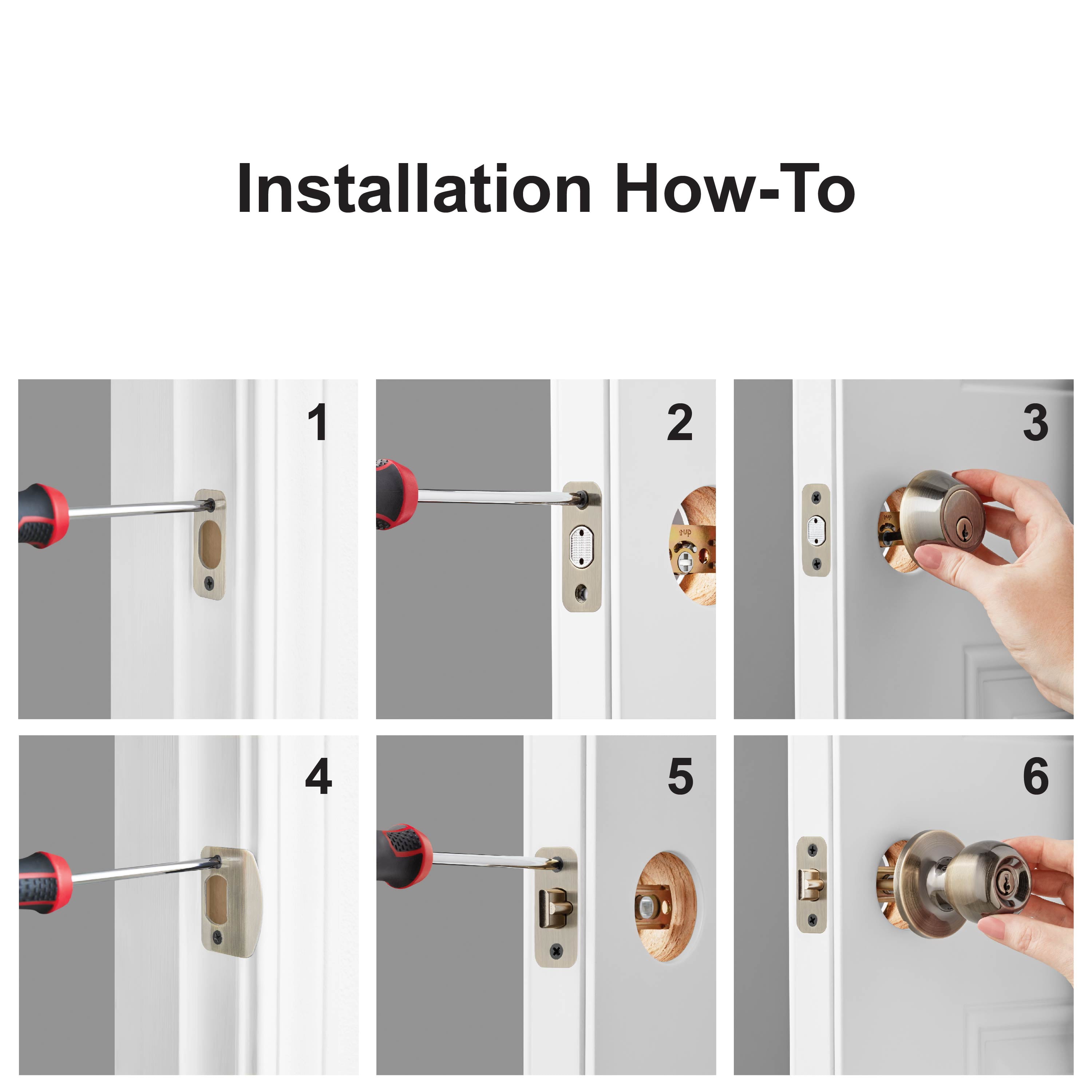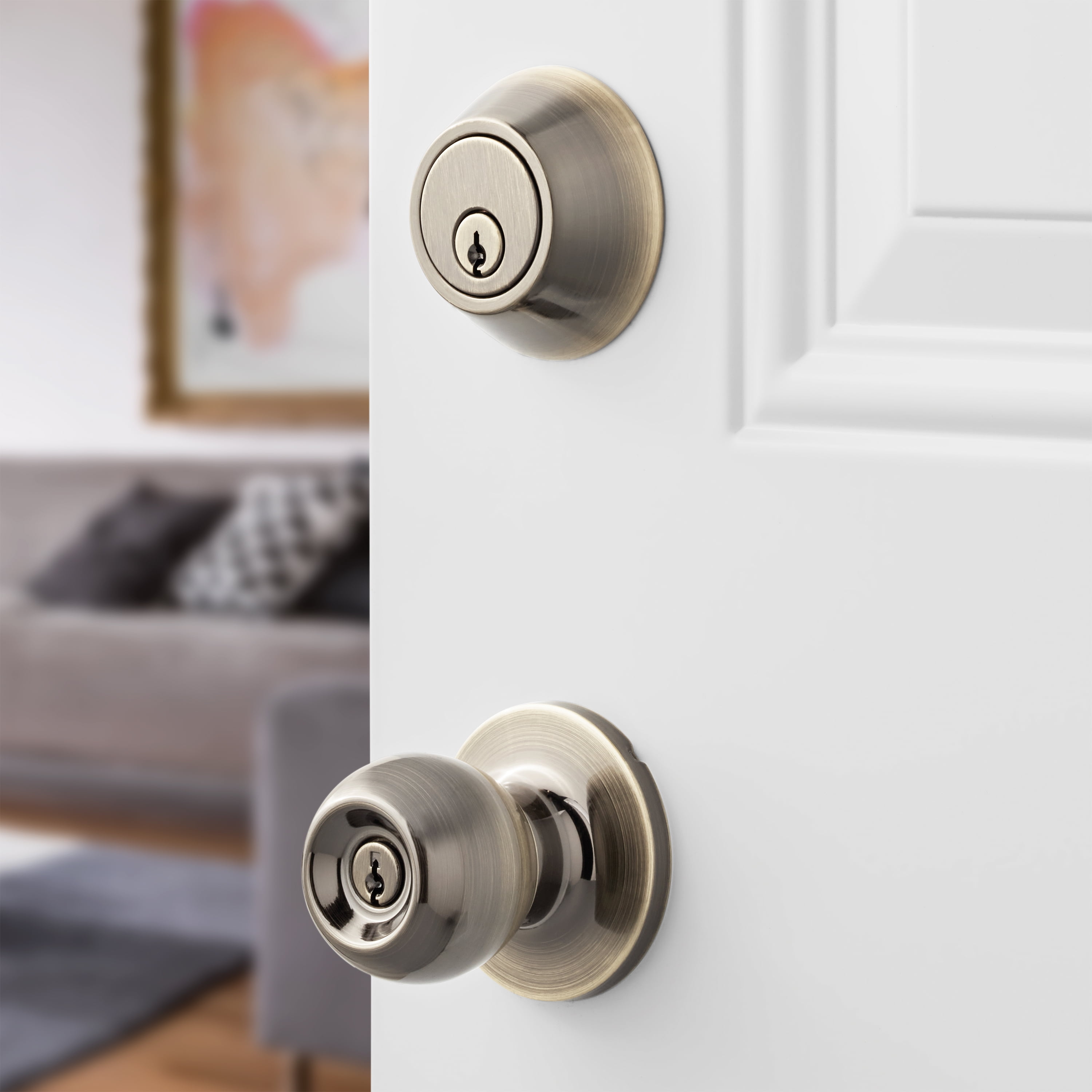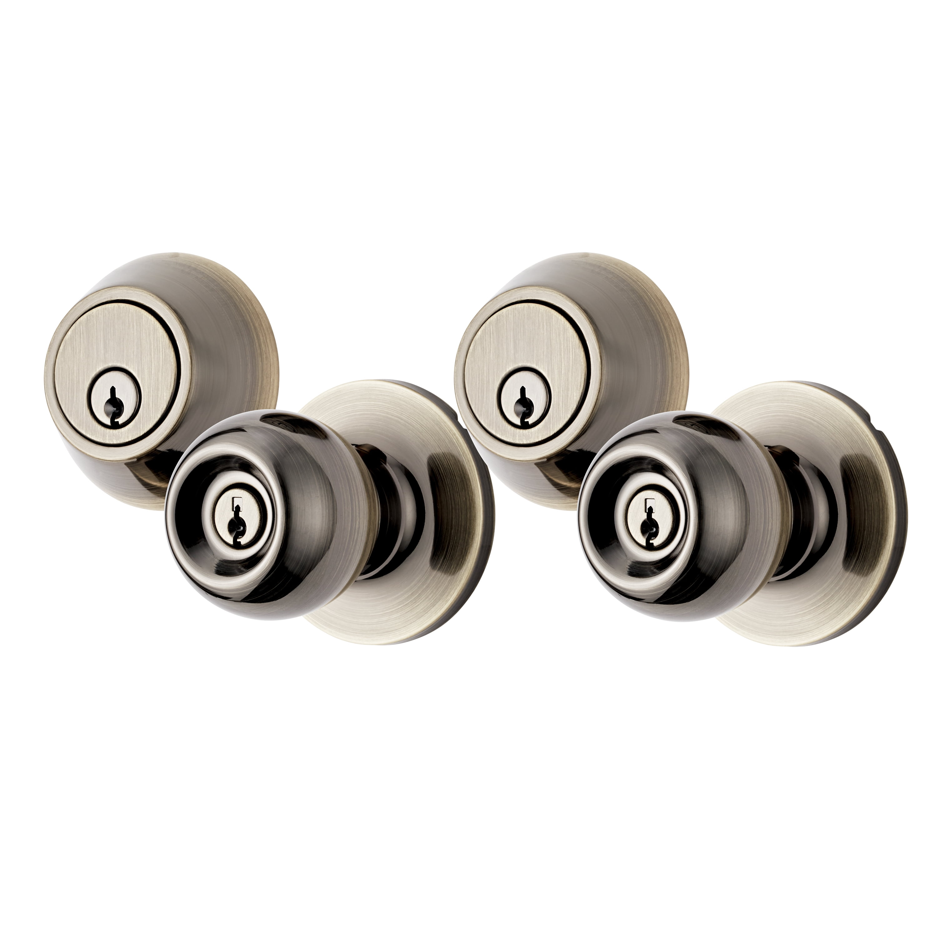 Comprehensive Security Door Locks Kit: The Hyper Tough Locking Ball Security Kit includes two entry door knobs with lock and key and two single-cylinder deadbolts, offering four secure locking locations for enhanced protection. Ideal for front, back, garage, and side doors, this kit ensures that all entry points of your home are well-protected by reliable door locks with keys. Keyed Alike Convenience: All door locks in this kit are keyed alike, meaning one key can operate all four locking latches. With eight keys included, you have multiple access options while maintaining a streamlined security system with your locking door knob. Stylish Antique Brass Finish: The door lock’s warm Antique Brass finish adds a touch of elegance to your doors, seamlessly complementing modern, traditional, and craftsman-style homes. This finish not only enhances your home’s appearance but also offers durability against wear for your door knobs with lock and key. Easy Installation: The door knobs and deadbolts are designed for easy installation with predrilled holes and require only a screwdriver. This user-friendly design allows for a quick and straightforward setup, making it perfect for both DIY enthusiasts and professional installers, ensuring your door locks are set up efficiently. Durable and Reliable Door Locks: Weighing 3.35 lbs., the Hyper Tough door locks kit is built to withstand frequent use and maintain its functionality over time. This robust construction ensures long-lasting durability and dependable performance for securing your home with reliable door knobs with lock and key.