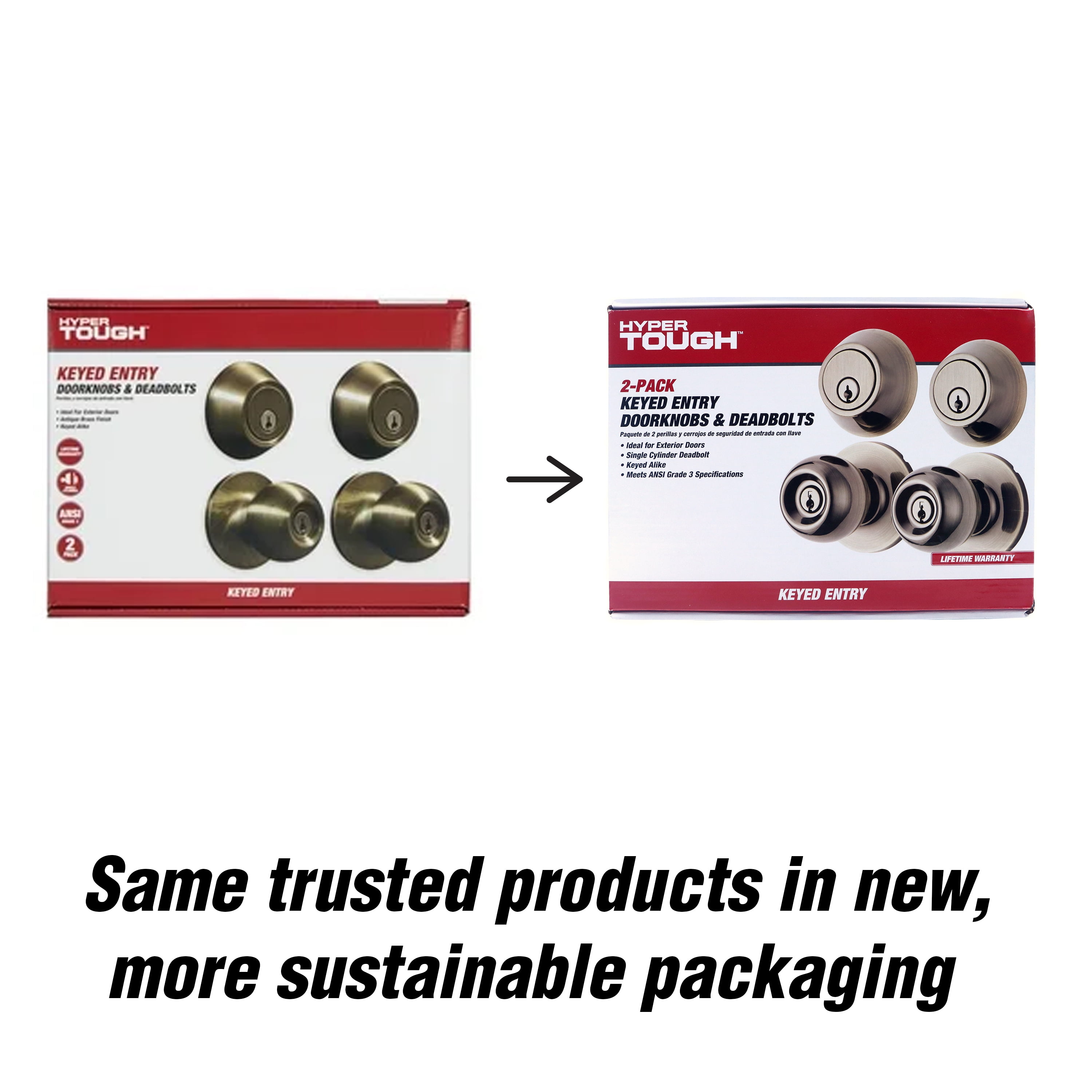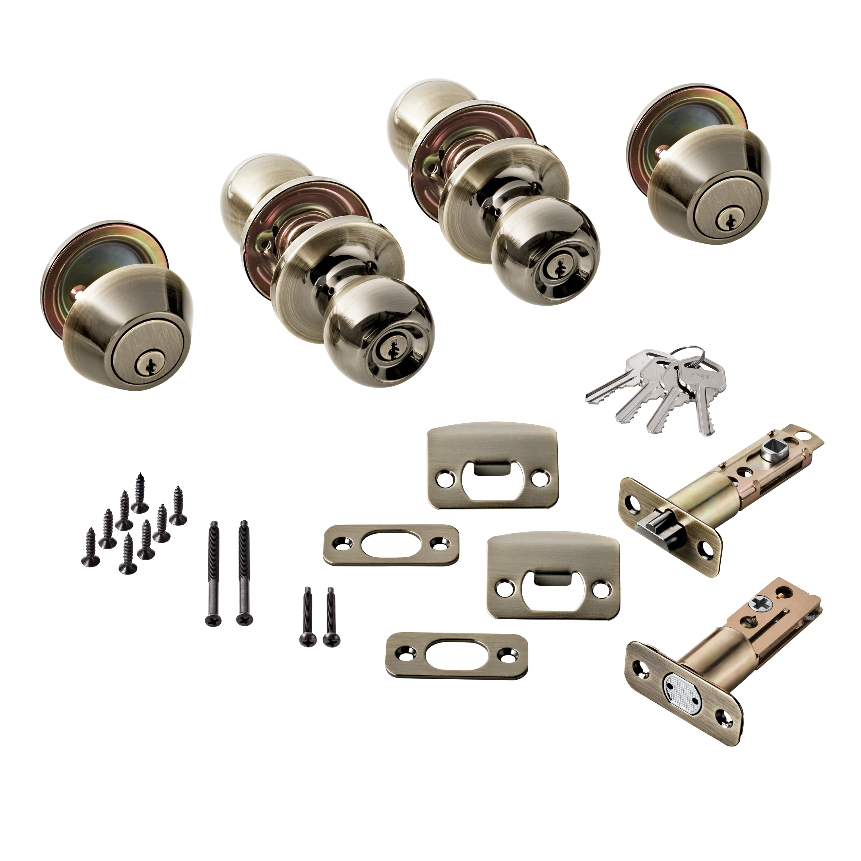 Enhance the security of your home with the Hyper Tough Locking Ball Security Kit, which includes two entry door knobs with lock and key and two single-cylinder deadbolts, providing four locking locations for comprehensive protection. This versatile door lock kit is perfect for securing your front, back, garage, and side doors. The door knobs with lock and key and deadbolts feature a Matte Antique Brass, making them a stylish choice that complements modern, traditional, and craftsman-style homes. Each of these door locks is keyed alike, meaning one key fits all four locking latches for added convenience. The installation process is straightforward, with predrilled holes requiring only a screwdriver. With eight keys included, you have plenty of access options for your household. The Hyper Tough Locking Ball Security Kit ensures your doors are securely locked with minimal hassle. The door locks with keys and deadbolt in this kit are designed to offer durability and reliability, enhancing the safety and aesthetic appeal of your home’s entry points. Trust these door knobs with lock and key to provide robust security while maintaining an elegant look backed by a build that withstands frequent use.