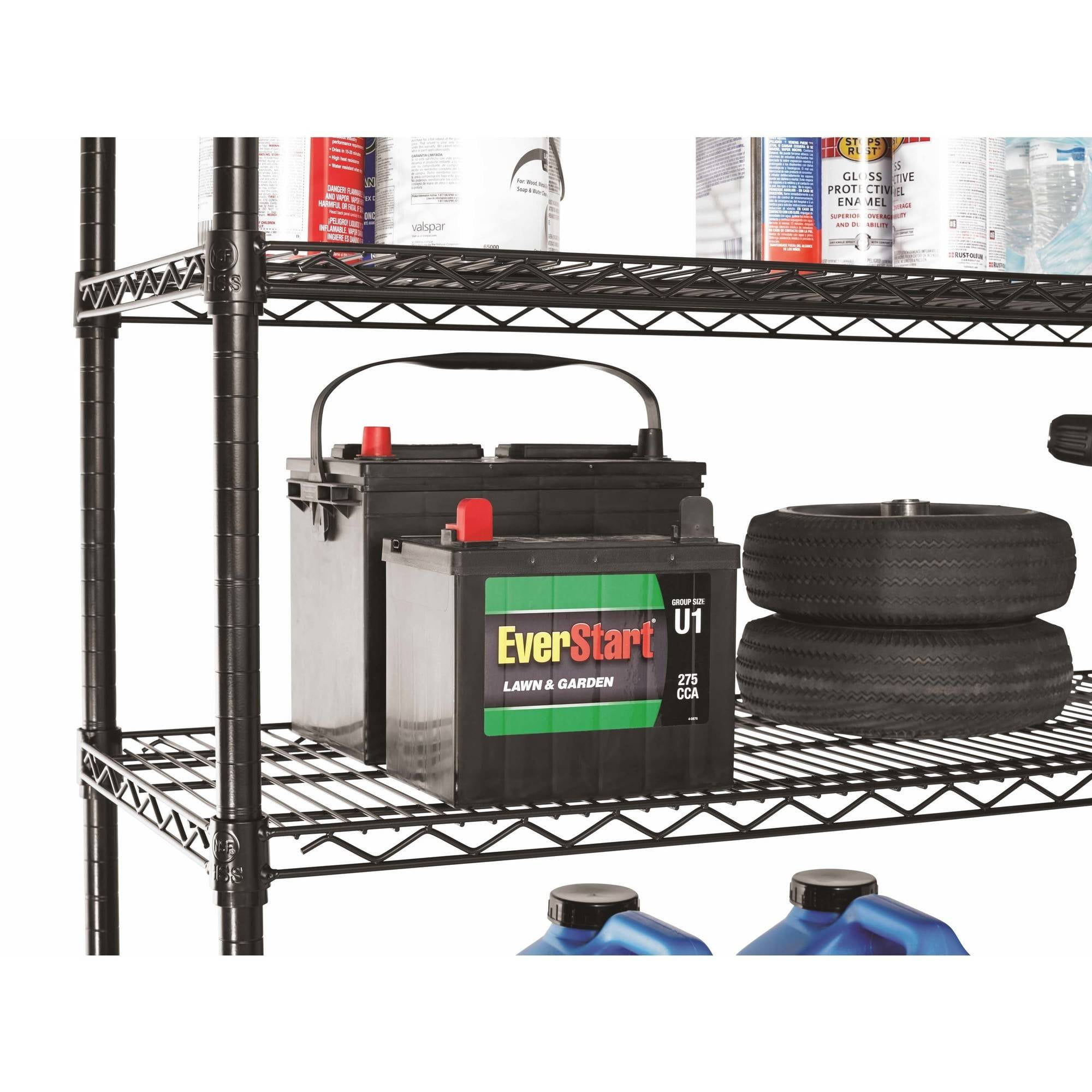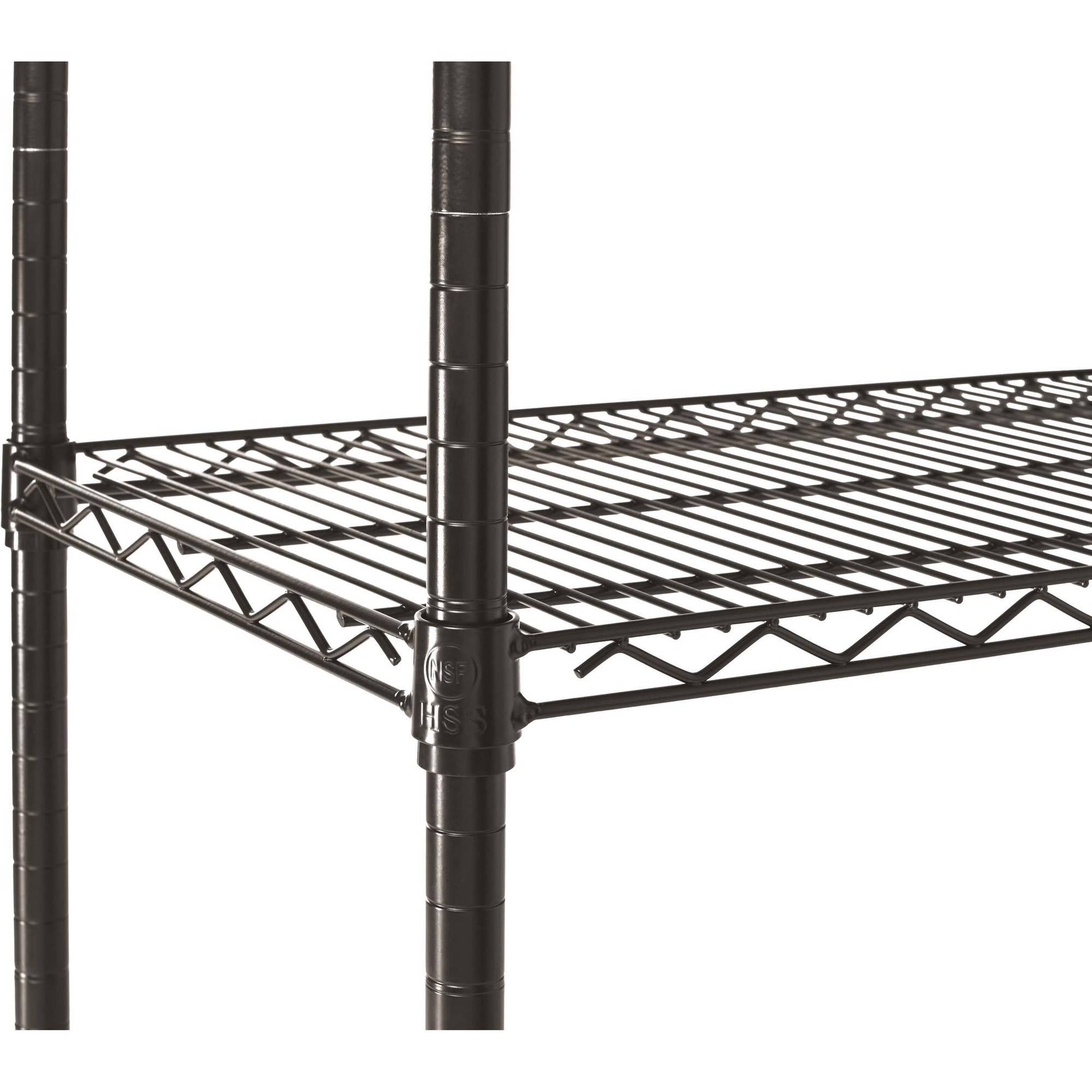 Strong and durable welded wire construction Black color Easy assembly with no tools required Shelves adjust in 1 in. increments Adjustable feet levelers for uneven floors Assembled size: 16 in D x 48 in W x 72 in H Weight capacity per shelf: 600 lbs evenly distributed Total unit loading capacity: 3000 lbs NSF certified for dry storage application 5-year limited warranty Age group adult Customer service: 866-375-7994 or [email protected] For product replacement parts contact customer service at 866-375-7994 Monday- Friday 9 am – 5 pm EST. or email: [email protected]