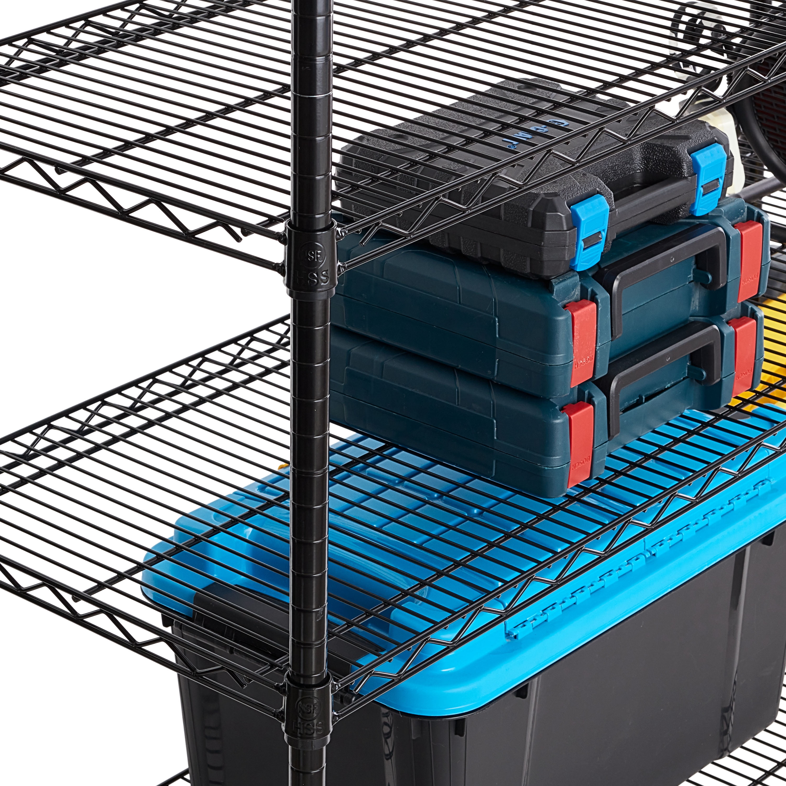 The Hyper Tough 6-Shelf Heavy Duty Wire Shelf Unit is ideal for industrial and commercial use. It has strong and durable welded wire construction in black color. Open wire design allows air circulation and reduces dust build-up. NSF certified for dry environment and comes with a five-year limited warranty. Shelves can be adjusted in 1-inch increments and can hold up to 600 pounds evenly distributed. The adjustable feet levelers help make it easier to place on uneven flooring while keeping the shelf level and stable. It is designed for adult use. This wire shelving system is perfect for homes, offices, warehouses and any other places you need to organize. Check out other Hyper Tough products like socket sets, trimmer line, toolboxes, drills, drivers, and more. Keep your space organized with the Hyper Tough 6-Shelf Heavy Duty Wire Shelf Unit.