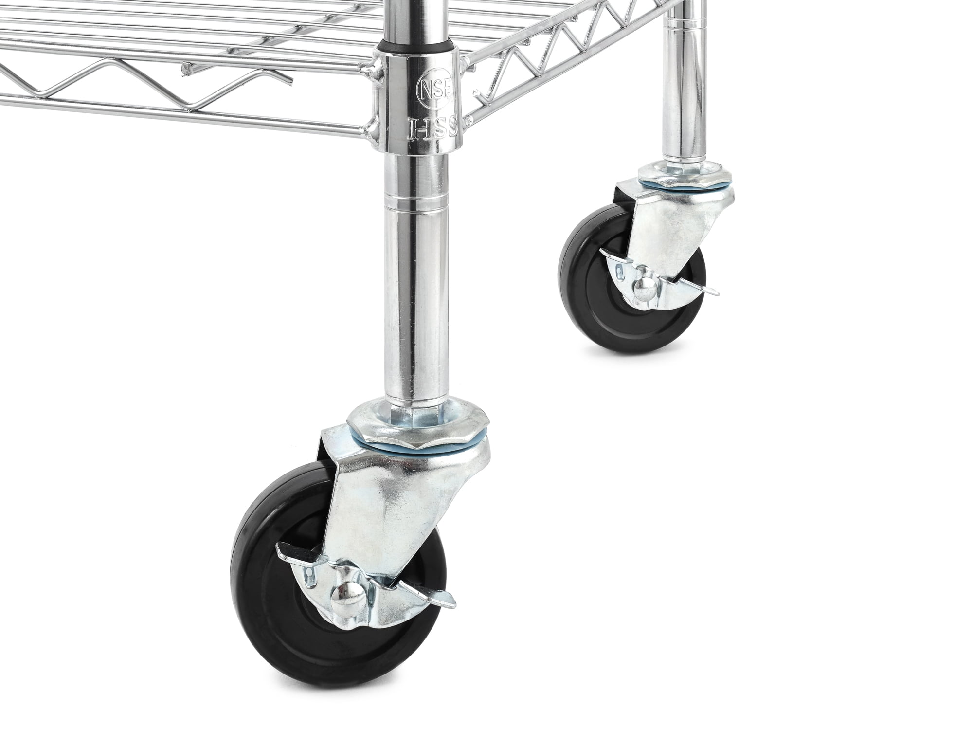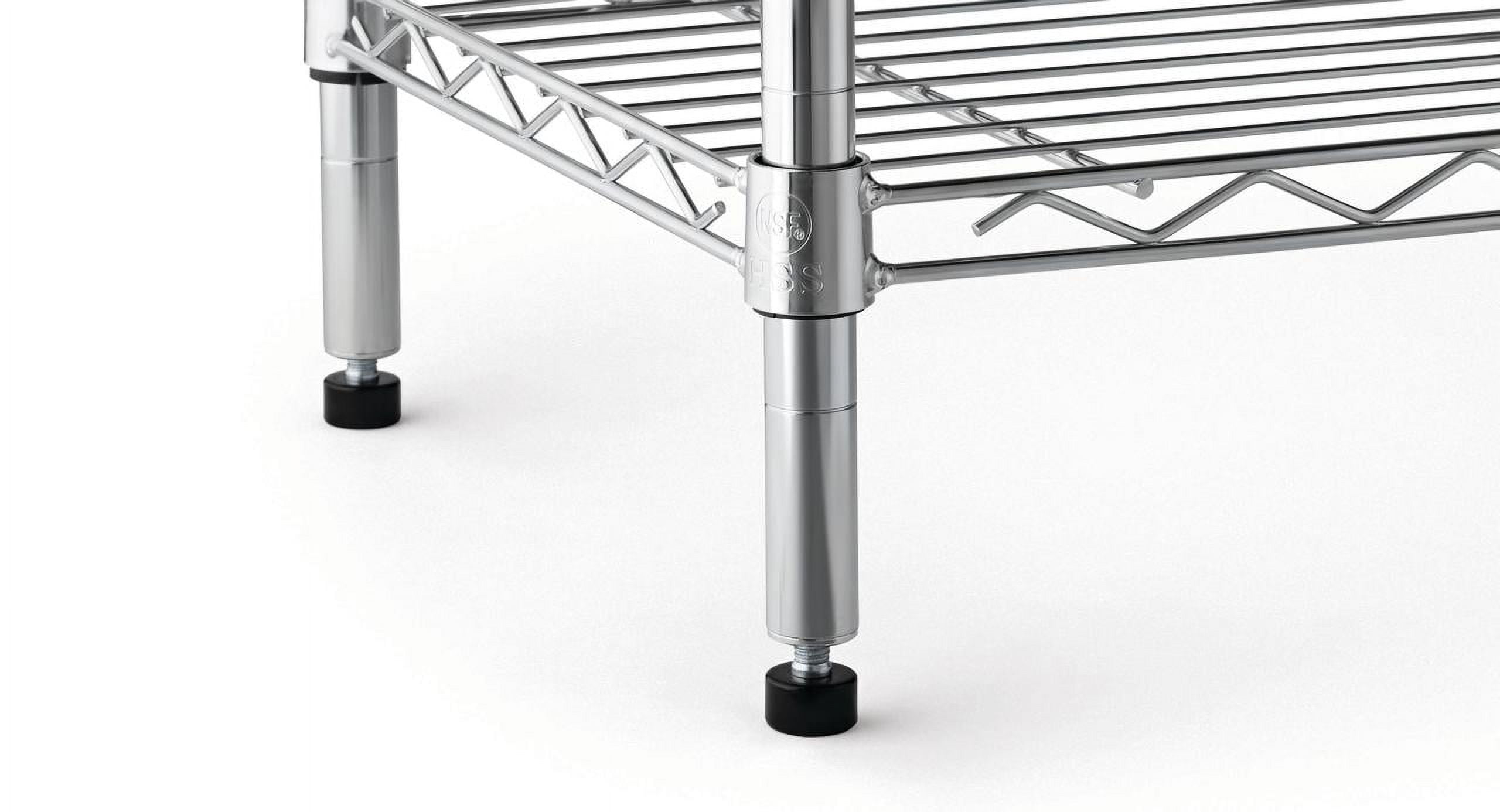 Commercial grade steel construction Easy assembly with no tools required Chrome color 4 heavy-duty shelves (18″x48″) Shelves adjust in 1″ increments Includes one set 3″ casters with 2 locking wheel Includes 4 pcs adjustable foot levelers for uneven floors Includes 4 pcs shelf liners to prevent small items from falling through Assembled size: 18″Dx48″Wx72″H with feet levelers, Assembled size: 18″Dx48″Wx75″H with casters Weight capacity on casters (evenly distributed): 500 lbs total (125 lbs per shelf) Weight capacity on feet levelers (evenly distributed): 2400 lbs total (600 lbs per shelf) NSF certified for dry environment Model#4T1848Z Age group adult Customer service: 866-375-7994 or [email protected] For product replacement parts contact customer service at 866-375-7994 Monday- Friday 9 am – 5 pm EST. or email: [email protected]