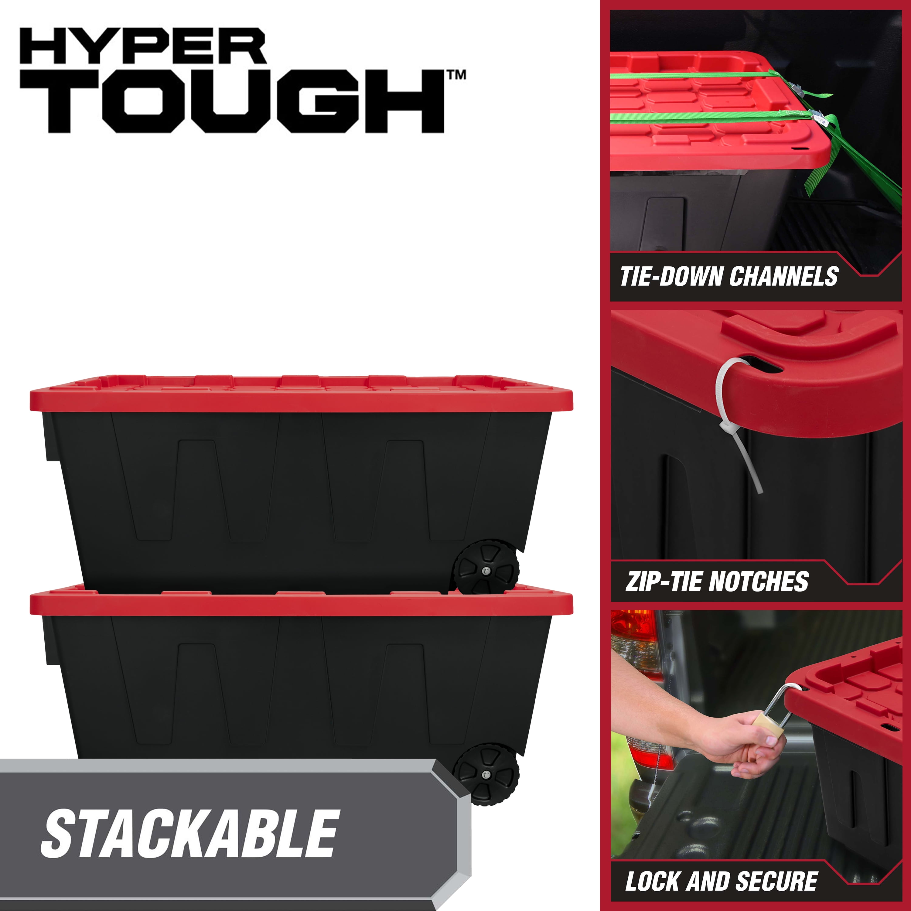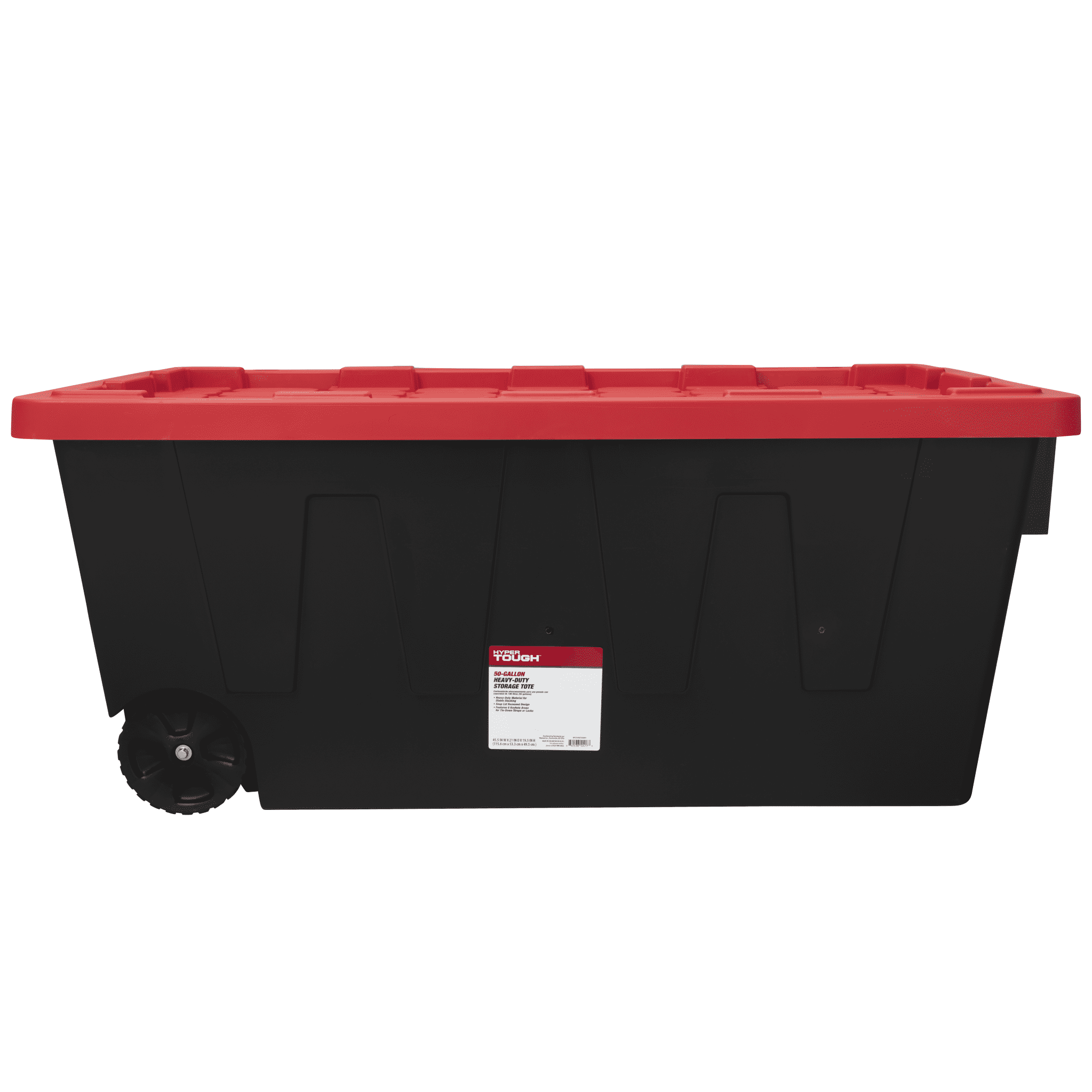 Hyper Tough 50 Gallon Extra Large Storage Bin with Snap Lid and Wheels, Black and Red, Heavy Duty Plastic Storage Container