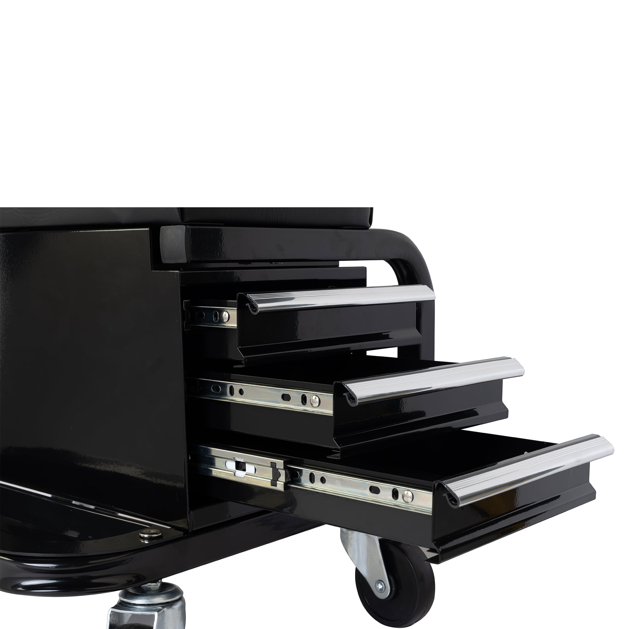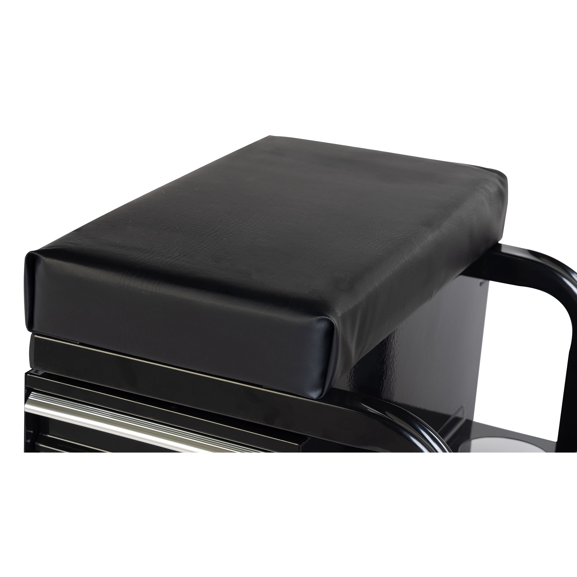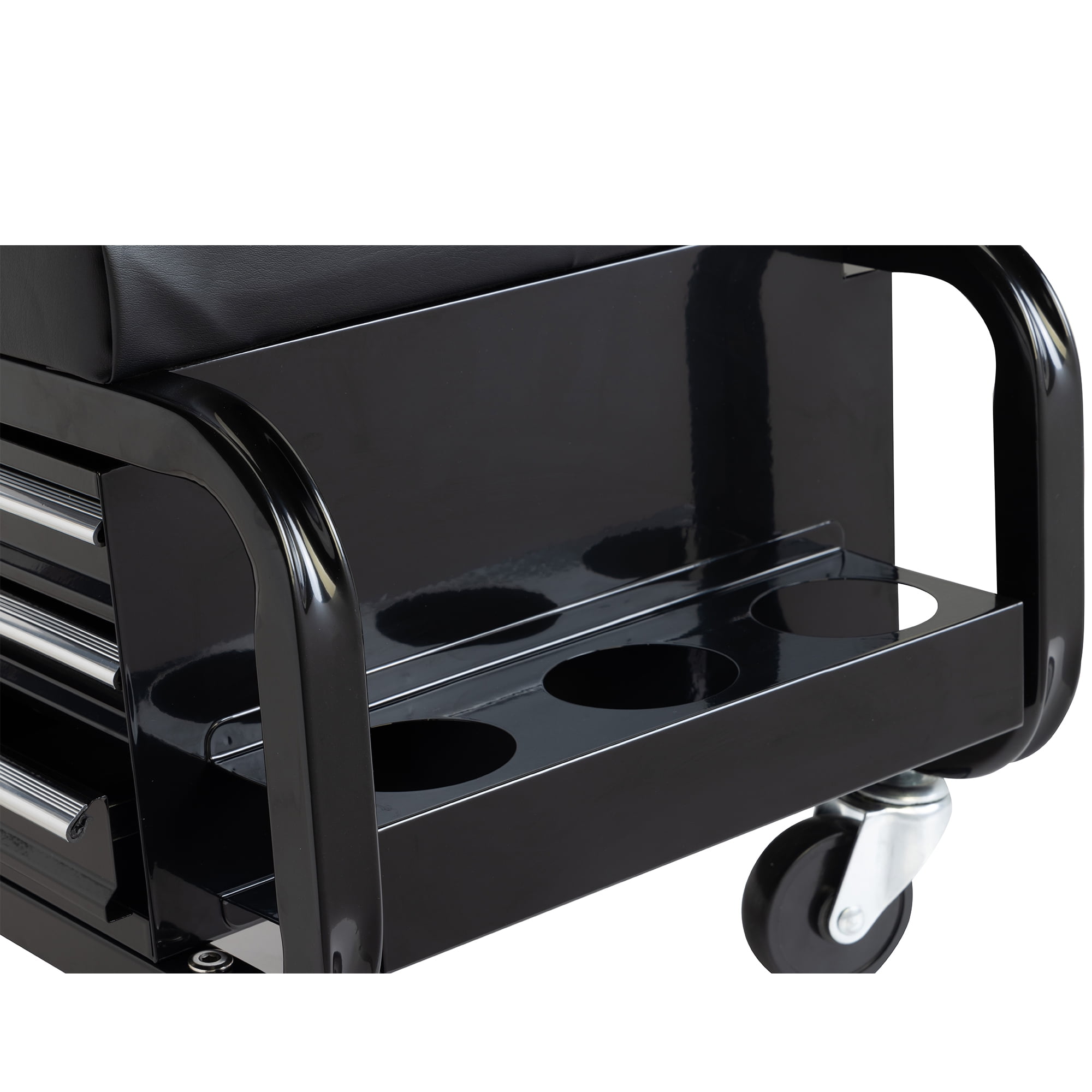 Hyper Tough Features 3-Side Drawers, 2-Bottle Holder Shelf and 1 Rear Tool Tray. This versatile seat features 3 tool drawers, equipped with a fully padded vinyl-lined seat and 4 swivel casters, providing a comfortable workspace while servicing as a convenient storage solution. Constructed with heavy-duty steel, this rolling seat offers additional stability and durability, supports up to 350 lbs. Features a soft, fully padded seat cushion designed for all-day use. Designed with four 3 inches diameter polyurethane and oil-resistant full-bearing casters, allowing effortless 360-degree movement across rough floors. This smooth maneuverability ensures easy mobility in garages, shops, or any other workspace.