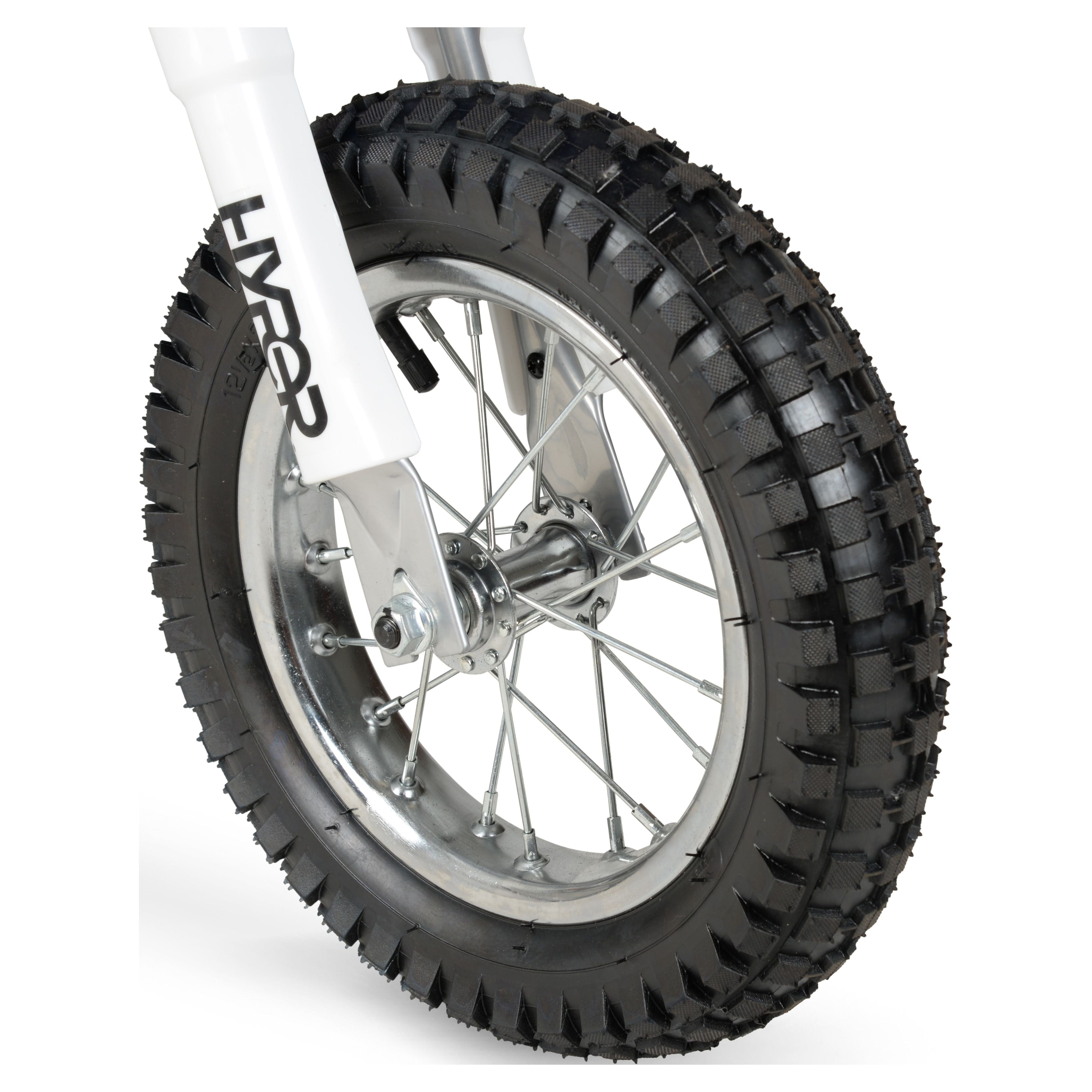 Sturdy steel-framed, electric-powered motorcycle for boys and girls ages 13+ years Designed with triple-clamp-style adjustable handlebars and real, pneumatic, knobby dirt bike tires Features an easy, single-speed, twist-grip accelerator Provides 24 volts of fun 40-minute run time and a 12-hour charging time after first use, then 8-hour charging time after further use Offers a maximum speed of 14 mph Electric scooter with seat supports child weight up to 140 lbs Hyper Brand